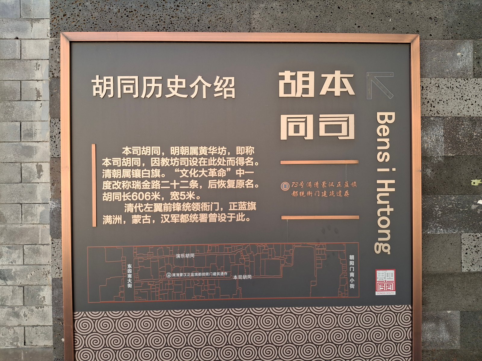Układ ulic przypomina nowojorską szachownicę – wynika to z faktu, że Hutongi stanowią zabudowania wokół wewnętrznego dziedzińca – w kwadracie lub prostokącie, często z drzewem po środku – u nas jest widoczne przez okno w kuchni. Wejścia do budowli typowo są od południowej strony, by złapać jak najwięcej słońca.