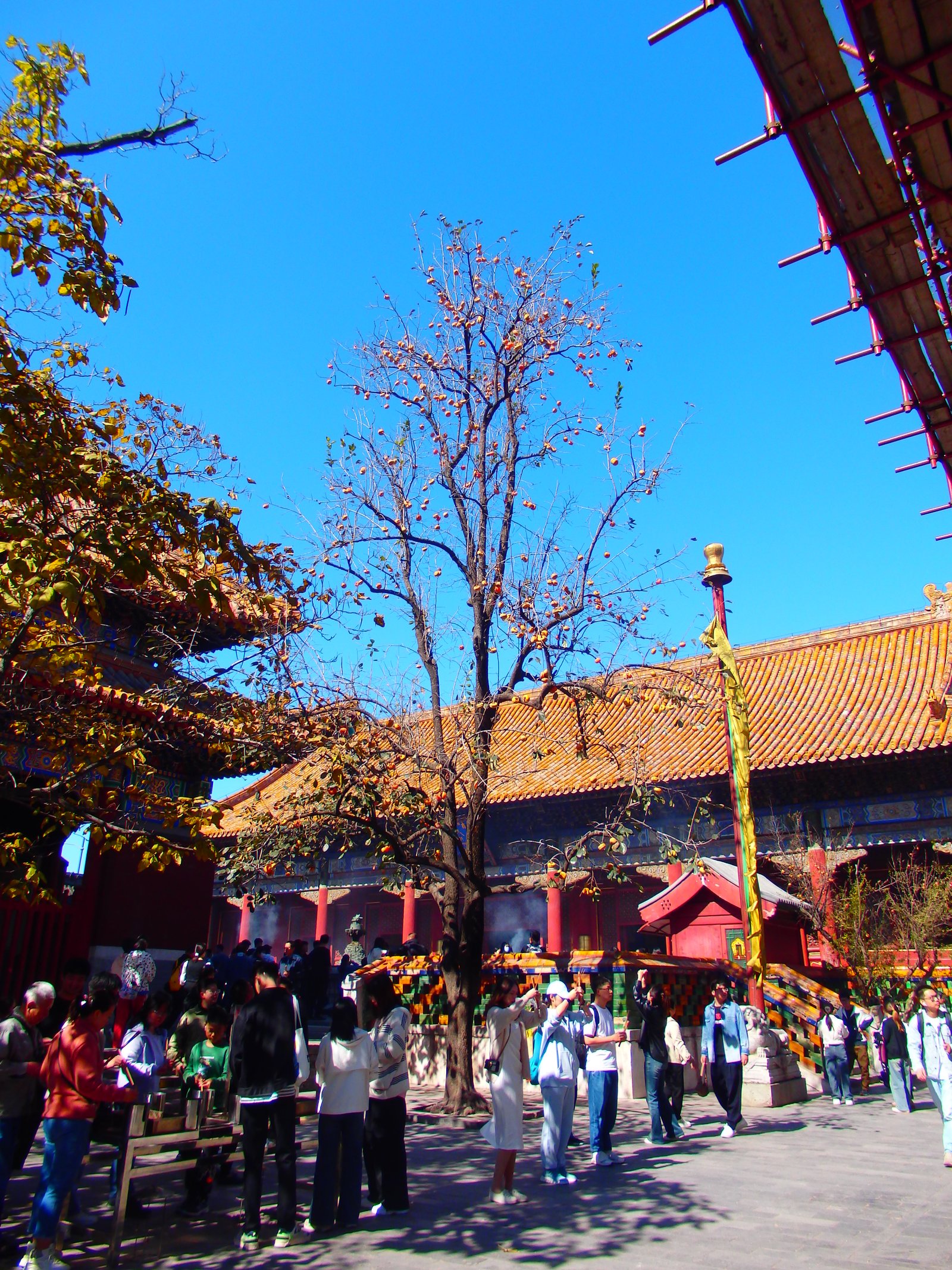 Takie określenie od żony mej (tu Adam!) zdecydowanie pasuje do tego miasta, szczególnie o tej porze roku. Na drzewach dojrzałe brzoskwinie – szczególnie widoczne, bo liście już opadły, a owoce jeszcze wiszą, niczym na zbyt długo nie rozbieranej choince. Niektóre drzewa już przybrały barwy jesieni, zaś zachodzące słońce przebijające się przez aurę smogu, dorzuca pomarańczowego koloru do tej mieszanki.