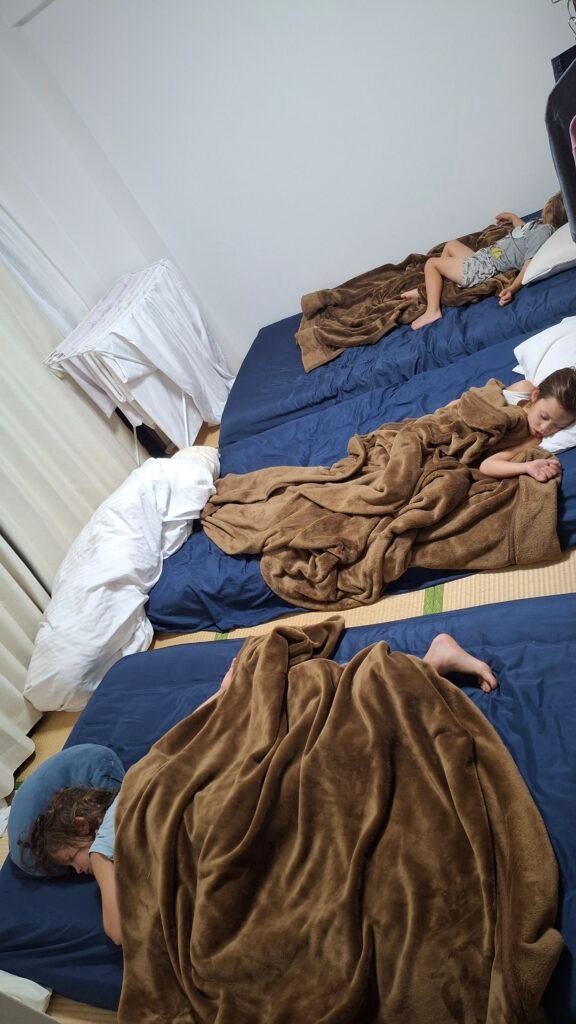Japonia przywitała nas… niezbyt miło. Na trudność przybycia nałożyło się kilka czynników. Zacznijmy od tego, że nasz lot trwał prawie dobę. Mieliśmy przesiadkę w Hong-Kongu, który początkowo planowaliśmy pozwiedzać w przerwie pomiędzy lotami. Baltazar jednak uznał, że on nie będzie spał w samolocie, więc po wylądowaniu – mówiąc krótko – był rozbity i musieliśmy znaleźć miejsce na drzemkę i regenerację. Spędziliśmy więc na lotnisku 8 godzin, by następnie zapakować się na kolejne 6 godzin do samolotu. Wylądowaliśmy późnym wieczorem, więc wszyscy byliśmy wymięci, a jeszcze tak naprawdę nie wkroczyliśmy oficjalnie na terytorium wyspy.