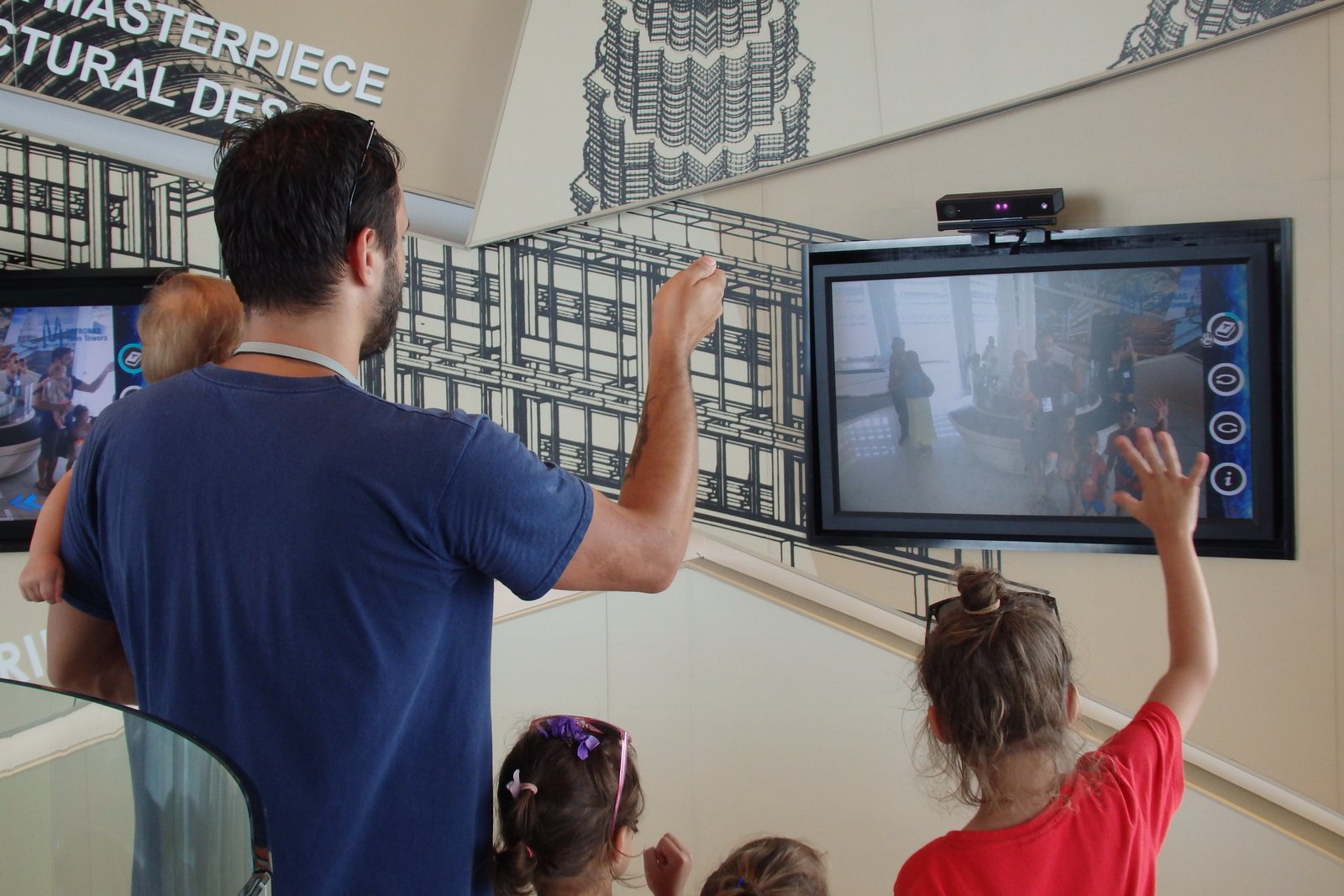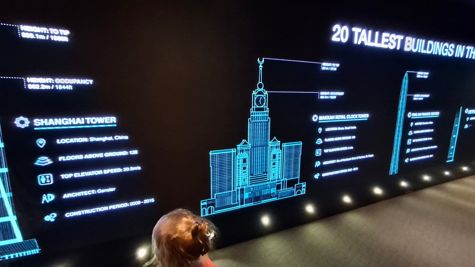 Zaraz po tym ruszyliśmy na samą górę, w okolice 80. piętra jednej z wież. Tam można było nie tylko podziwiać widoczki, lecz także spróbować swoich sił w obsłudze interaktywnego narzędzia (wystaw dłoń, na ekranie będzie wyglądało, jakbyś trzymał model dwóch wież, który to można sobie dowolnie obracać i czytać szczegóły) – spróbować, ponieważ działał ten sprzęt na zasadzie wykrywania osób za pomocą wizji, więc jak tylko ktoś spróbował tego użyć, to banda dzieciaków wpadających w kadr była zbyt dużym wyzwaniem dla systemu, który tym steruje.