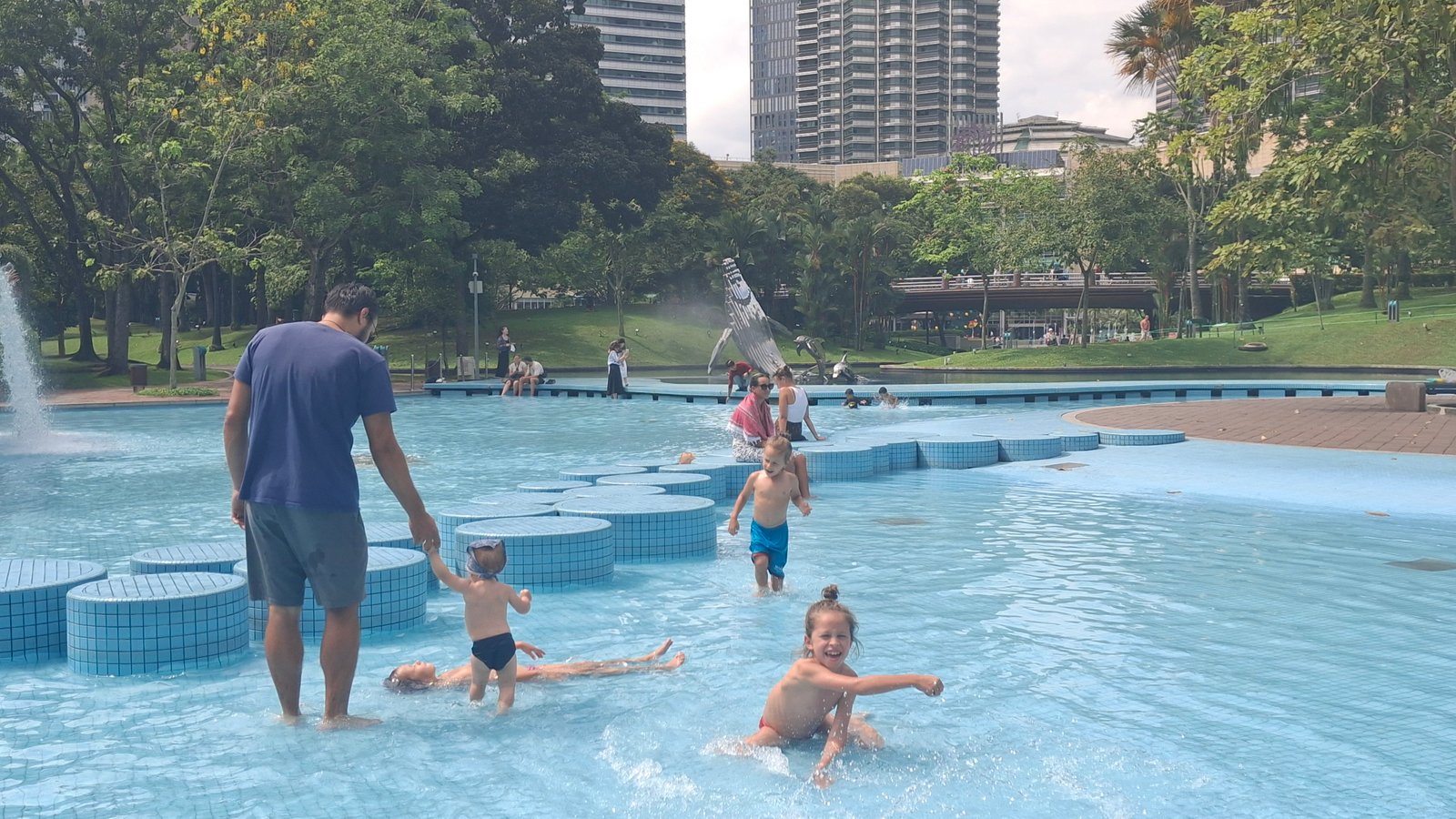 Mimo otoczenia wysokimi wieżowcami, park dawał możliwość zapomnienia, że jest się w wielkim mieście i pomagał w wytworzeniu pewnej idyllicznej atmosfery. Co tu dużo kryć – wszyscy się dobrze bawili. Było mokro, płytko, woda była ciepła i czysta, znalazł się cień pod drzewami i czyste łazienki.