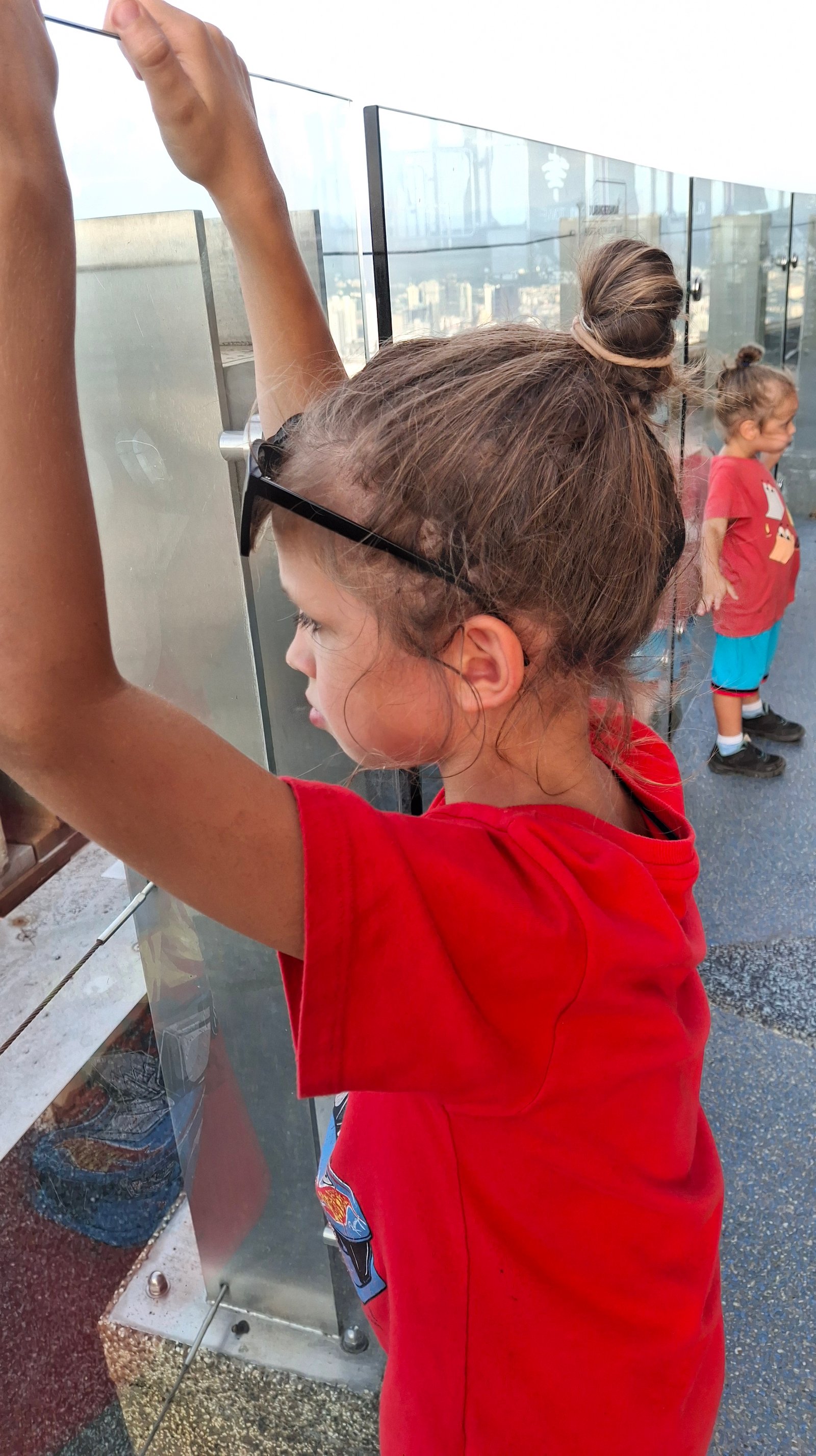 Najważniejsza atrakcja – szklany sześcian, podwieszany taras, Szklana pułapka (hehe) tzw. Sky Box. Taka podwieszona nad przepaścią konstrukcja ze szklaną podłogą, szklanymi ścianami i szklanym sufitem. Jedni powiedzą, że jest tak skonstruowany aby widoczność była niczym nie zakłócona, inni będą przekonani, iż ma Ona na cale wywołania zawału serca u jak największej liczby zwiedzających. Jak się możecie domyśleć Niebieska pozwoliła postawić stopę na tej podłodze, lecz nie za dużo więcej. Dzieci z kolei nie wyraziły żadnego strachu (no może Tamara, aczkolwiek ona mogła krzyczeć z faktu, że nie jest na rękach mamusi), więc mogliśmy zrobić sobie piękne zdjęcia. Czas na zdjęcia wynosi 45 sekund – najpewniej wynika to z faktu, że przy większym obłożeniu, jakoś ruch musi być regulowany. Popędzano nas, chociaż nikt w kolejce za nami nie czekał.