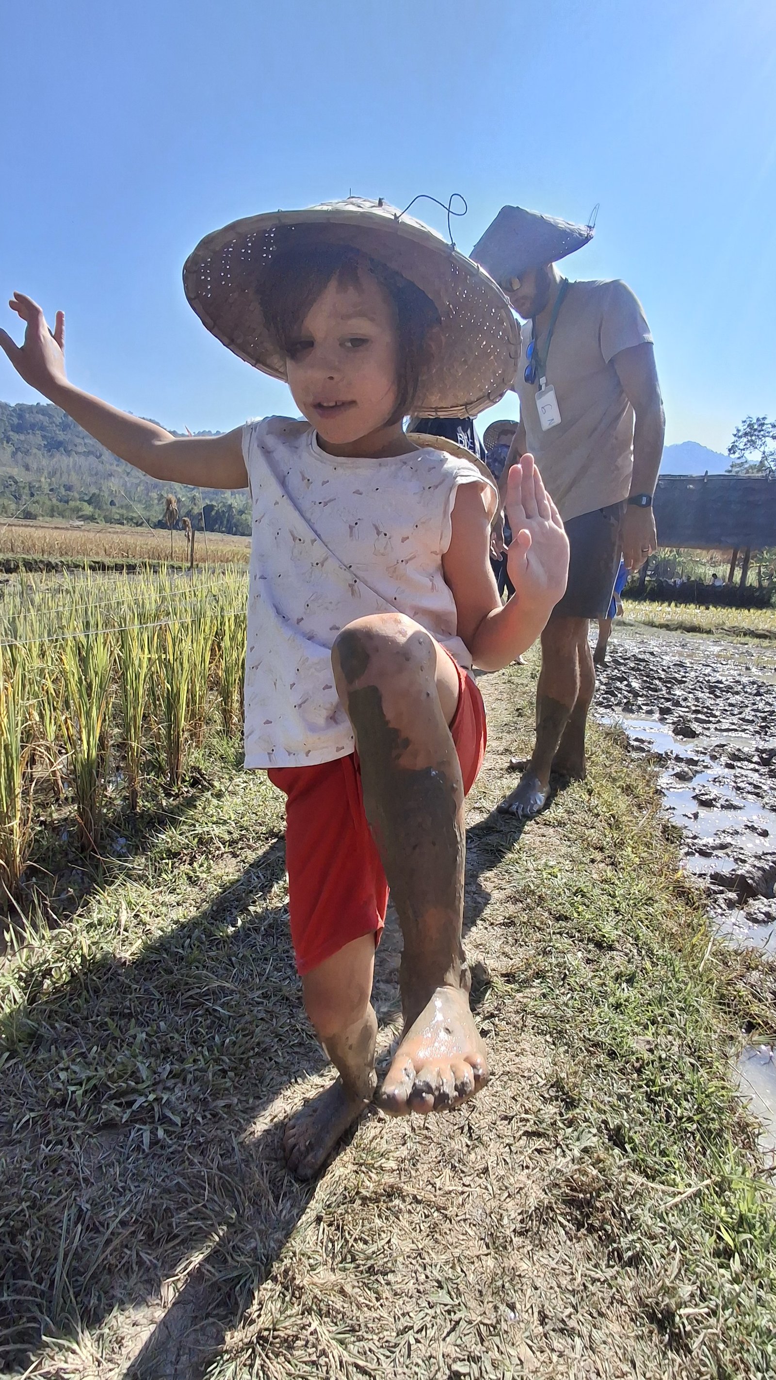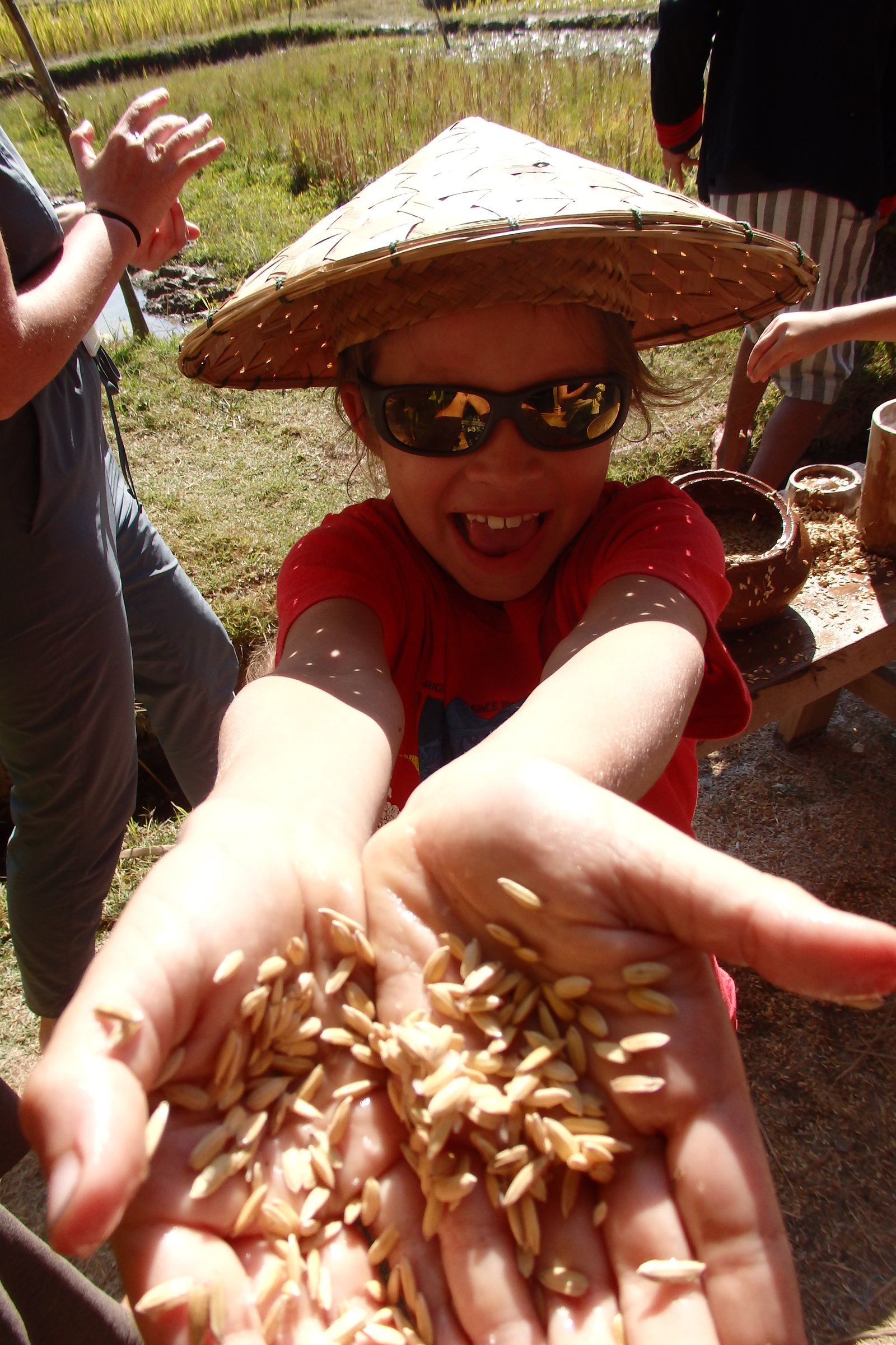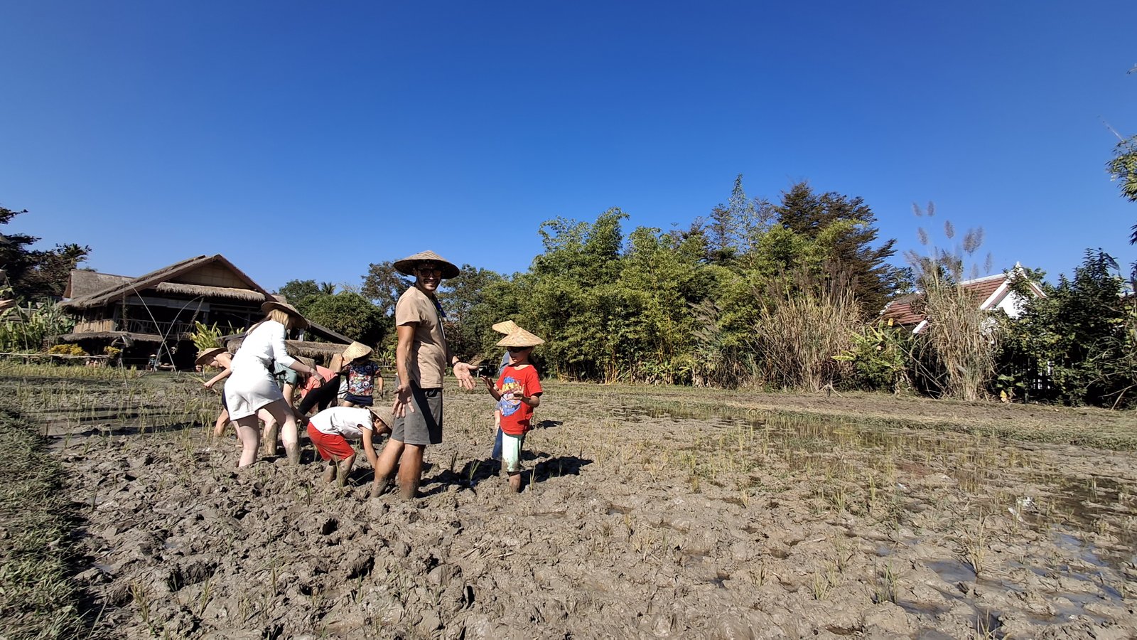 Laos oferuje bardzo dużo w aktywnościach, jakie człowiek może powziąć podczas wizyty. Zrozumiałe, że mając na pokładzie 4 małolatów – niektóre od razu idą w odstawkę (aktywności, nie dzieci) – część zaś zależy od pogody. I właśnie niskie temperatury skłoniły nas do zrewidowania swoich planów i skorzystania z listy zapasowej. A na niej była jedna, z której można by skorzystać w którymkolwiek kraju w okolicy – no ale padło na Laos – wyprawa na farmę ryżu.