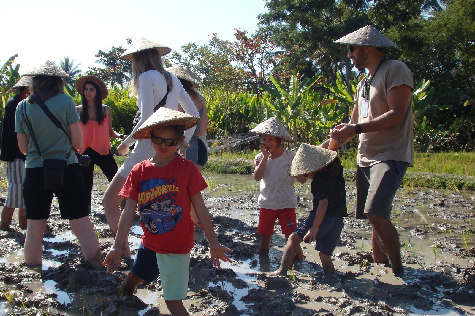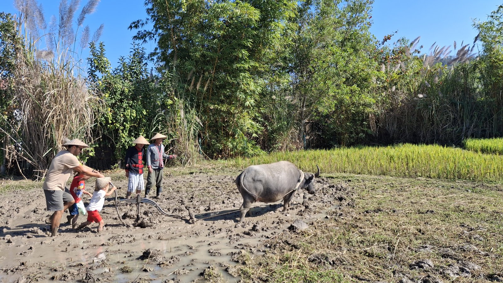 Dzieci początkowo bały się zbliżać – wszak Suzan (bo tak bawolicy na imię było), to kawał zwierza. Gdy jednak zobaczyli, że inni są gotowi podążyć za pługiem i nic im się nie stało – ruszyli ze mną w błoto. Tutaj teren był jeszcze bardziej wyzywający – głębokie bruzdy w ziemi, tempo narzucone przez zwierzę – to wszystko sprawiło, że prowadzenie pługa i trzymanie dwójki dzieci spowodowało wyhodowanie u mnie trzeciej ręki, którą z jakiegoś powodu nie widać na zdjęciach. Ale tam była – bo jak inaczej wytłumaczyć, że nikt nie zażył kąpieli błotnej?