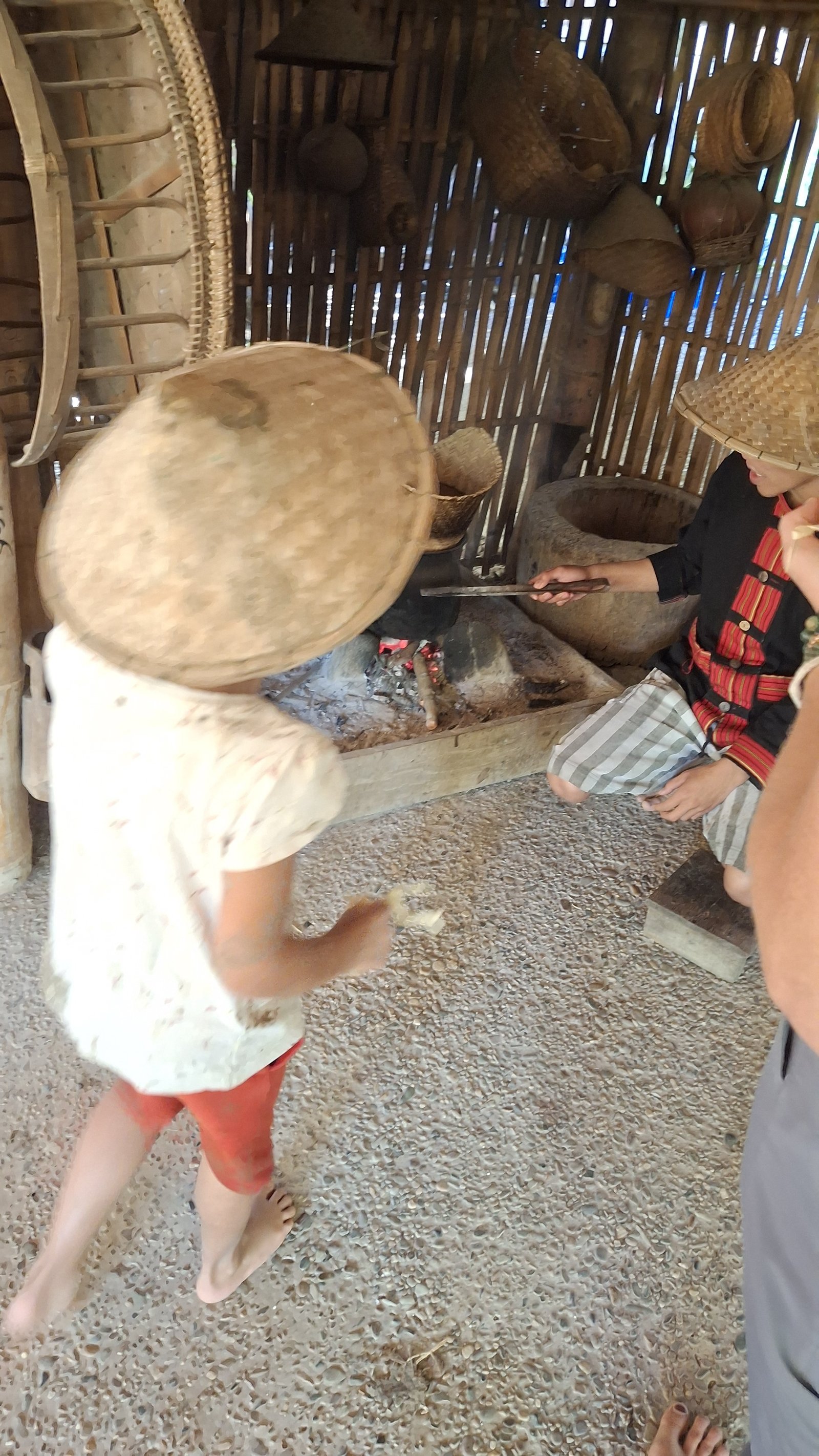 13. Ostatni etap to gotowanie ryżu. W pierwszym kroku należy ryż namoczyć. A później następuje gotowanie – ale tylko i wyłącznie na parze! Zatem specjalne sitko z traw jest włożone do kociołka z wodą, gdzie następuje gotowanie. Potrawę z ryżu je się dwa razy dziennie – i ten ryż jest na tyle sycący, że porcja wystarcza na dzień pracy w polu. I na tyle lepki, że dzieci mogłyby spokojnie ulepić z tego ludki jak z plasteliny.