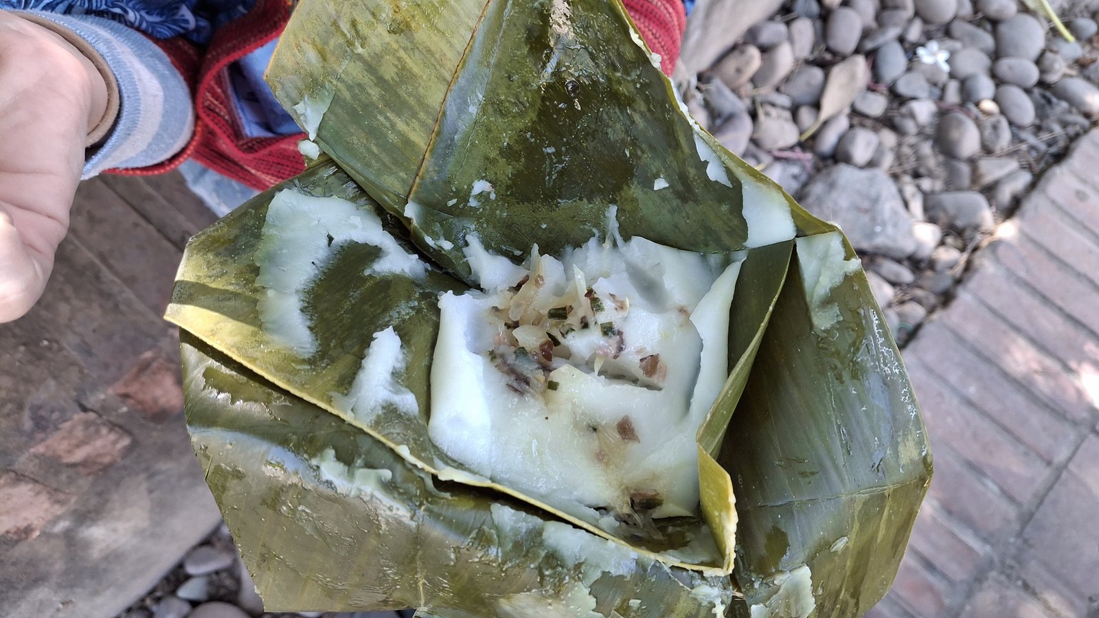 Ryżowy kleik z mięsem w bambusie – wprawdzie trafiliśmy na niego przypadkiem – poszukiwaliśmy wersji ryby w liściu bambusowym – ale mimo iż brzmi to obrzydliwie, to miało wiele smaku. Konsystencja przypomina budyń, więc dla wielu byłoby powodem by powiedzieć „nie” – ale warto czasem wyjść poza swoją strefę komfortu. Smakowało wszystkich członkom ba(t)mana (Tamara nie próbowała).