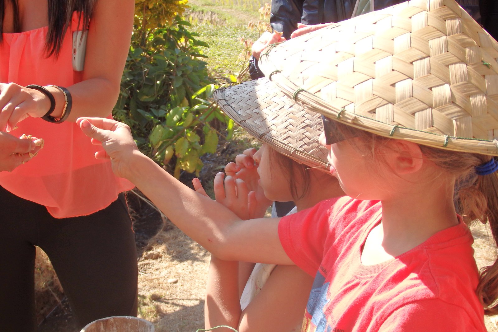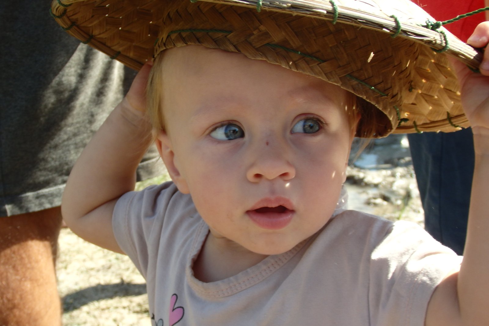 Dojechaliśmy na miejsce, gdzie mogliśmy sobie wybrać tradycyjne nakrycia głowy (mieli takie nawet w rozmiarach Tamary! Nasuwa się więc pytanie: czy takie maleństwa już też tam wysyłają w pole?). Tam dołączyliśmy do grupy innych turystów, których oprowadzać miał Johny (nawet miał napisane imię na swoim nakryciu głowy – co za cudowny sposób zastąpienia identyfikatorów w korporacjach).