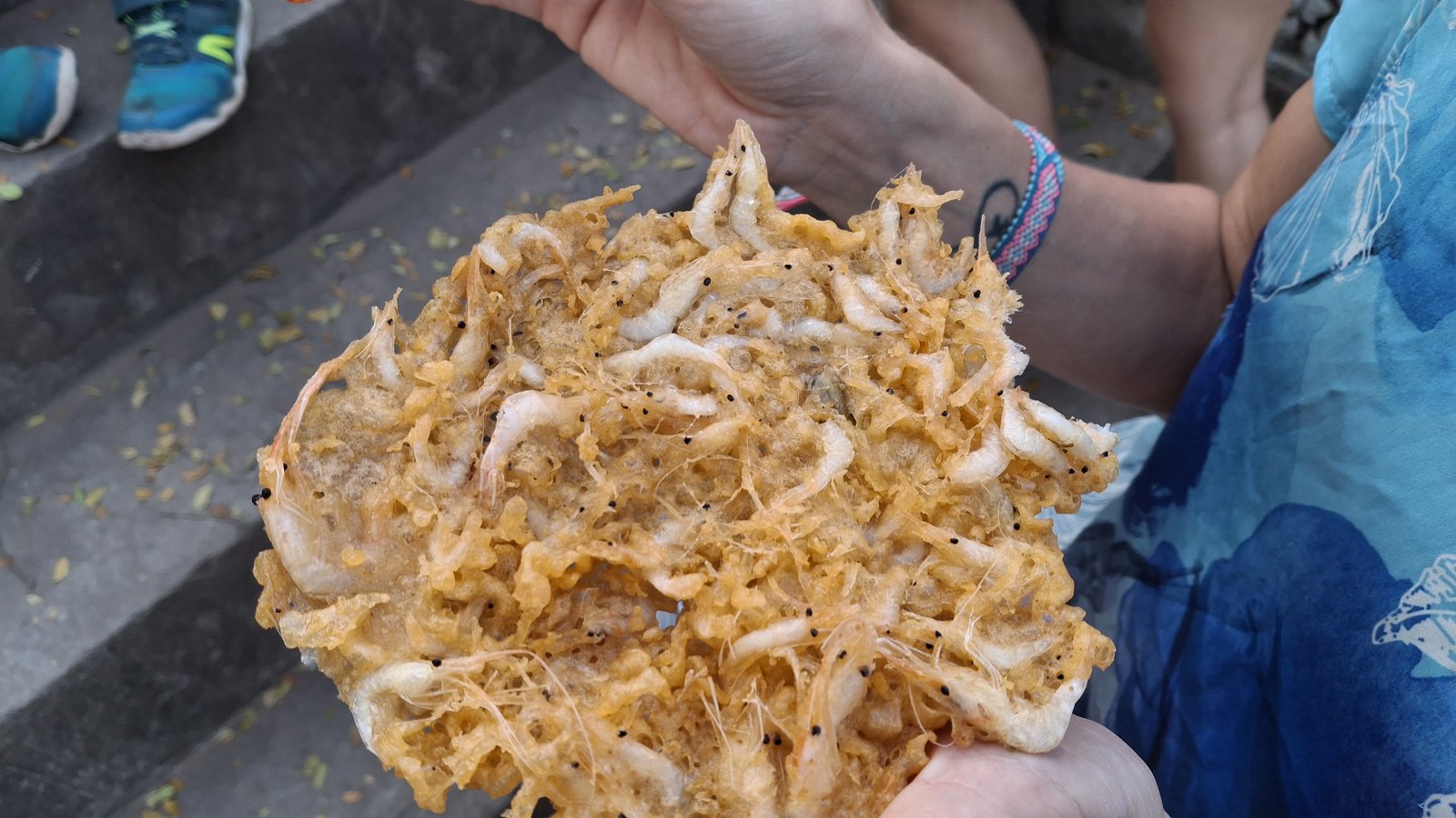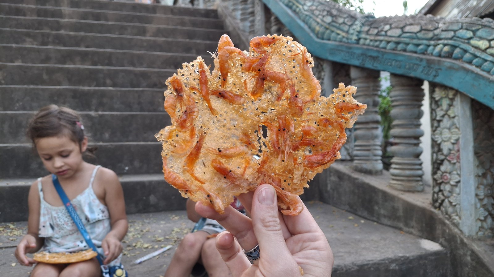 Dojechaliśmy na miejsce już trochę głodni, planowaliśmy złapać na miejscu jakiegoś fast-fooda po kambodżańsku. Pełni nadziei zaczęliśmy oglądać stanowiska przed wejściem na szczyt. A tak, na szczycie jest świątynia i ruiny i mnisi, więc odwiedzających nie brakuje. Jednak stanowisko, za stanowiskiem, jedyne co widzieliśmy, to jedna, czy druga forma smażonych kiełbasek. A przypominamy, że Azjaci nie wiedzą jak się robi kiełbasę. Zniesmaczeni i coraz głodniejsi rozglądaliśmy się za czymś do jedzenia – i w końcu nasze oczy natrafiły na inne oczy… dużo oczów – tyle oczów, że wygląda jak kawałki pieprzu. Oto smażone krewetki w postaci… placuszka? Wygląda to (i tak zapewne jest) jak dużo malutkich krewetek wrzuconych na patelnię z jakąś masą mączną. Głęboki tłuszcz skleił to wszystko skutecznie i oto On – placuszek pełen małych, czarnych oczu i wystających niczym włosy czułek. Ale w smaku był niezły. Szczególnie jak się skropiło sokiem z limonki. Krótka porównawcza analiza dziecięca stanowi, że te białe są smaczniejsze niż te czerwone.