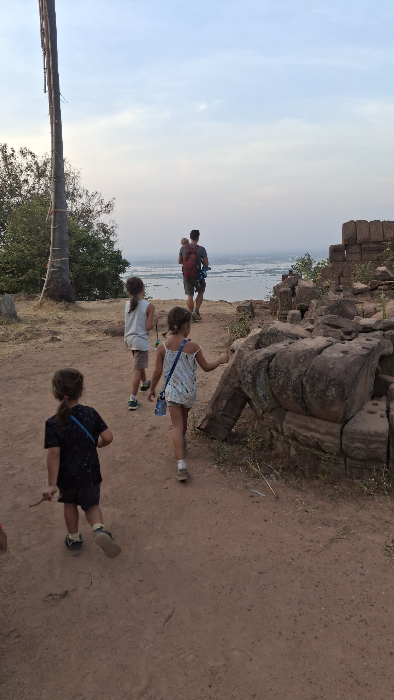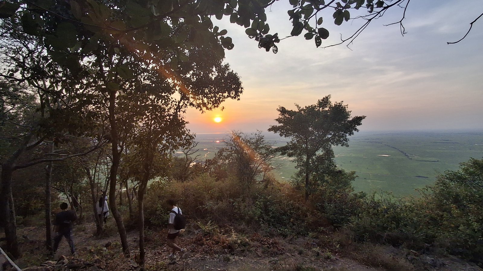 Dotarliśmy na szczyt i faktycznie, były tam ruiny i miejsca do oglądania zachodu. Niestety najlepsze miejsce jest trochę obrośnięte i widok bywa zasłonięty, ale wciąż było widać, jak słońce kładzie się spać nad Kambodżą. A wraz z tym procesem pojawia się te piękne niebo, wspomniane już w Kambodża – gdzie pieprz rośnie.