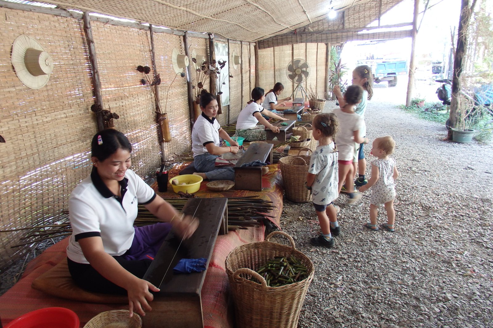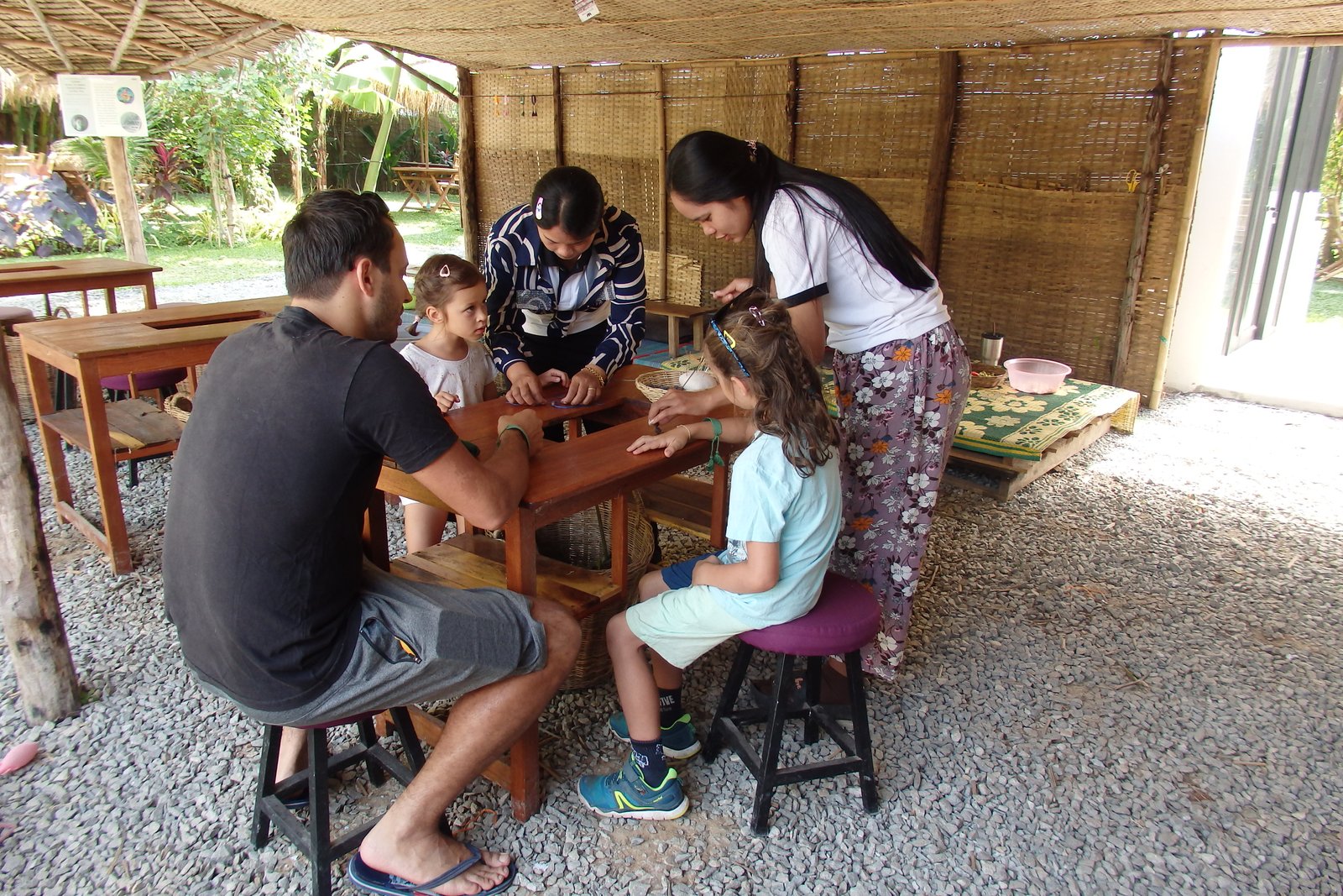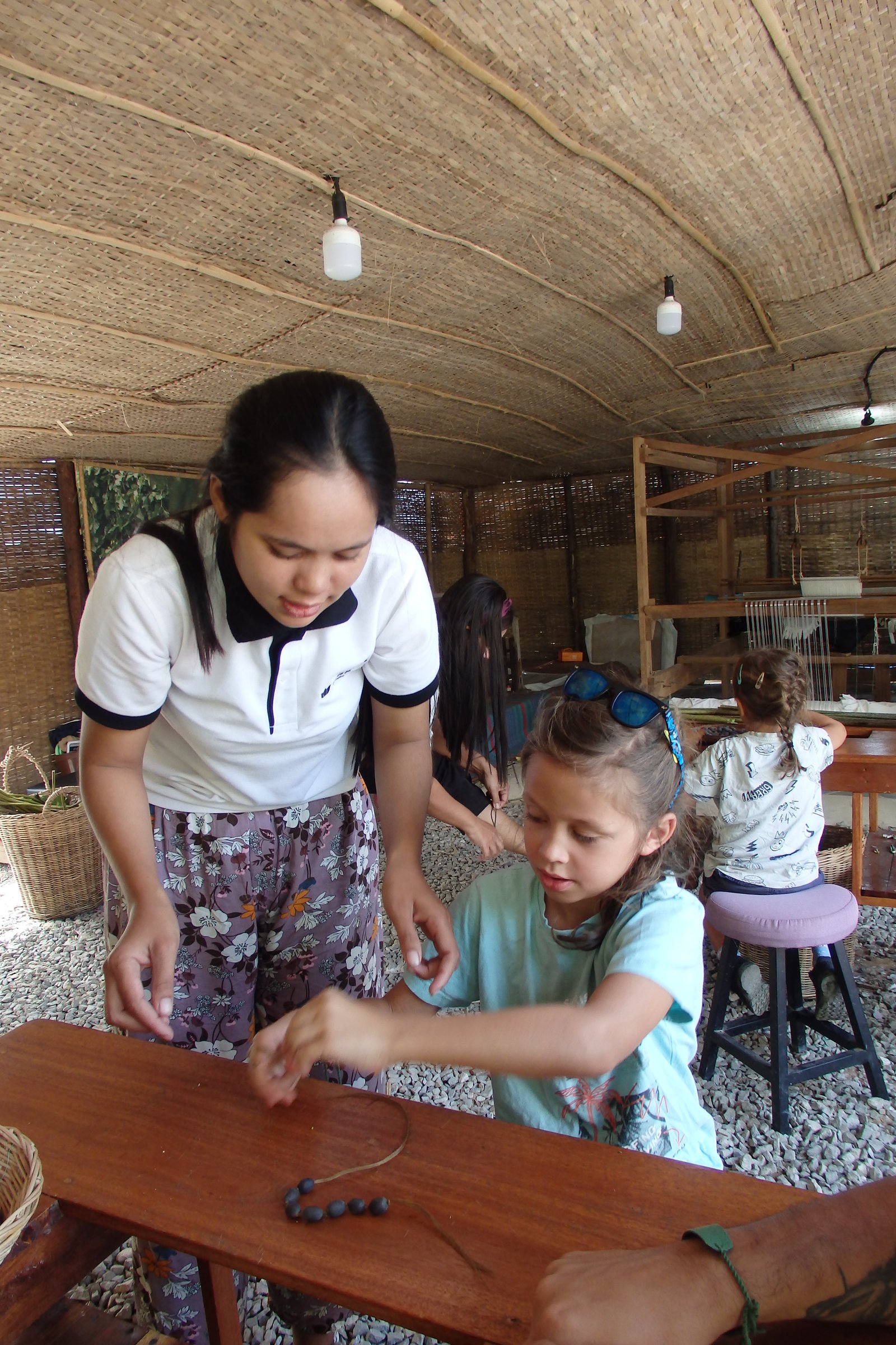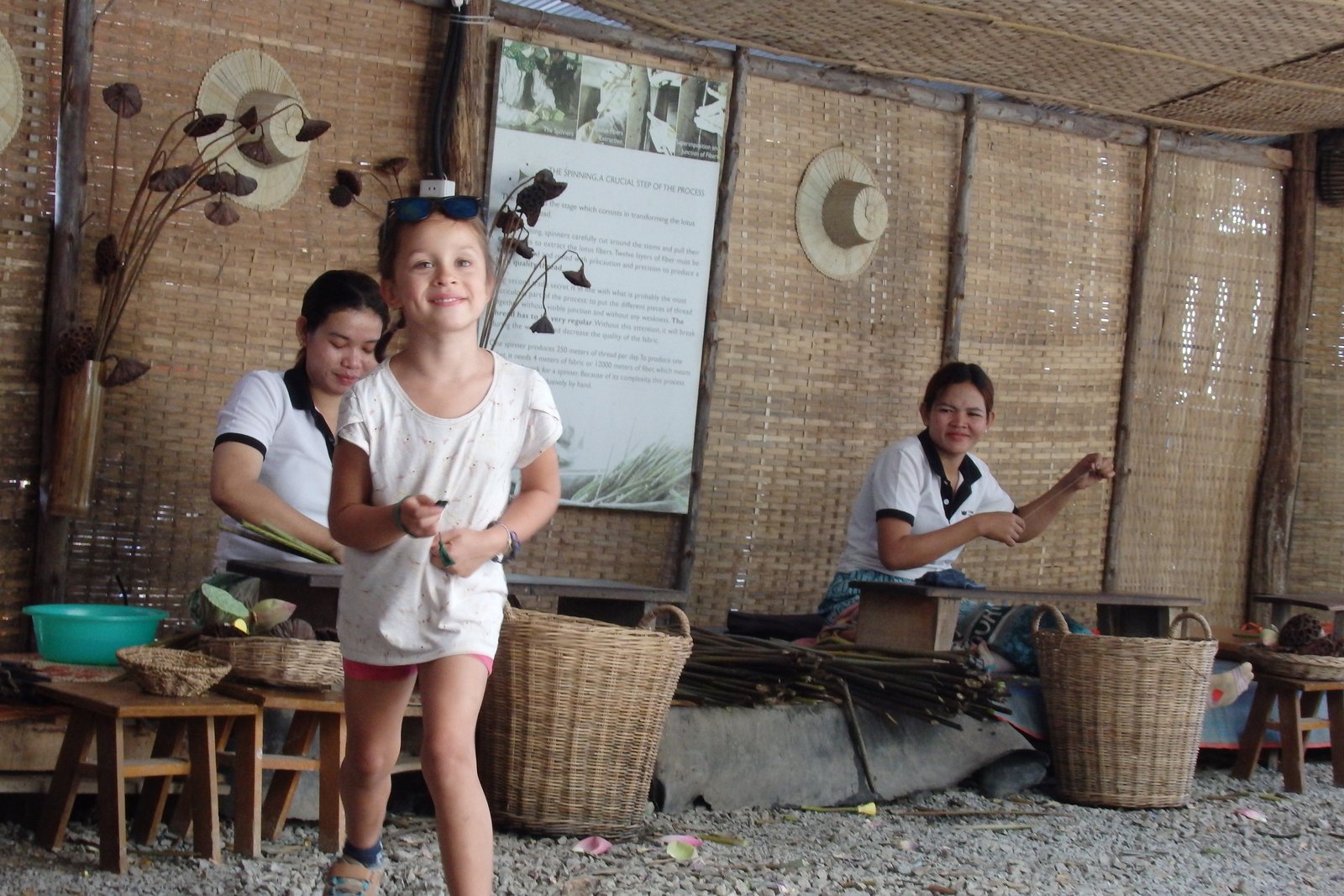 Pobyt na farmie zaczęliśmy właśnie od robótek ręcznych. Pierwszą aktywnością było robienie nici z łodygi lotosu – należy naciąć i złamać łodygę w odcinkach około 5-7cm, po złamaniu rozsunąć kawałki na szerokość stołu – pojawią się włókna, które należy następnie skręcić razem. Dzieciom szło to różnie, ale sznureczek na rękę udało się stworzyć.