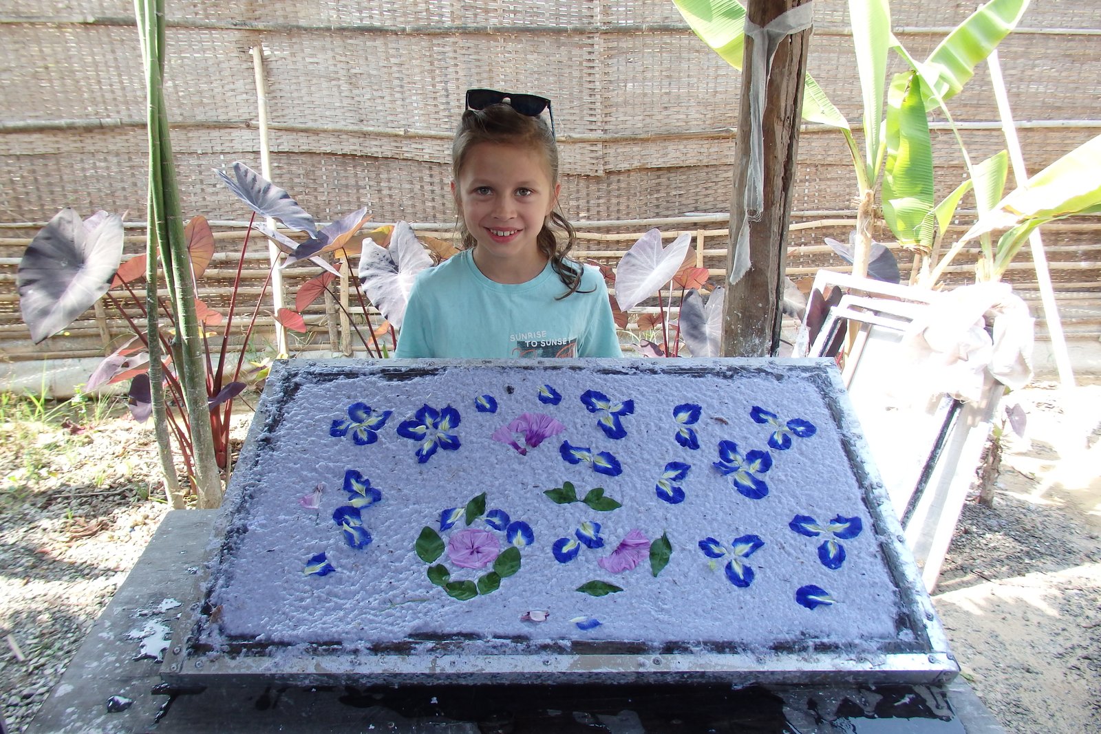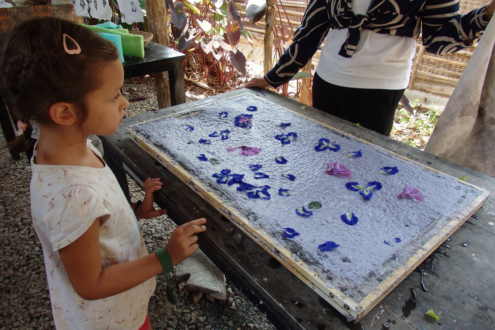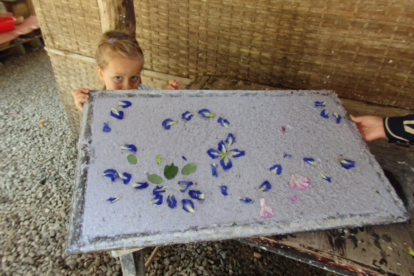 Druga aktywność, to tworzenie własnej bransoletki z nasion lotosu. Tutaj wymagana była obecność całkiem okazałej igły, więc nie obyło się bez wsparcia, ale dzieci dzielnie nawlekały kolejne koraliki. Trzecim zadaniem, które zdecydowanie przyniosło najwięcej radości było wytworzenie własnego papieru. Była już przygotowany basen z pulpą, do której wkładało się taka ramę okienną z nałożoną moskitierą – służył taki zestaw jako sitko. Po nabraniu odpowiedniej ilości mieszanki, przenosiło się tę ramę na stół, gdzie następnie się wyciskało nadmiar wody za pomocą gąbek. Tu dzieci już pomagały, ale najwięcej radości przyniósł im kolejny etap – przystrajanie. Do dyspozycji mieli płatki kwiatów i liście klitorii ternateńskiej (jeszcze o niej powiemy innym razem). Nasze potworki lubują się w zbieraniu kwiatów i robieniu „miksturki”, czyli mieszaniny wody z czym się tylko da (kremy, żele, przyprawy, kamienie, części roślin i tak dalej), więc ta zabawa nie odbiegała za bardzo od tego, co uwielbiali.