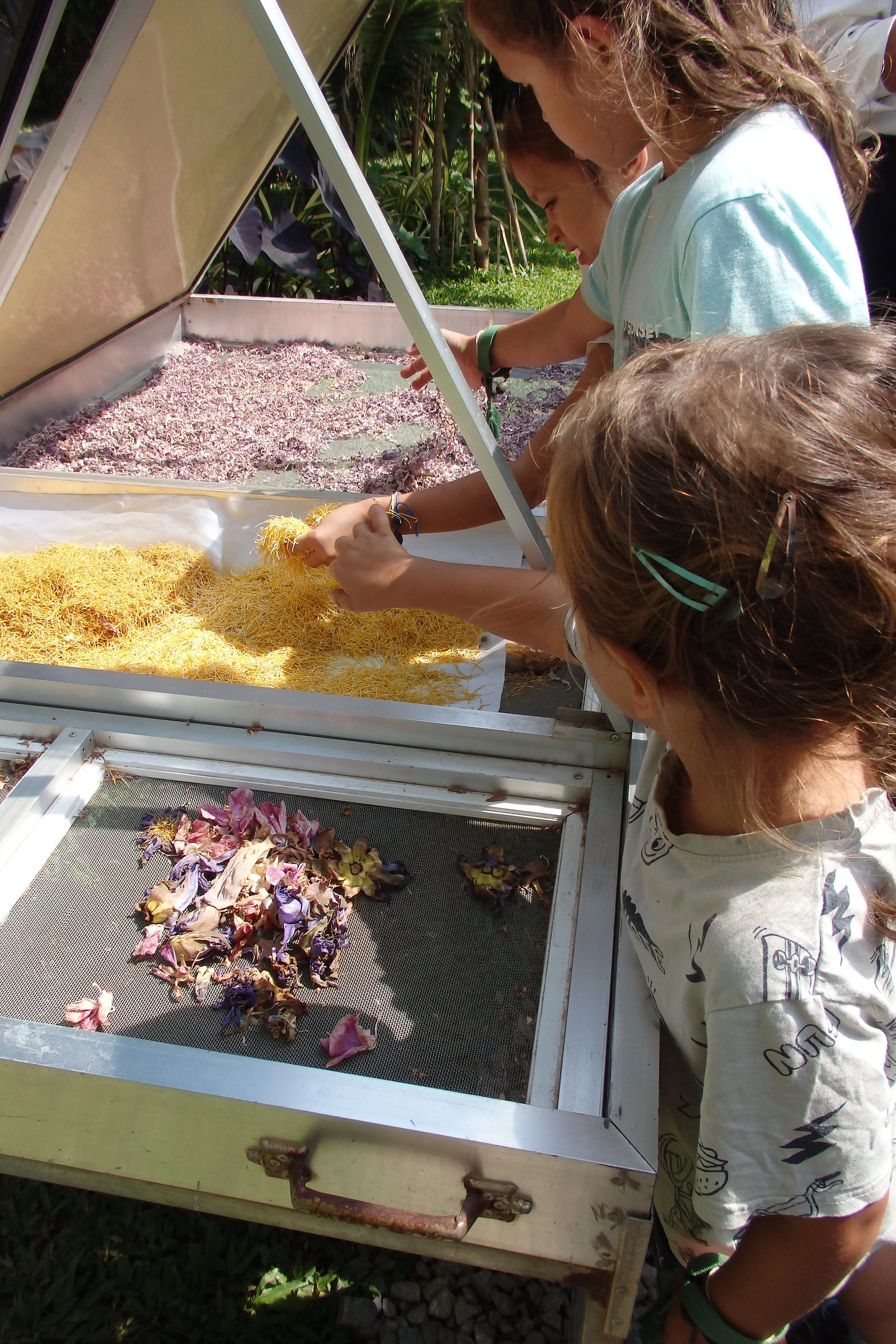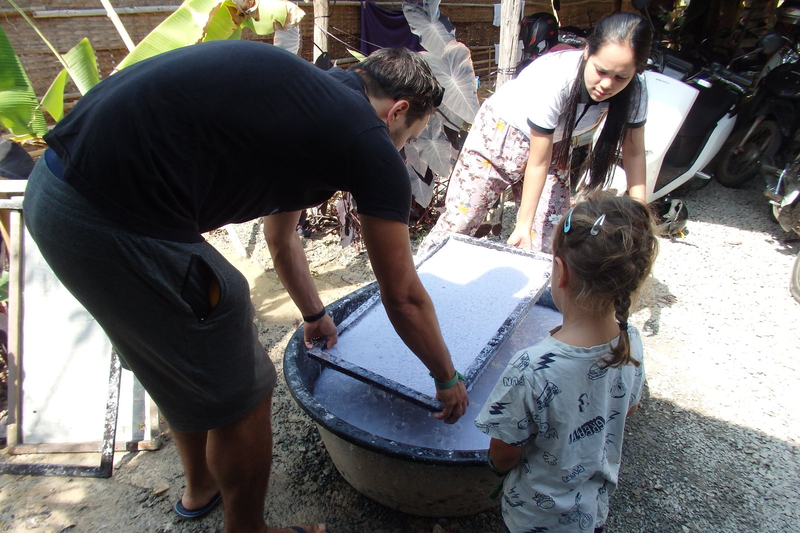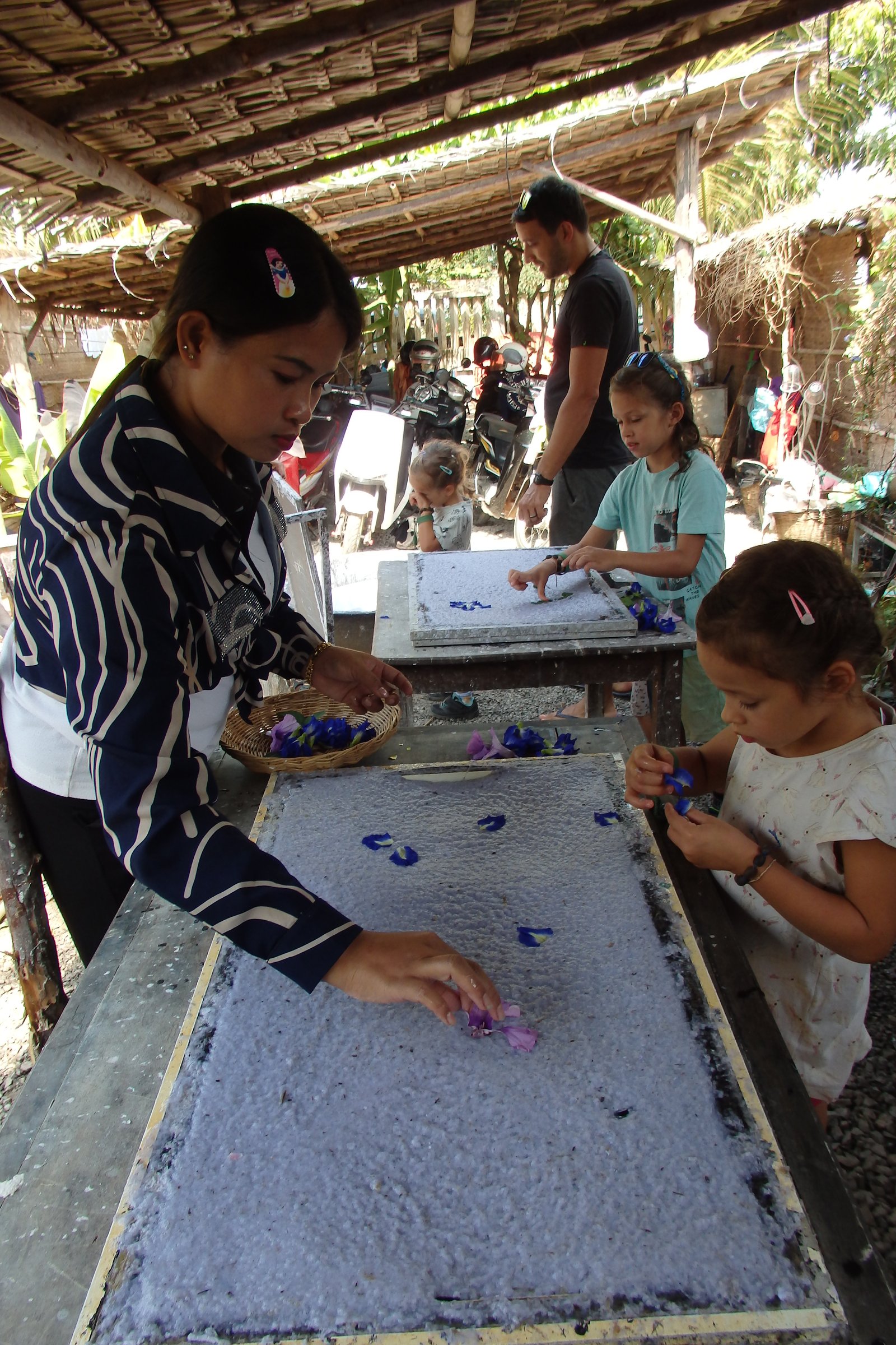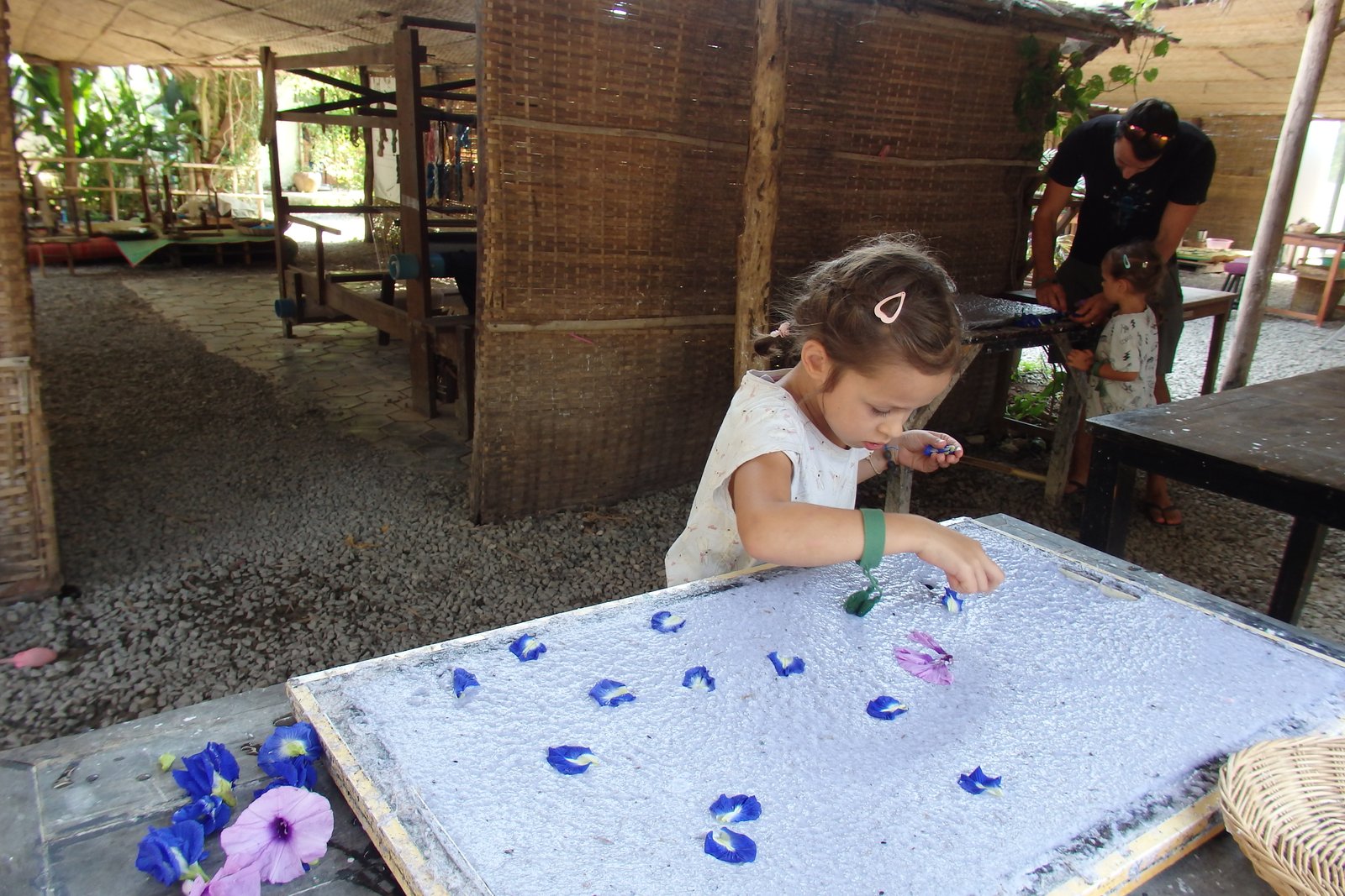 Druga aktywność, to tworzenie własnej bransoletki z nasion lotosu. Tutaj wymagana była obecność całkiem okazałej igły, więc nie obyło się bez wsparcia, ale dzieci dzielnie nawlekały kolejne koraliki. Trzecim zadaniem, które zdecydowanie przyniosło najwięcej radości było wytworzenie własnego papieru. Była już przygotowany basen z pulpą, do której wkładało się taka ramę okienną z nałożoną moskitierą – służył taki zestaw jako sitko. Po nabraniu odpowiedniej ilości mieszanki, przenosiło się tę ramę na stół, gdzie następnie się wyciskało nadmiar wody za pomocą gąbek. Tu dzieci już pomagały, ale najwięcej radości przyniósł im kolejny etap – przystrajanie. Do dyspozycji mieli płatki kwiatów i liście klitorii ternateńskiej (jeszcze o niej powiemy innym razem). Nasze potworki lubują się w zbieraniu kwiatów i robieniu „miksturki”, czyli mieszaniny wody z czym się tylko da (kremy, żele, przyprawy, kamienie, części roślin i tak dalej), więc ta zabawa nie odbiegała za bardzo od tego, co uwielbiali.