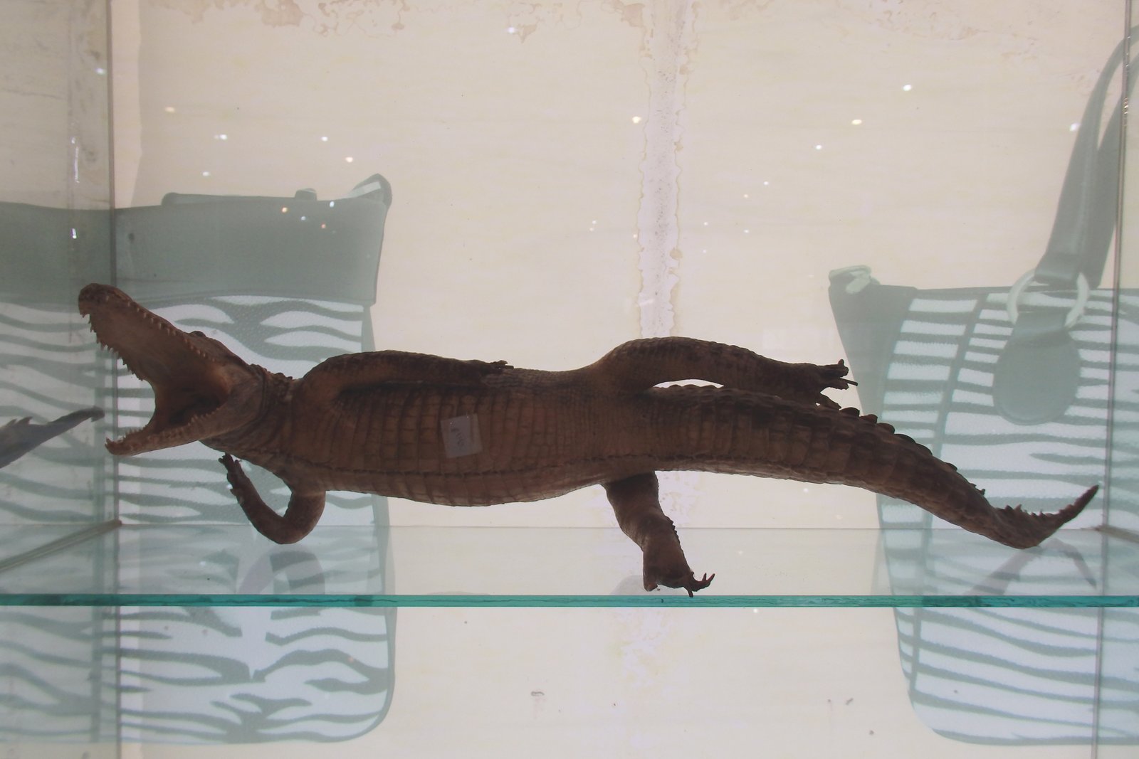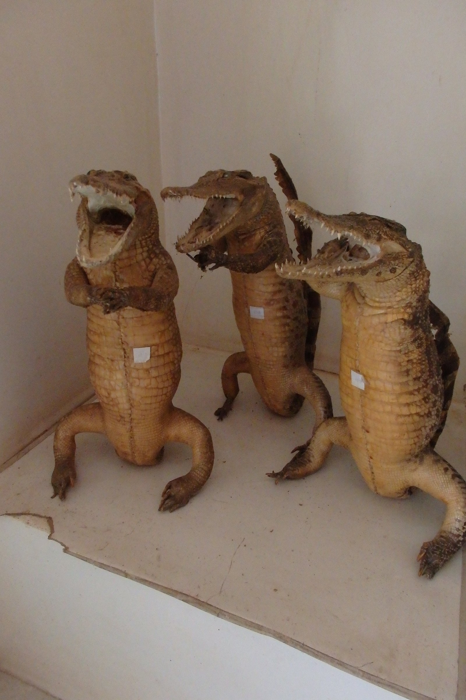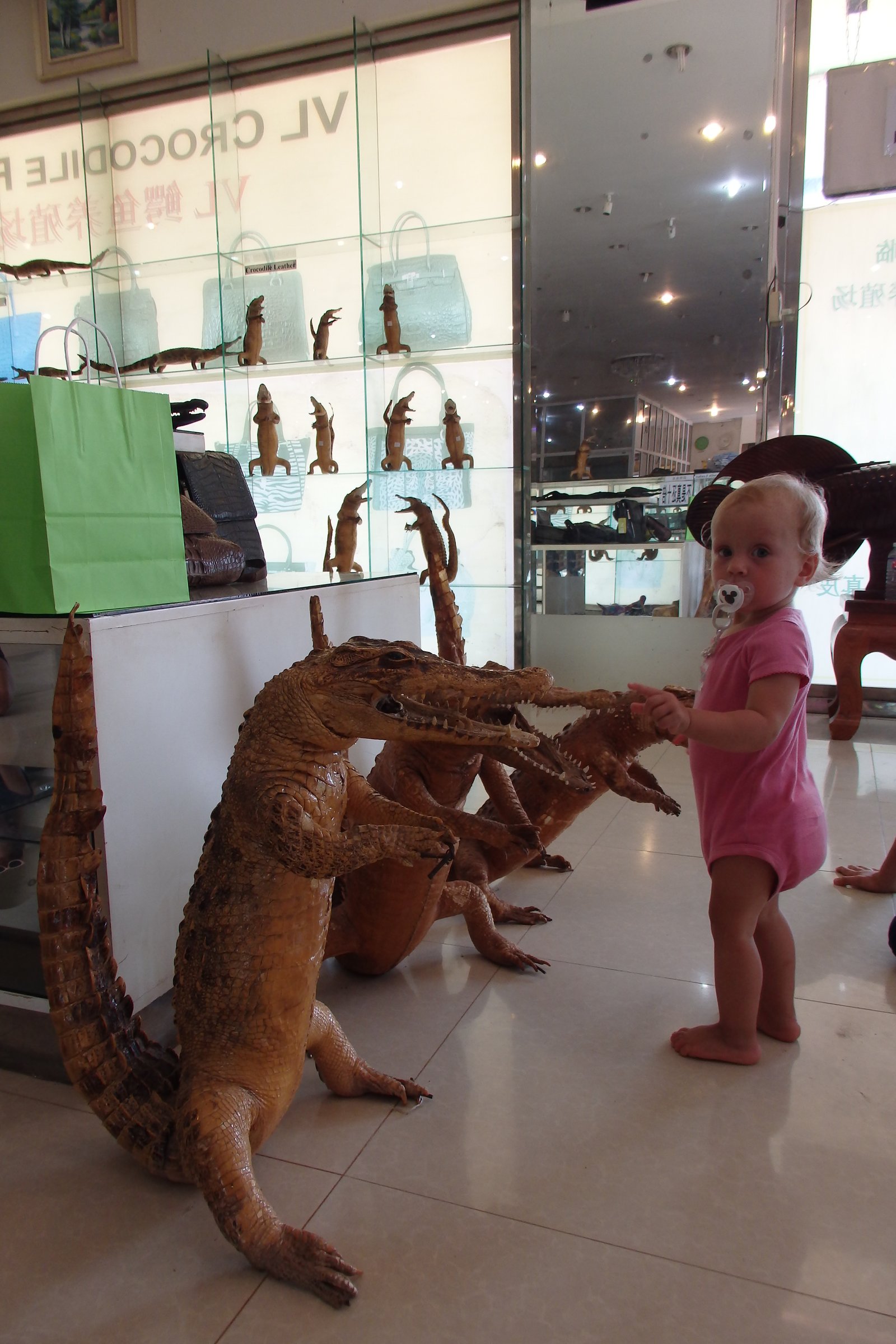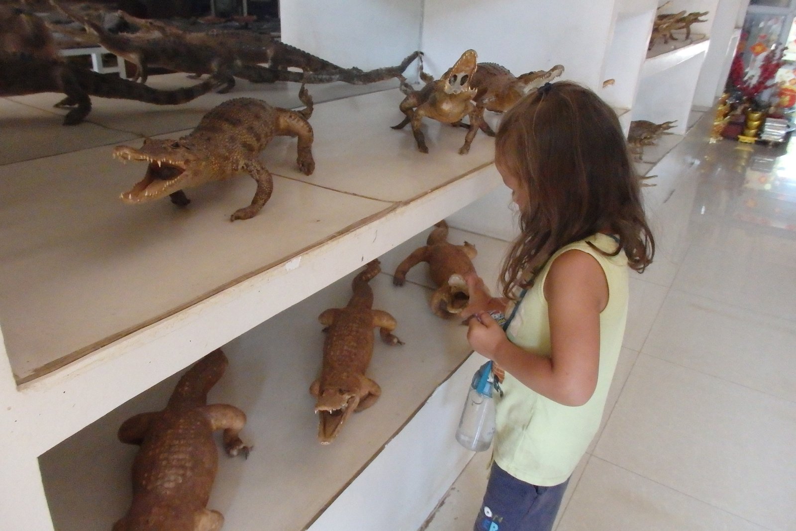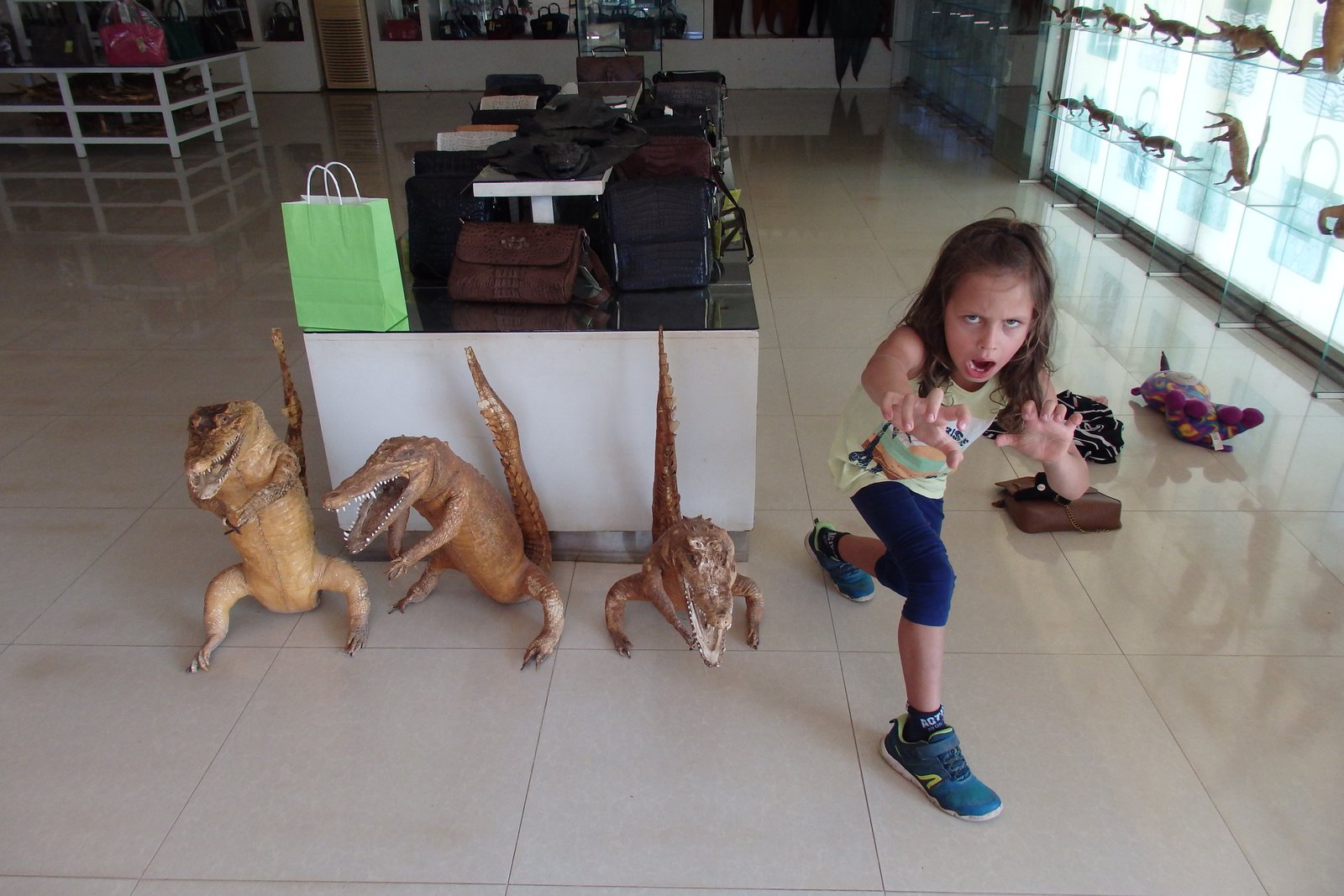 Na pocieszenie mieliśmy wizytę w sklepiku przy tym ośrodku, gdzie można było zobaczyć całą gamę produktów ze skóry krokodyla, ale można też było sobie zakupić całą skórę. Albo zęby, albo czaszkę, a nawet wypchane krokodyle przeróżnych rozmiarów. Mając świadomość, że taka pamiątka przysporzyłaby sporo problemów na przejściach granicznych, nic nie kupiliśmy, ale krokodyl w pozycji Rose z Titanica („namaluj mnie jak jedną ze swoich francuskich dziewczyn”) kusił niemiłosiernie. Jak to stwierdził Bastek – tutaj ma faktycznie pewność, że to naturalna skóra. Baltazarowi najbardziej spodobały się zwierzaki w pozycjach kung-fu (jego interpretacja, my nie jesteśmy jej pewni), Aurorze z kolei kolorowe torebki i portfele.
