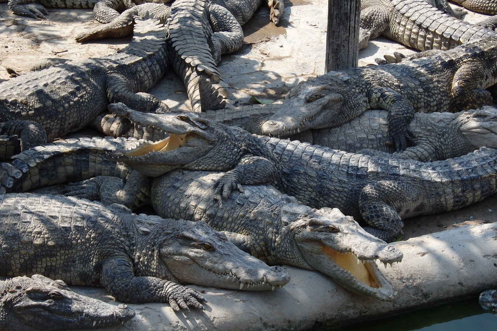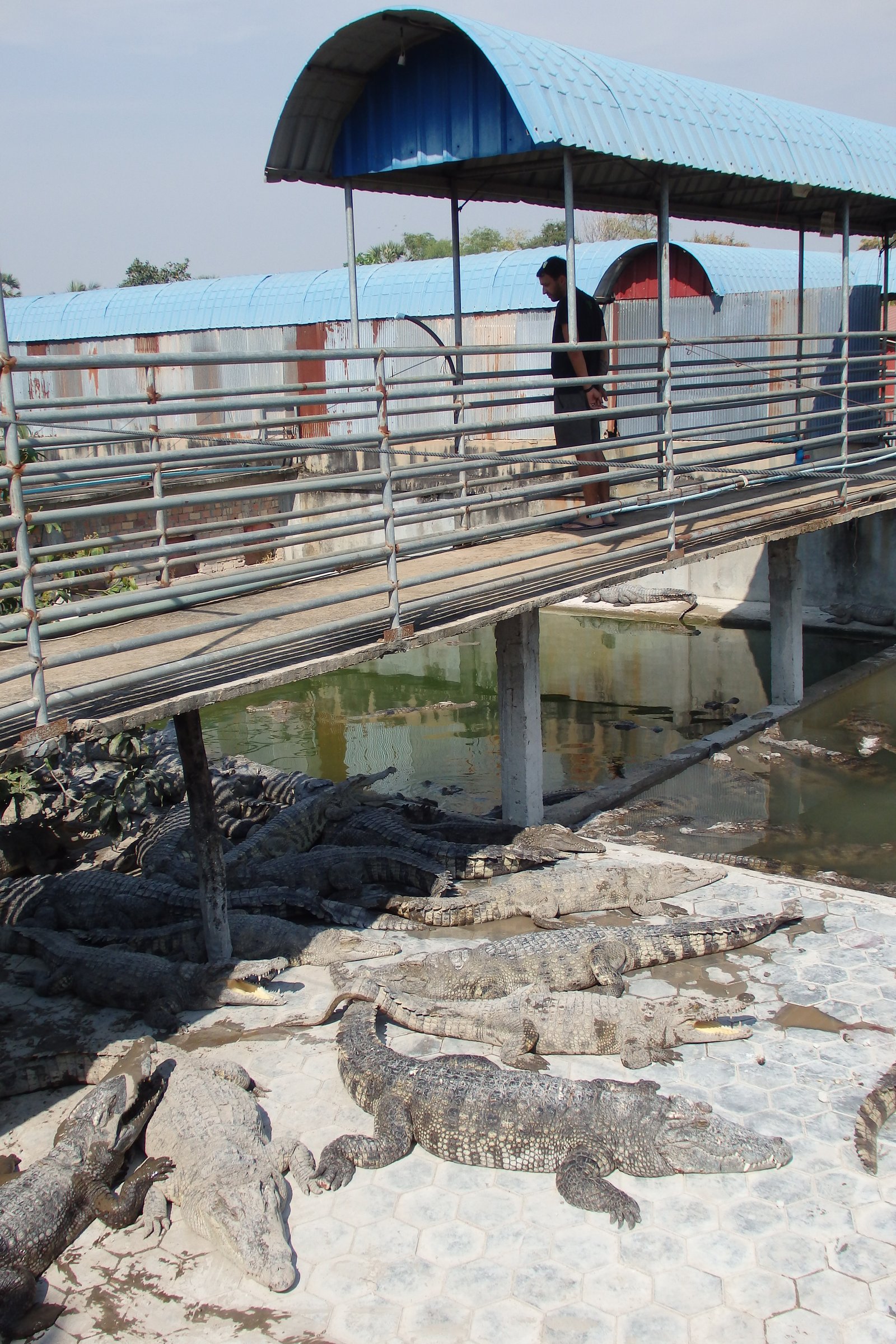 Skoro już wyjechaliśmy z opowieściami poza centrum Siem Reap, to nie można nie wspomnieć o wypadzie do hodowli krokodyli. W Kambodży mają swoją odmianę krokodyli syjamskich, która jest gatunkiem zagrożonym wyginięciem (szkoda, że nie nazywają się Khmerskie Krokodyle, bo to naturalny pomysł na nazwę drużyny lub zespołu). Chociaż ten chów (VL Crocodile Farm – czyżby Vuitton Louis ma biznes na boku?) raczej nie była prowadzona w celu ratowania gatunku, a raczej dla zysku no i chyba tutaj mają inny rodzaj krokodyla (nie wiemy, nie znamy się, dość wiedzieć, że krokodyl oznacza niebezpieczeństwo).