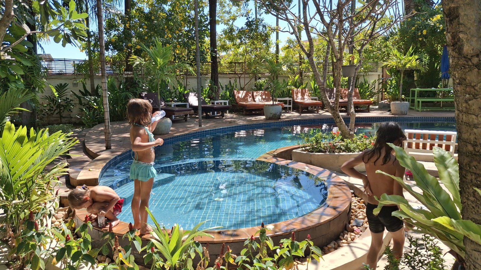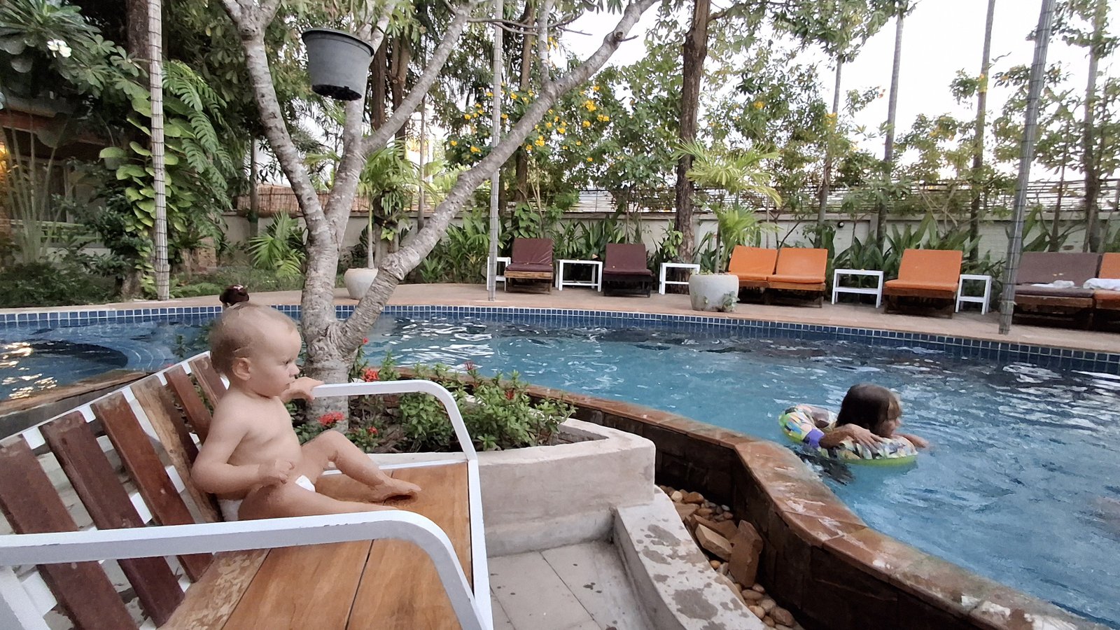 Przywitał nas na miejscu Hak – sympatyczny Khmer, na oko 35 letni, mówiący przepiękną angielszczyzną – naturalnym było pytanie, czy to od jego imienia jest nazwa hotelu – ale jego odpowiedź, że to „rodzinny biznes” sugeruje, że może to być jeszcze od jego ojca. A jest to całkiem imponująca budowla, widać, że dużo serca i pracy zostało włożonych w jego konstrukcję, no i jest z basenem! Mieliśmy pokój na parterze, z tarasem i huśtawką, a do tego udało się zgarnąć przenośne hamaki – dzieci miały używanie. Ja zaś zacząłem żyć jak bogacz i rozpoczynać każdy dzień od kąpieli w brodziku (trochę za zimnym jak na standardy Niebieskiej). Chłodna woda skutecznie wybudza, zaś poczucie, że rozpoczynam dzień od rundki w basenie dawał dodatkowe punkty do filmowej prezencji.