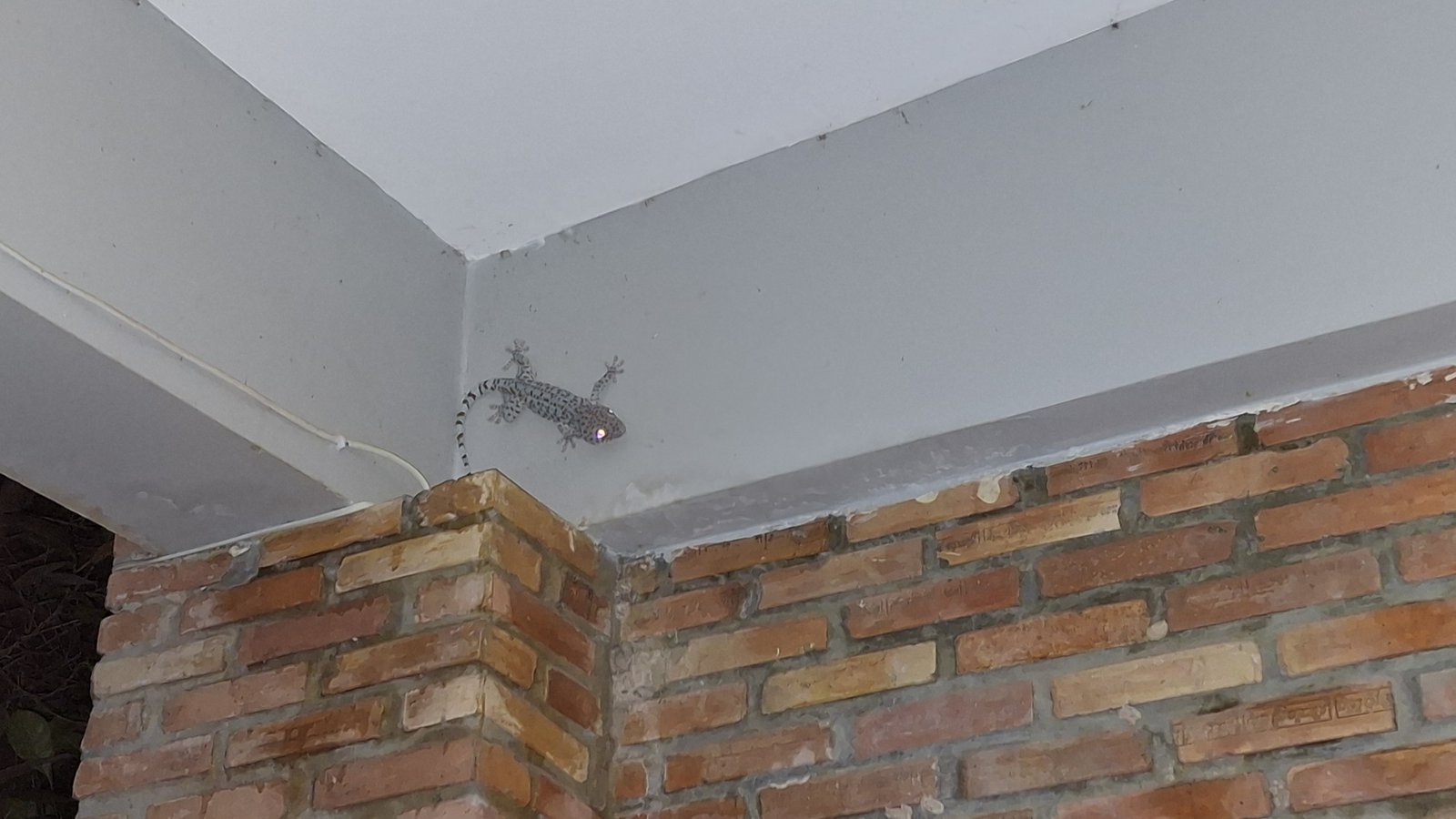 Siedzieliśmy sobie w dwójkę na naszej tarasowej huśtawce, gdy dzieci już spały, a wpis został wrzucony na bloga – i tak od niechcenia rzuciłem, że ta pajęczyna/śmieci/robactwo/cień które widzimy na zacienionej ścianie ułożyły się w kształt gekona. Niebieska rzuciła okiem, by z krzykiem zaskoczenia i niedowierzania stwierdzić, że to JEST gekon. Ostrożnie podeszliśmy, by go nie przestraszyć, a także by uniknąć ewentualnego ataku z powietrza i zobaczyliśmy tę bestię na własne oczy. Czerwone ślepia i pokaźny rozmiar (dobre 30 centymetrów) wzbudził nasz natychmiastowy respekt i od razu zaczęliśmy z niepokojem spoglądać powyżej naszych głów czy czasem nie ma ich więcej.