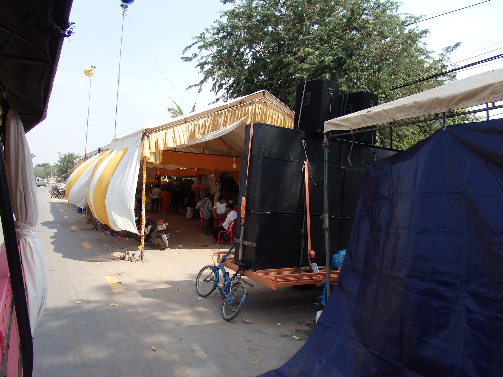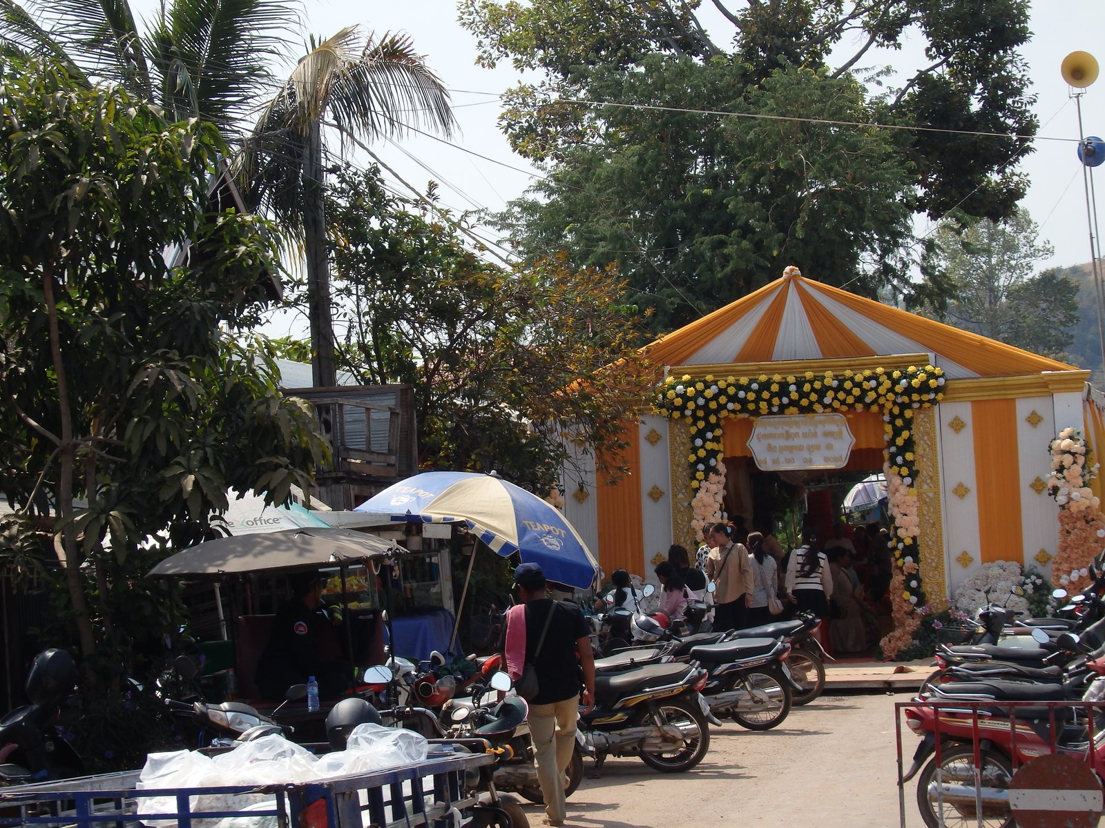 Nie, to nie jest islam, tu nie ma śpiewów 5 razy dziennie. W ciągu zwykłego dnia sprawa jest prosta i niezauważalna dla osób z zewnątrz, pod tym względem Kambodża wydaje się bardzo laicka w porównaniu do ościennych krajów. Ale jeśli komuś się zemrze… W przypadku śmierci osoby, mnisi przybywają do domostwa i śpiewają przez cały dzień. A czasem przez i dwa dni. Czasem z muzyką na żywo, czasem z taką odtwarzaną, ale najważniejsze – MA BYĆ GŁOŚNO! Tak głośno by wszyscy w okolicy usłyszeli i mogli przyjść się pożegnać. Najwyraźniej wieszanie papierowych klepsydr jest dla nudnych Słowian. Khmerzy, Ich to ma być słychać!. No i było. I głośno. I długo. I to kilka razy – najwyraźniej trafiliśmy na jakąś promocję – dwie urny, trzecia gratis, bo te śpiewy trwały TYDZIEŃ! Jeden, wielki, kambodżański pogrzeb. Cały czas, dzień, noc, cały czas! Uff, na wspomnienie tych performansów znowu czuję zmęczenie. I o ile pierwszy zgon miał miejsce około 5 kilometrów od naszego domu (informacja od gospodarza), to ten trzeci był tak blisko, że jak rano nagłośnienie ruszyło z kopyta, to Niebieska się poderwała na równe nogi myśląc, że nastąpiło jakieś bombardowanie.
