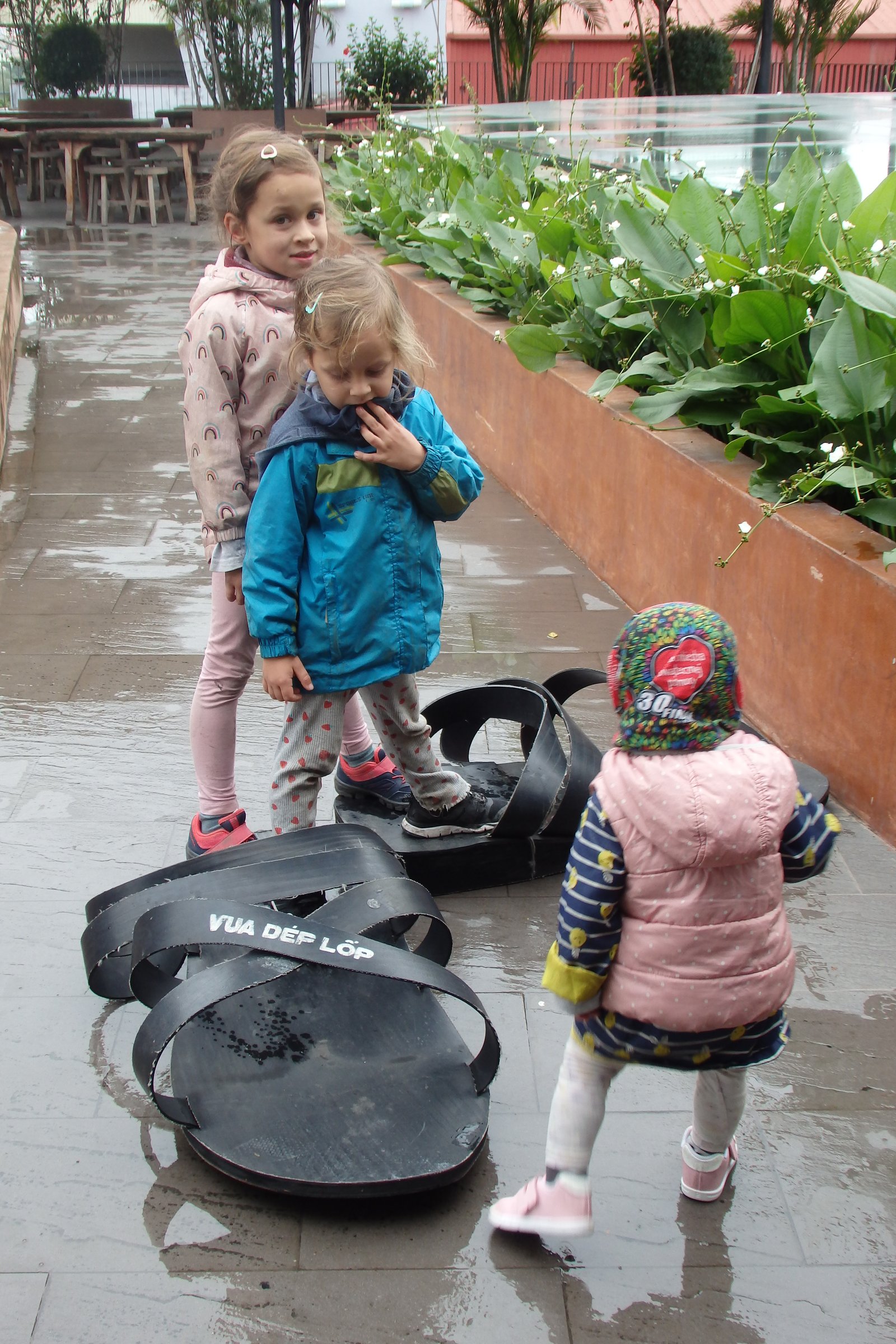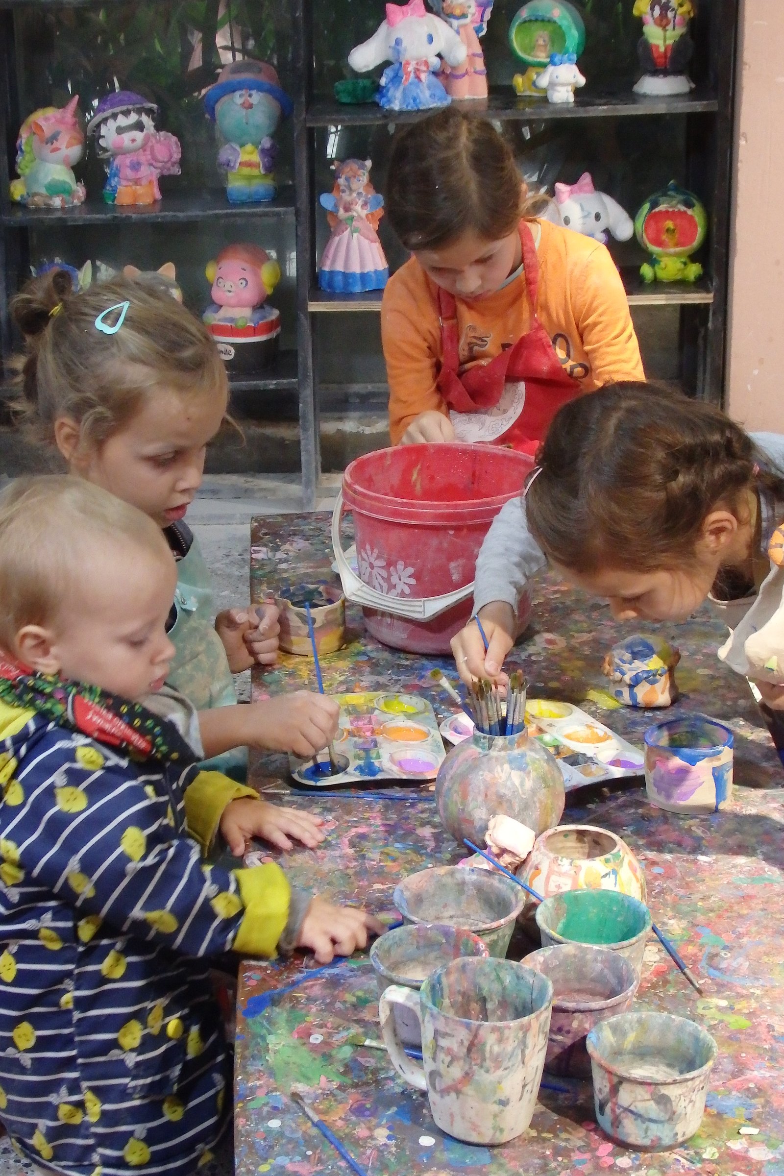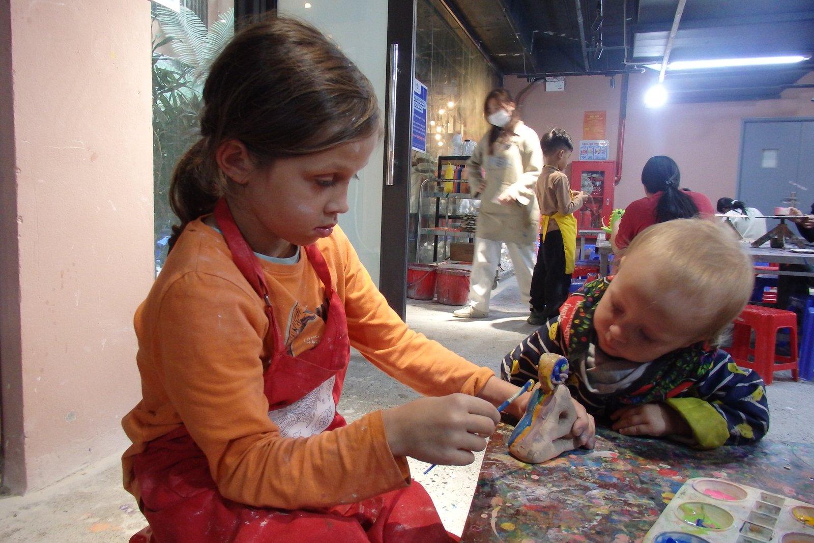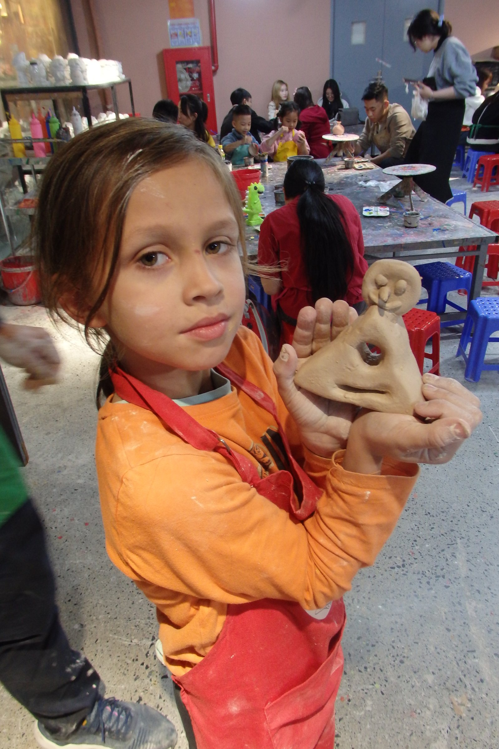 Końcowym etapem jest pomalowanie swojego „dzieła”, do którego dzieci ochoczo zasiadły. Jest to czynność bardzo popularna w Hanoi, ponieważ miasto to znalazło świetny sposób na urozmaicenie pobytu w kawiarniach – można za dodatkową opłatą uzyskać glinianą figurę, którą przy kawie można sobie relaksacyjnie pomalować (nie tylko kawiarnie to oferują. W jednej sali zabaw Aurora pomalowała figurkę renifera, z którą nie chciała się rozstać, więc ostatecznie została ukryta w nigdy nie otwieranej szafce jednego z domów na AirBnB – jesteśmy pewni, że jeśli wrócilibyśmy do tego mieszkania w Da Nang za kilka lat to ona tam dalej będzie). Początkowo nie wiedzieliśmy o co w tym wszystkim chodzi, ale szybko zrozumieliśmy, że może to być pomysł na biznes – wszak każda czynność, która odklei nas od smartfonu powinna być promowana i próbowana. A zdecydowanie jestem w stanie dwie starsze panie, malujące figurki Maryi przy szklankach z koszyczkiem pełnym kawy zalewajki, obok studenta z sojowym latte.