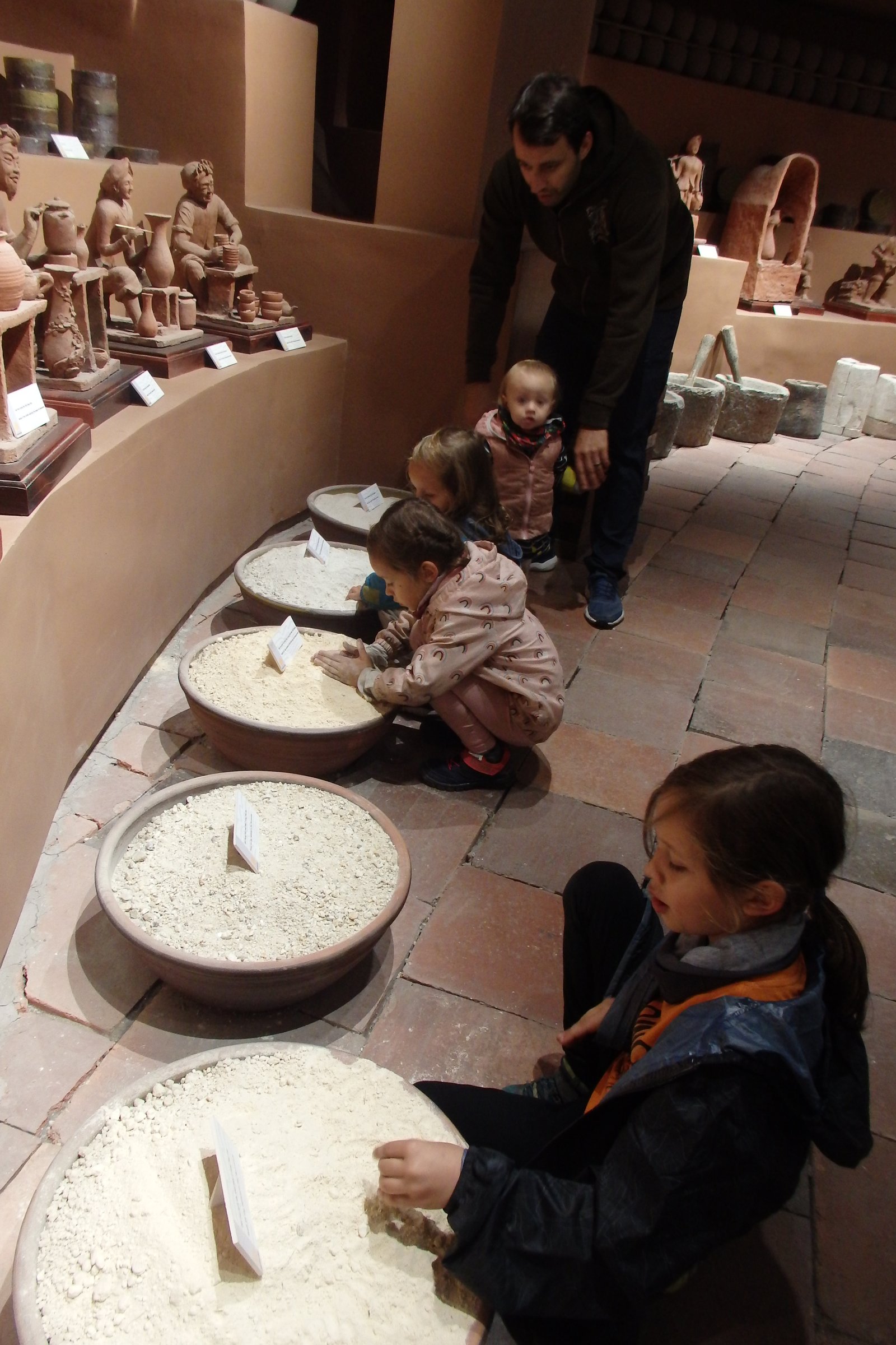 Zwiedzanie rozpoczęliśmy od piętra przedstawiającego proces tworzenia ceramiki. Mimo naszych usilnych starań, trudno było utrzymać dzieci w ryzach (długo i relatywnie spokojnie przesiedziały w autobusie miejskim by tam dotrzeć), ale muzeum było chyba w tym miejscu przygotowane na bardziej organoleptyczne eksploracje. Przykładem niechaj będzie 7-10 koszów z różnego rodzaju sproszkowanej, wysuszonej gliny, wokół których już przed naszym przybyciem można było znaleźć ślady odbitych maleńkich, dziecięcych łapek. Więc jesteśmy usprawiedliwieni (chociaż trochę nam wstyd). Poza tym były tam makiety różnych pieców do wypalania, narzędzi, naczyń na różnym etapie tworzenia i tym podobnych punktów.