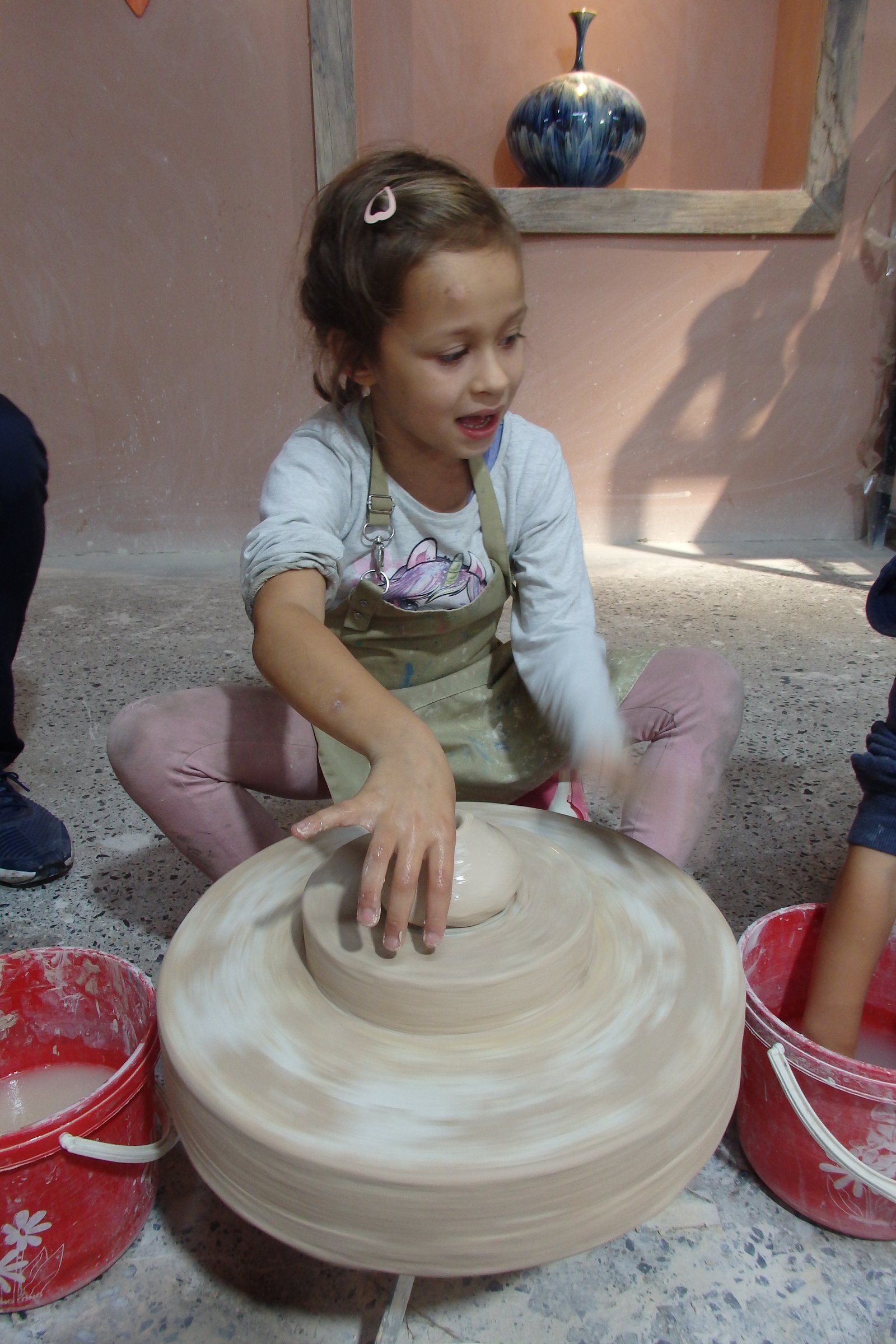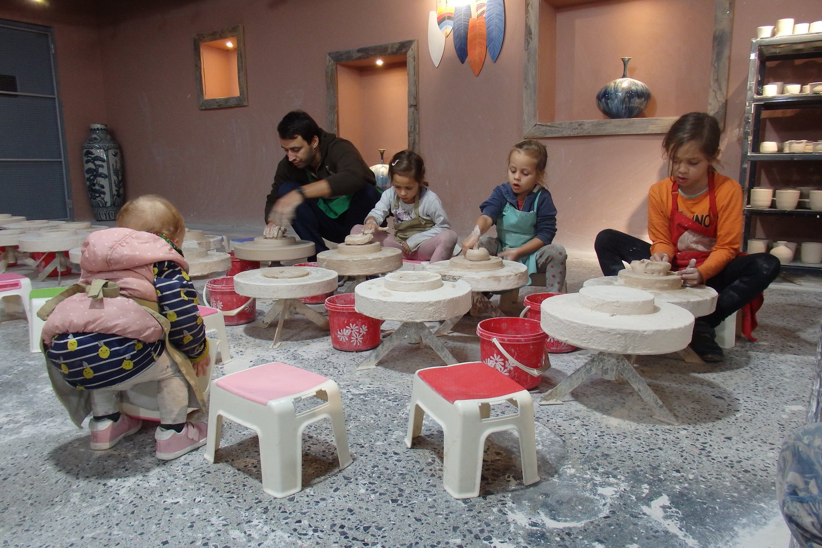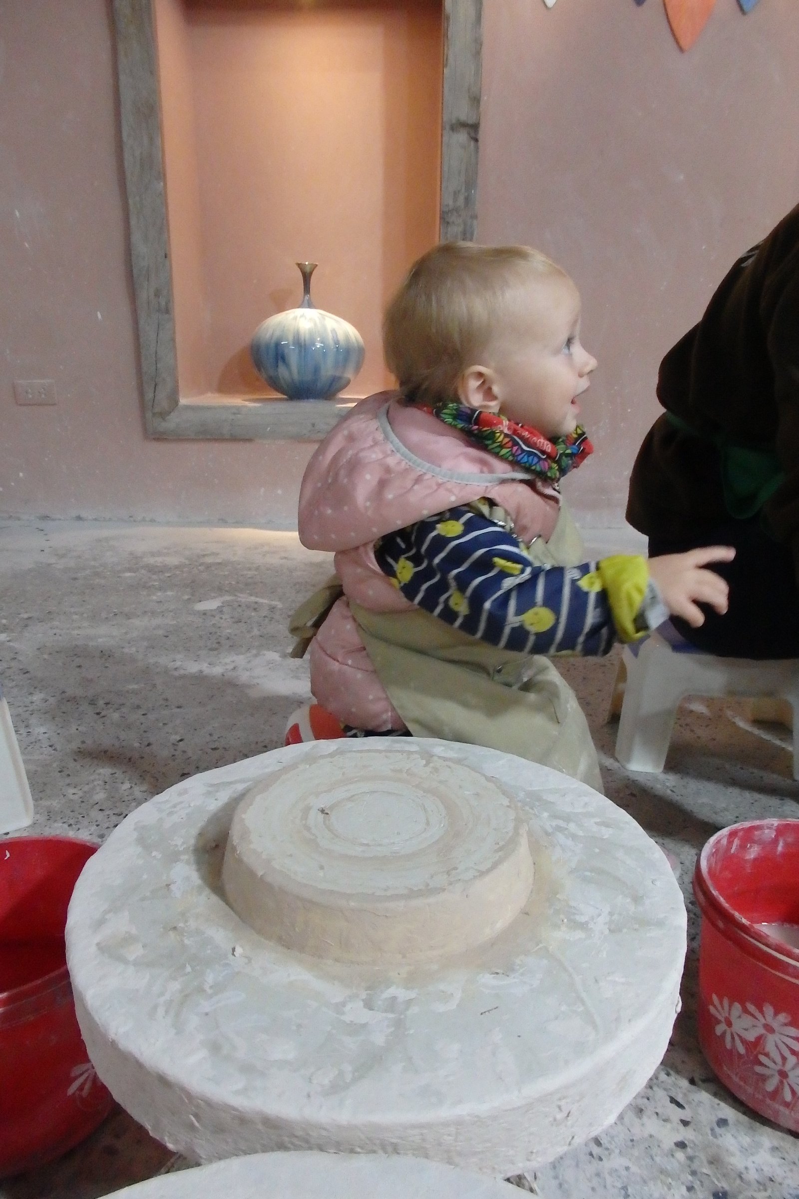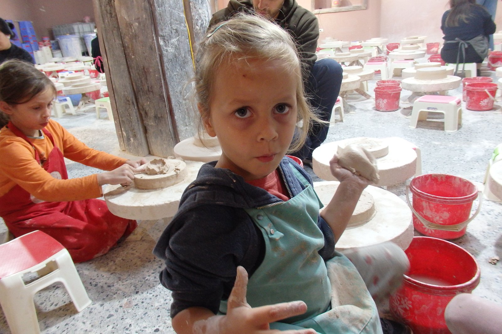 Do dyspozycji było ogrom kół garncarskich – tak na oko 50. Szczęśliwie nie trafiliśmy na wycieczki szkolne w tym czasie więc wybraliśmy sobie najwygodniejsze pozycje – takie, by Tamara nie wpadała w inne stanowiska i by mogła sobie swobodnie truchtać od miejsca do miejsca. Mimo iż opłaciliśmy zajęcia tylko dla samych dzieci, nam też przypadła do dyspozycji porcja gliny, więc nie wyprowadzając nikogo z błędu zasiedliśmy na bardzo małych krzesełkach do stołów. Te małe krzesełka ponownie stanowiły dla mnie problem – nie mam pojęcia jaką to trzeba przybrać pozycję, by móc wygodnie pracować po wiele godzin na tak niskim siedzisku – no ale to już zagwozdki nieelastycznych Europejczyków. Dzieci, rzecz jasna, nie miały z tym problemu, więc co żyw zabrały się do roboty. Początkowo moją pracę można było by określić „zespół do szybkiego reagowania na wnioski dziecięce” – te wnioski to: mi nie działa, co mam teraz zrobić, tato a zrobisz mi…, i tak dalej. Niebieska się samozaturdniła przy „kontroli nad niszczącymi czynnikami” (z angielska damage control), gdzie niszczącym czynnikiem była Tamara,  dorabiała dodatkowo jako fotografa (jak tu zrobić zdjęcie i nie ubrudzić sprzętu glinką). Po pierwszych porażkach i kilkukrotnym przypominaniu treści filmiku dopiero obejrzanego, wszyscy złapaliśmy rytm. Tamara przestała niszczeć, zaś zapragnęła tworzyć, zaś starszaki wkręcili się (he he, że koło garncarskie, nie?) w robotę i przynosili co raz to bardziej skomplikowane zbitki gliny. Ja, nie chwaląc się (bo nie ma czym), również stworzyłem coś, co w ciemnym pokoju, mogłoby uchodzić za naczynie (wody może nie utrzyma, ale kształt sugeruje coś więcej niż porzuconą plastelinę).