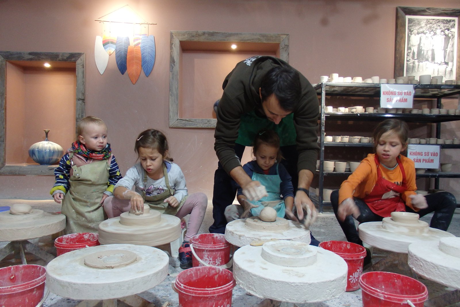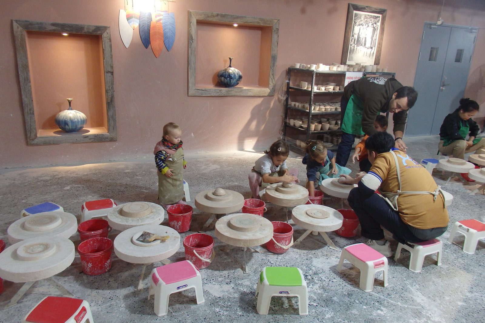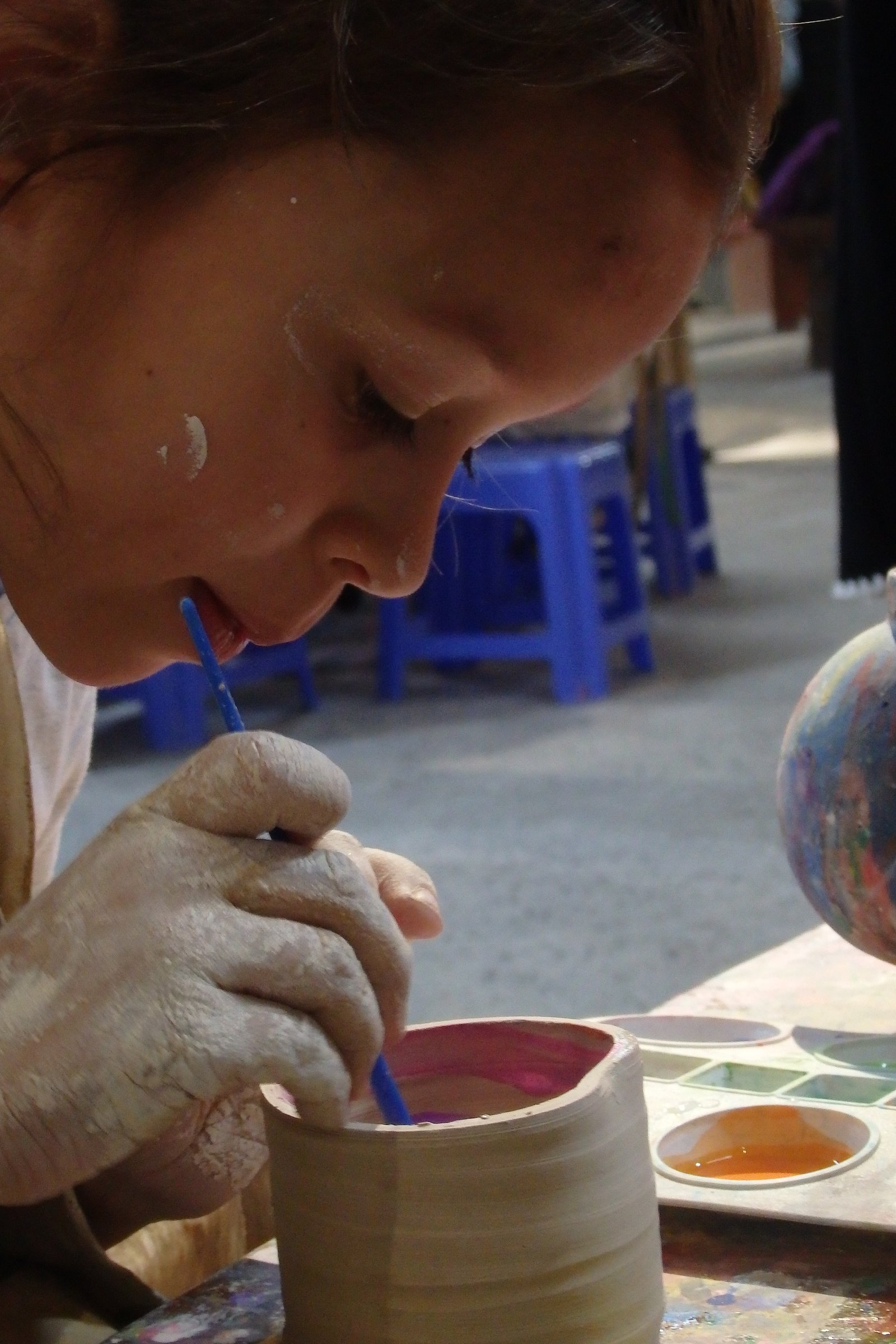 Do dyspozycji było ogrom kół garncarskich – tak na oko 50. Szczęśliwie nie trafiliśmy na wycieczki szkolne w tym czasie więc wybraliśmy sobie najwygodniejsze pozycje – takie, by Tamara nie wpadała w inne stanowiska i by mogła sobie swobodnie truchtać od miejsca do miejsca. Mimo iż opłaciliśmy zajęcia tylko dla samych dzieci, nam też przypadła do dyspozycji porcja gliny, więc nie wyprowadzając nikogo z błędu zasiedliśmy na bardzo małych krzesełkach do stołów. Te małe krzesełka ponownie stanowiły dla mnie problem – nie mam pojęcia jaką to trzeba przybrać pozycję, by móc wygodnie pracować po wiele godzin na tak niskim siedzisku – no ale to już zagwozdki nieelastycznych Europejczyków. Dzieci, rzecz jasna, nie miały z tym problemu, więc co żyw zabrały się do roboty. Początkowo moją pracę można było by określić „zespół do szybkiego reagowania na wnioski dziecięce” – te wnioski to: mi nie działa, co mam teraz zrobić, tato a zrobisz mi…, i tak dalej. Niebieska się samozaturdniła przy „kontroli nad niszczącymi czynnikami” (z angielska damage control), gdzie niszczącym czynnikiem była Tamara,  dorabiała dodatkowo jako fotografa (jak tu zrobić zdjęcie i nie ubrudzić sprzętu glinką). Po pierwszych porażkach i kilkukrotnym przypominaniu treści filmiku dopiero obejrzanego, wszyscy złapaliśmy rytm. Tamara przestała niszczeć, zaś zapragnęła tworzyć, zaś starszaki wkręcili się (he he, że koło garncarskie, nie?) w robotę i przynosili co raz to bardziej skomplikowane zbitki gliny. Ja, nie chwaląc się (bo nie ma czym), również stworzyłem coś, co w ciemnym pokoju, mogłoby uchodzić za naczynie (wody może nie utrzyma, ale kształt sugeruje coś więcej niż porzuconą plastelinę).