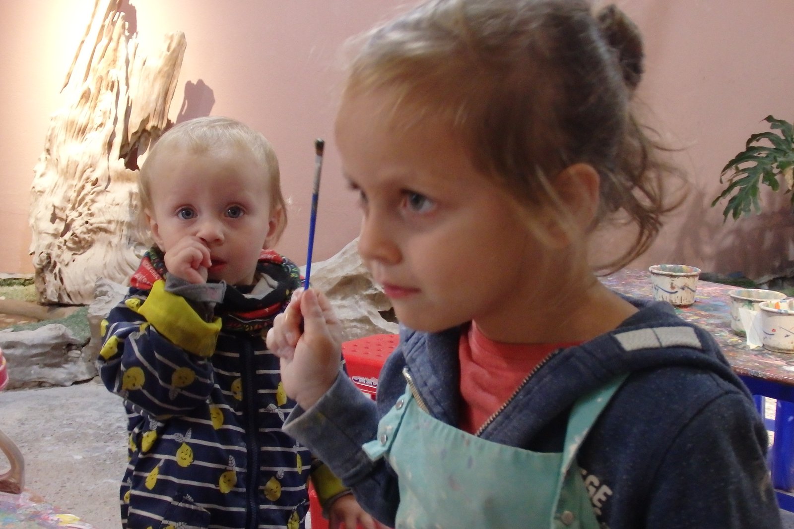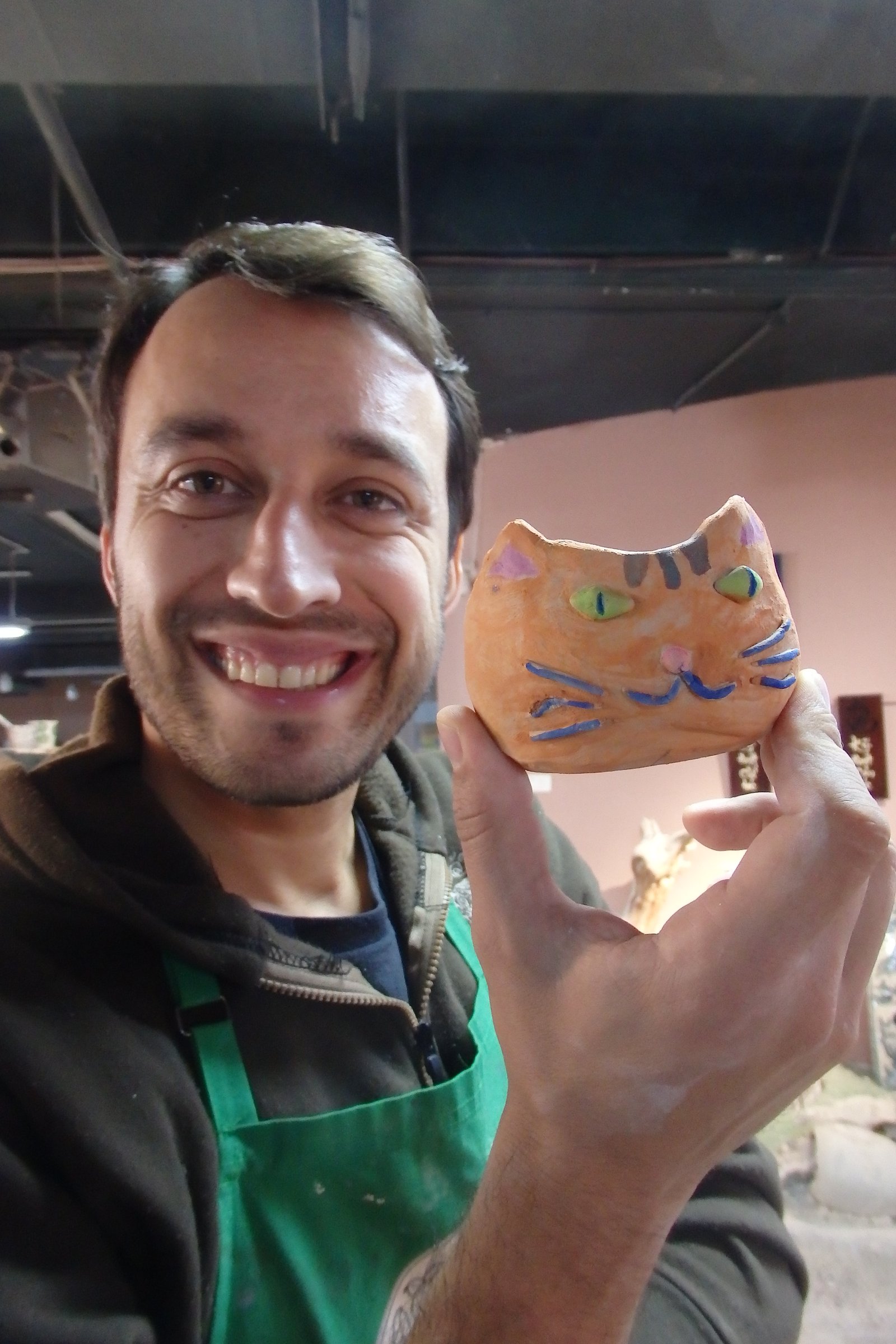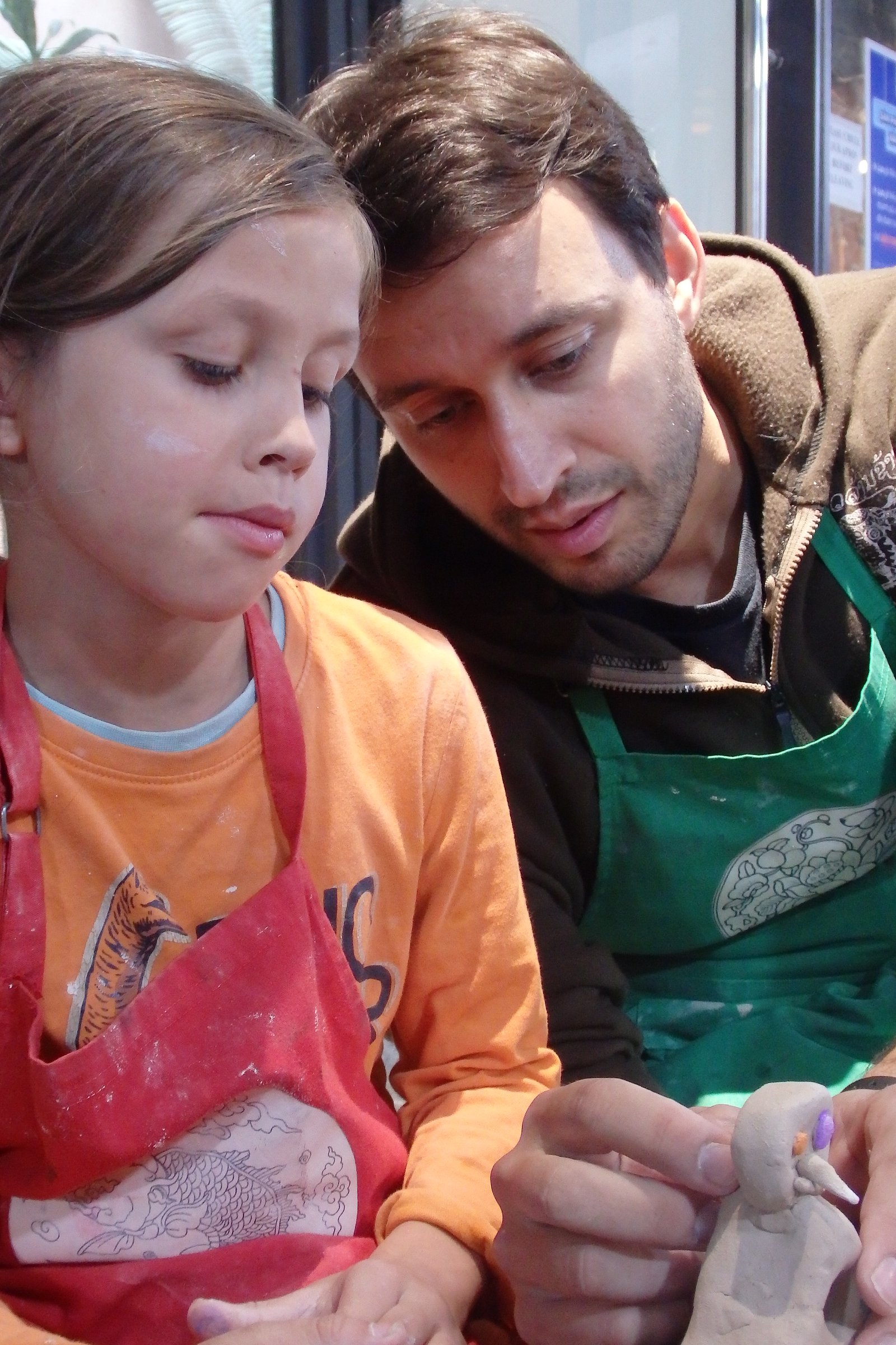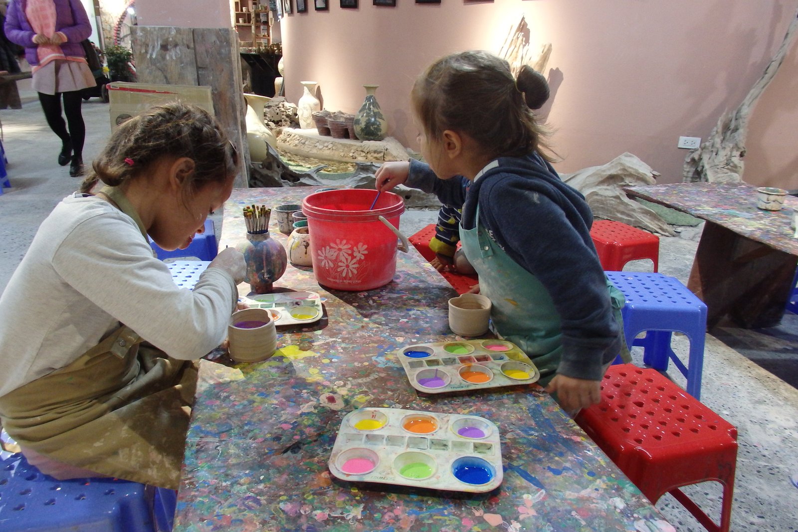 Do dyspozycji było ogrom kół garncarskich – tak na oko 50. Szczęśliwie nie trafiliśmy na wycieczki szkolne w tym czasie więc wybraliśmy sobie najwygodniejsze pozycje – takie, by Tamara nie wpadała w inne stanowiska i by mogła sobie swobodnie truchtać od miejsca do miejsca. Mimo iż opłaciliśmy zajęcia tylko dla samych dzieci, nam też przypadła do dyspozycji porcja gliny, więc nie wyprowadzając nikogo z błędu zasiedliśmy na bardzo małych krzesełkach do stołów. Te małe krzesełka ponownie stanowiły dla mnie problem – nie mam pojęcia jaką to trzeba przybrać pozycję, by móc wygodnie pracować po wiele godzin na tak niskim siedzisku – no ale to już zagwozdki nieelastycznych Europejczyków. Dzieci, rzecz jasna, nie miały z tym problemu, więc co żyw zabrały się do roboty. Początkowo moją pracę można było by określić „zespół do szybkiego reagowania na wnioski dziecięce” – te wnioski to: mi nie działa, co mam teraz zrobić, tato a zrobisz mi…, i tak dalej. Niebieska się samozaturdniła przy „kontroli nad niszczącymi czynnikami” (z angielska damage control), gdzie niszczącym czynnikiem była Tamara,  dorabiała dodatkowo jako fotografa (jak tu zrobić zdjęcie i nie ubrudzić sprzętu glinką). Po pierwszych porażkach i kilkukrotnym przypominaniu treści filmiku dopiero obejrzanego, wszyscy złapaliśmy rytm. Tamara przestała niszczeć, zaś zapragnęła tworzyć, zaś starszaki wkręcili się (he he, że koło garncarskie, nie?) w robotę i przynosili co raz to bardziej skomplikowane zbitki gliny. Ja, nie chwaląc się (bo nie ma czym), również stworzyłem coś, co w ciemnym pokoju, mogłoby uchodzić za naczynie (wody może nie utrzyma, ale kształt sugeruje coś więcej niż porzuconą plastelinę).