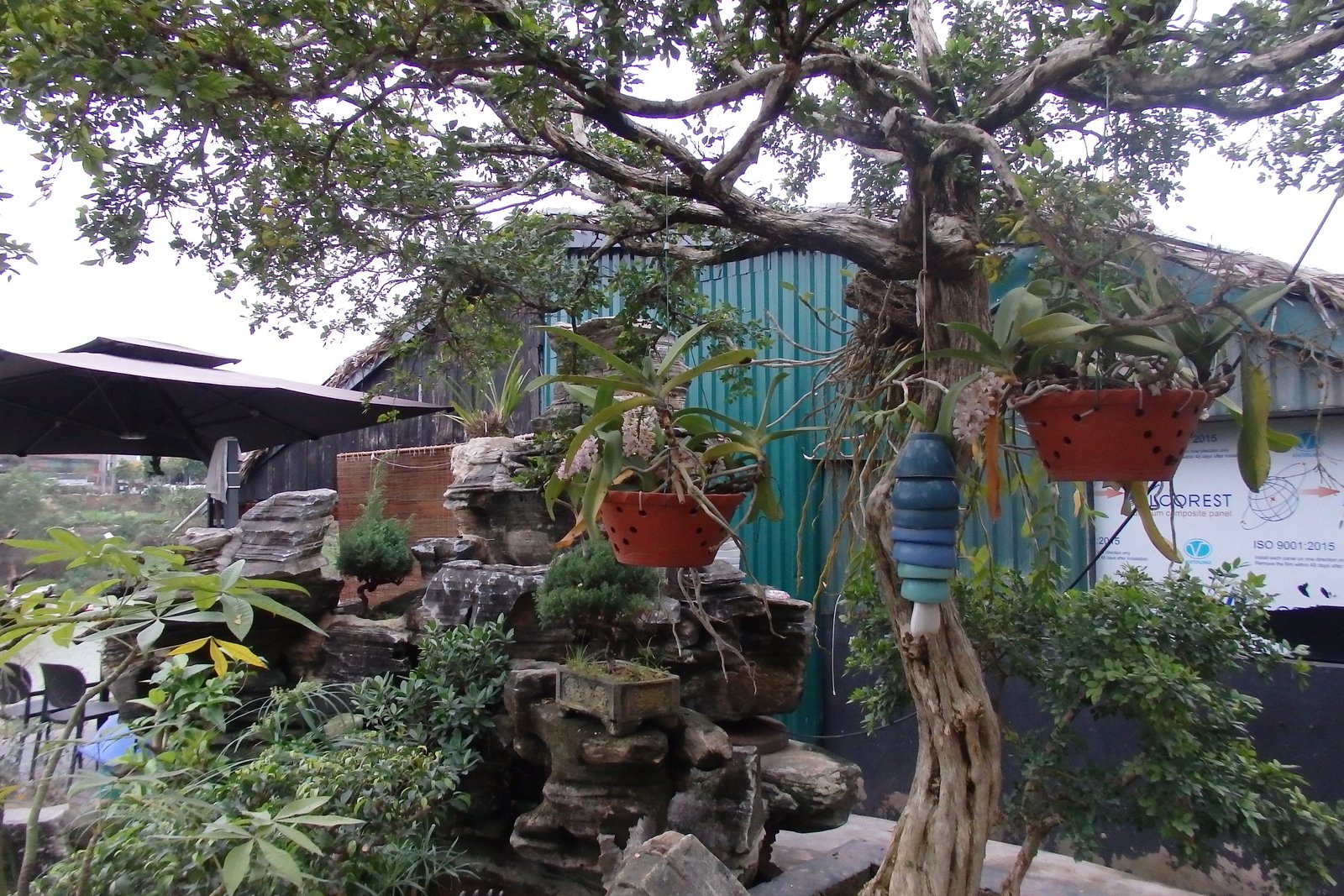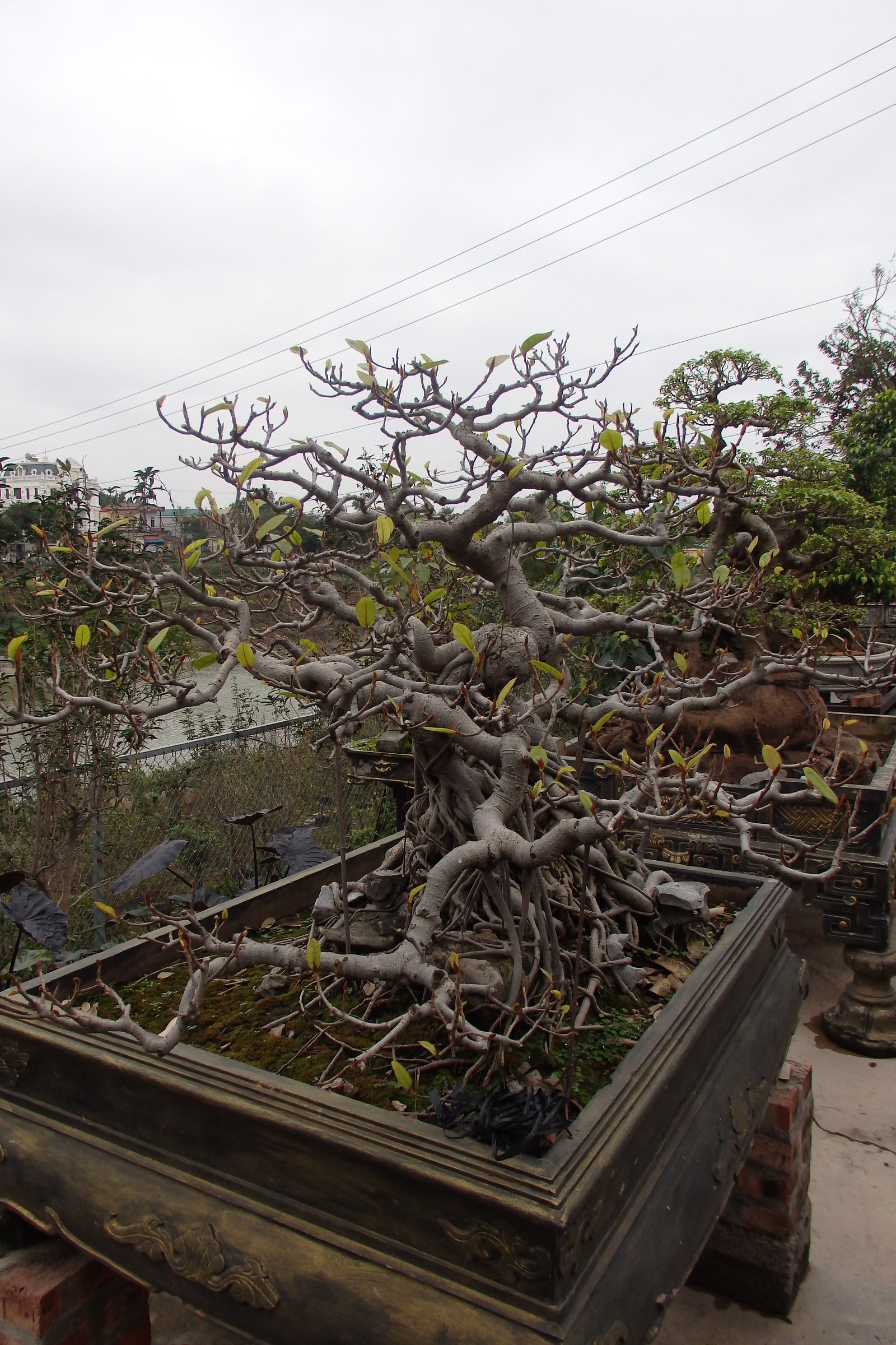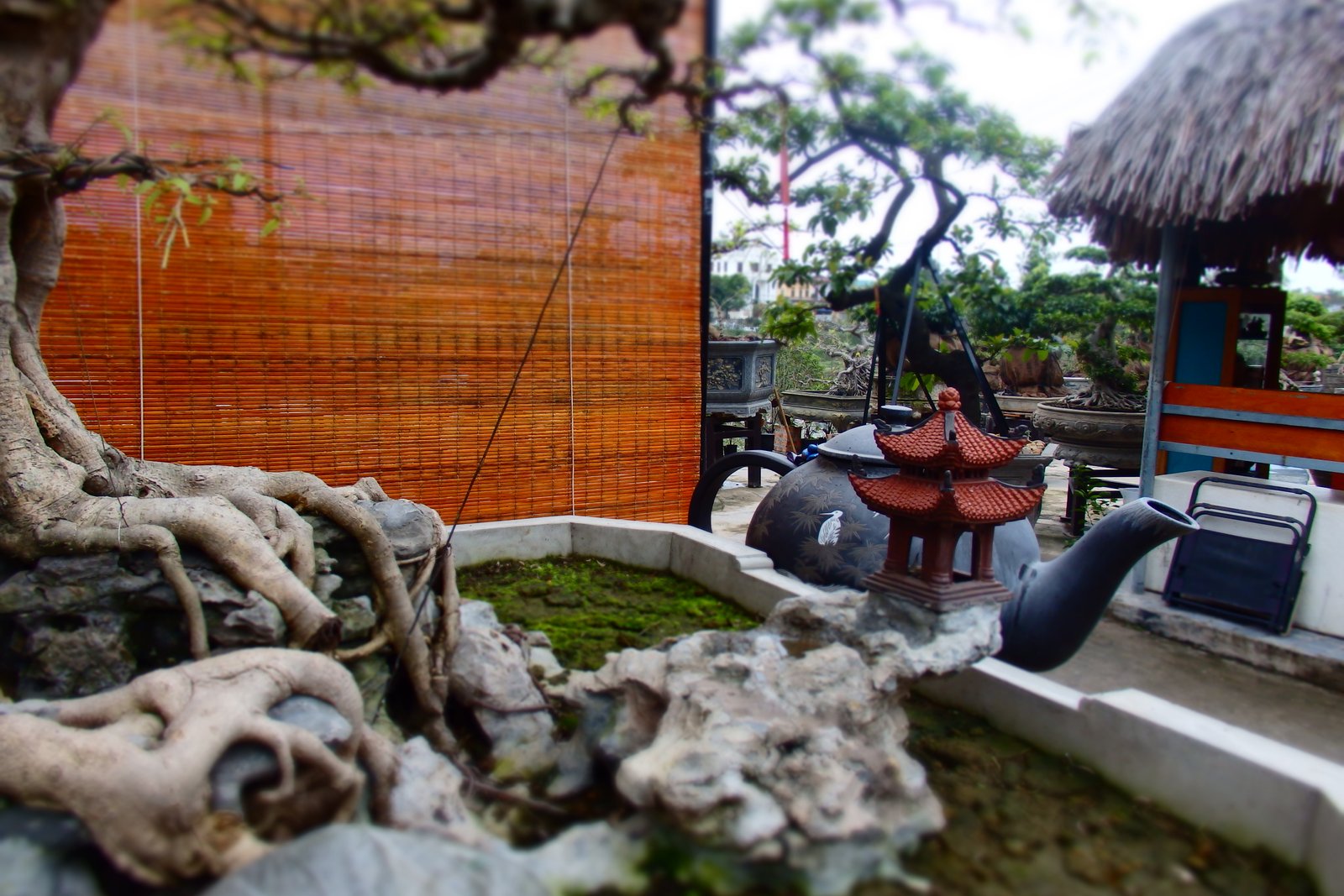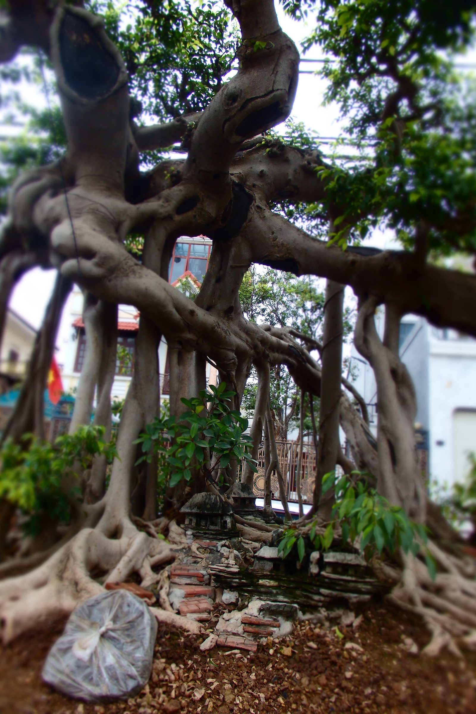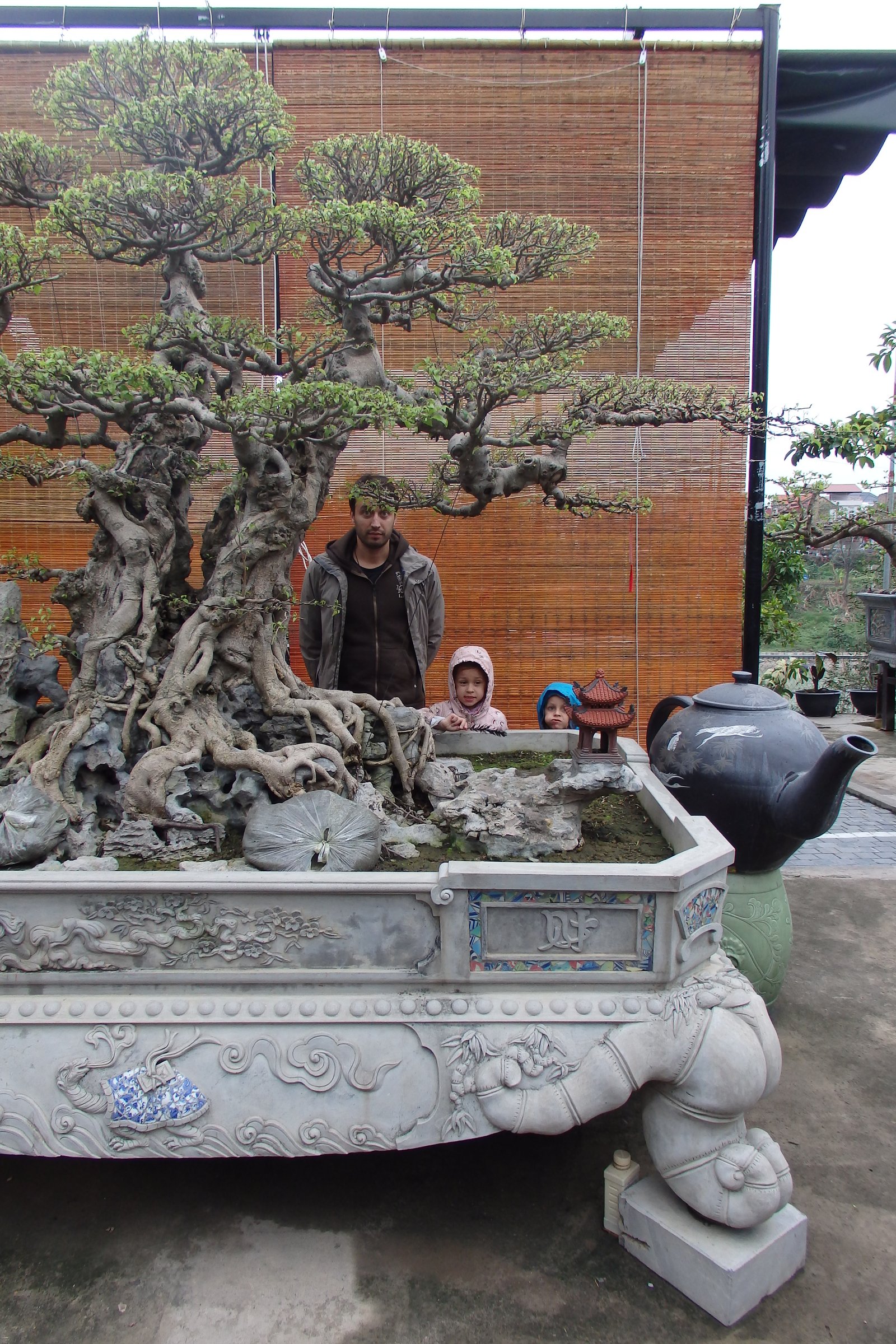 Wychodząc z muzeum garncarstwa przeszliśmy zaciekawieni na drugą stronę ulicy, gdzie rzuciły nam się w oczy właśnie wspomniane drzewa sztucznie skarłowacone. Ale tutaj właśnie wchodzi na scenę wietnamski styl przygotowywania tychże. W odróżnieniu od Japońskiego – tego, który pierwszy przychodzi na myśl, perfekcyjnego, ułożonego, opanowanego, eleganckiego – wietnamski styl miniaturyzacji drzew charakteryzuje się większą „naturalnością”. Drzewka są bardziej rozrośnięte, bardziej chaotyczne, często występujące w grupkach, a także ułożone są w kompozycje z bieżącą wodą i układami skalnymi – a do tego z umieszczonymi figurkami w scenki rodzajowe, lub sprytnie poukrywane niczym elfy w lesie. Do tego te drzewka przyjmują rozmiary naturalnych drzew, ale są umieszczone w zdobionych donicach – przypuszczam, że są to jedyne rzeczy, których Wietnamczycy nie przewiozą na skuterach (chociaż teraz może przeczyta to ktoś, kto będzie chciał mi udowodnić, że się mylę?).