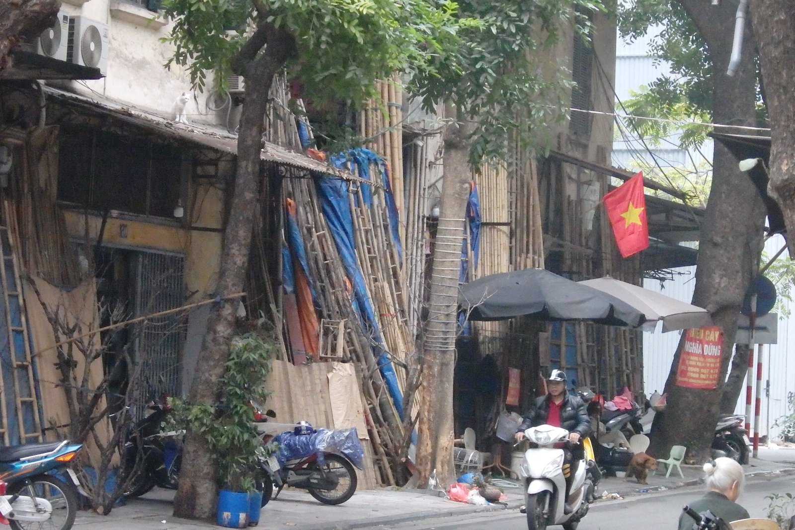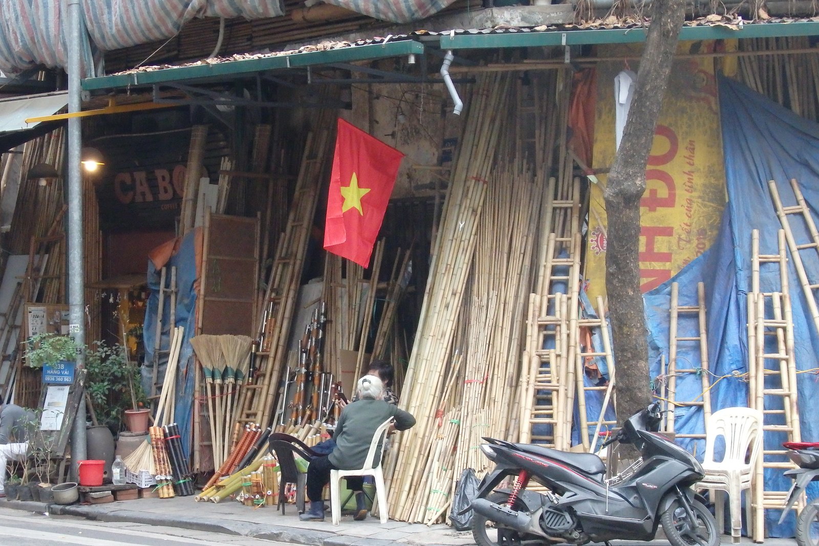 Bambus od wieków jest jednym z głównych materiałów budowlanych, w tym używany do wytwarzania narzędzi, mebli i wielu innych produktów. A właśnie różnorodność produktów prezentowała pewna mała uliczka w Hanoi – P. Hàng Vải. Tutaj wychodzi charakterystyka krajów azjatyckich jeśli chodzi o umiejscowienie sklepów – występują one w grupach. Potrzebujesz elektroniki? Idź na tę i tę ulicę – w tym masz 5 sklepów obok siebie sprzedających nagłośnienie, 10 sprzedających oświetlenie, 4 elektroników, 5 z zabawkami elektronicznych i tak dalej. Podobnie jest z innymi produktami – papiernicze – cała ulica sklepów papierniczych, naczynia miedziane – dwie ulice zapełnione sklepami i straganami z garczkami i patelniami. I tak to wygląda, więc gdy trafiliśmy na ulicę pełną drabin z bambusa, mioteł z bambusa, krzesełek, ławeczek, stolików, półeczek czy nawet samych badyli bambusowych – musieliśmy się nią przejść i porobić kilka zdjęć.