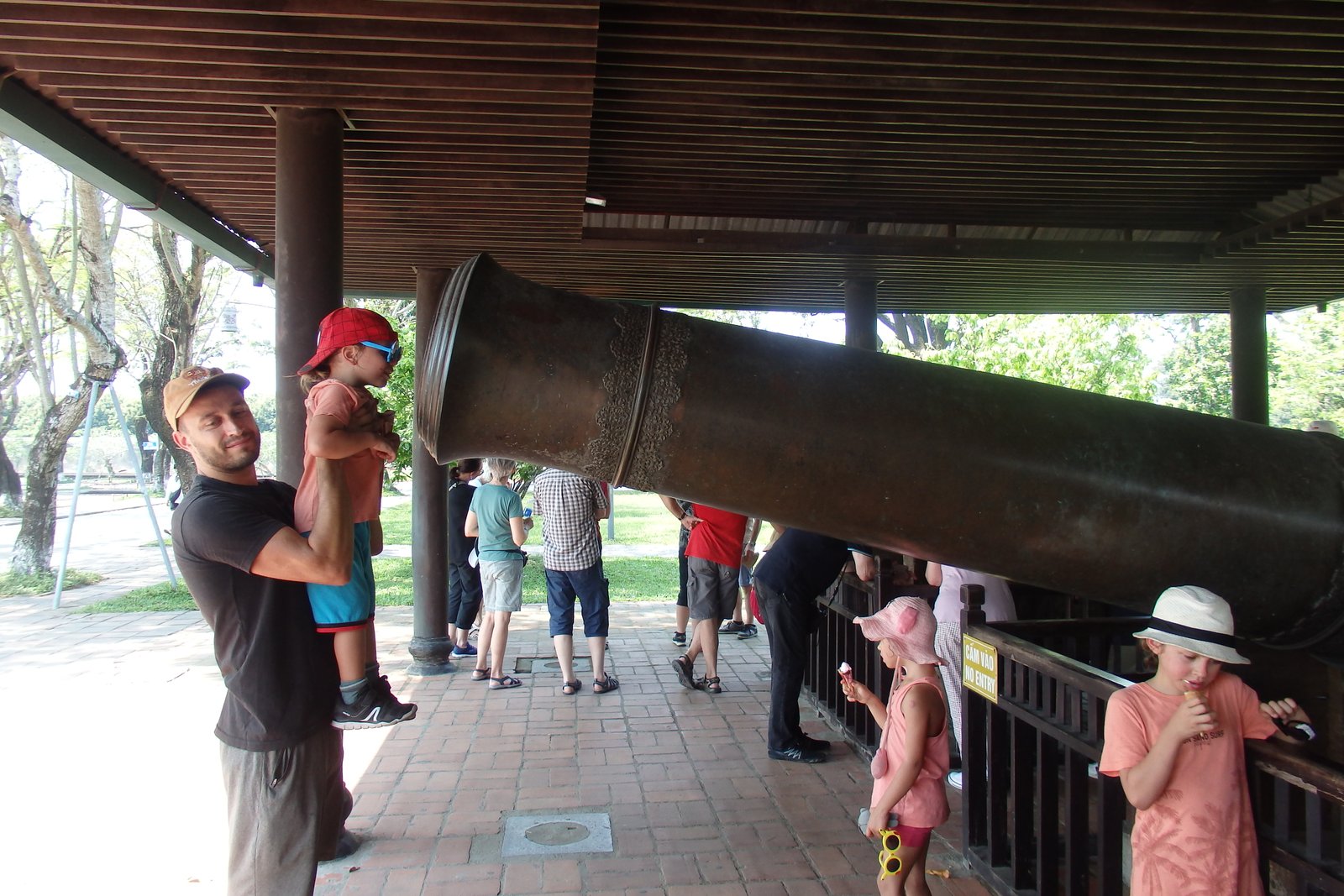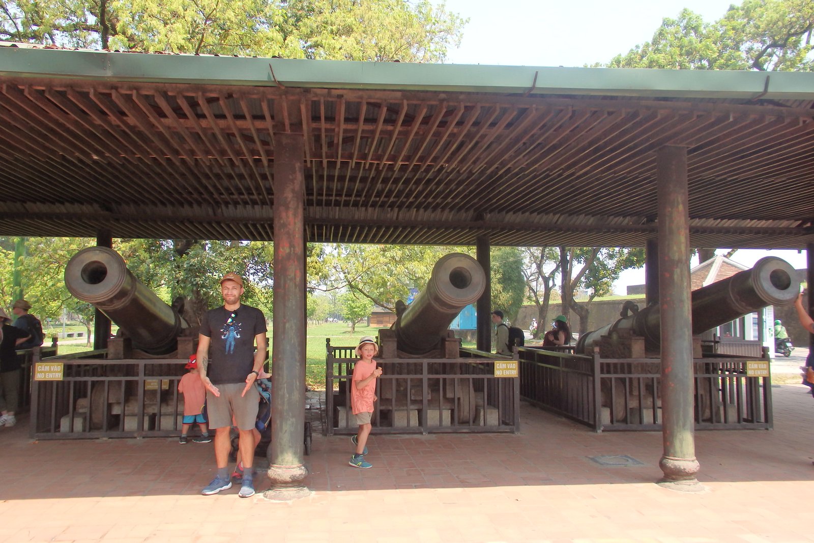 Zaraz za bramą wita nas wiata z działami imponujących rozmiarów. Jest to 9 Świętych Armat (w liczbie 4) – zwane „dziewięciu najwyższych dowódców armii, których majestat jest majestatem geniuszy, którym nic nie może się oprzeć” (to tłumaczenie z wietnamskiego na francuski, a później na język polski), więc muszą robić wrażenie. Nie mogliśmy się oprzeć i załadowaliśmy dzieci do wystrzału, ale żadne z nas nie miało przy sobie zapalniczki, by odpalić lont, więc ruszyliśmy w stronę kasy biletowej do wewnętrznej części.