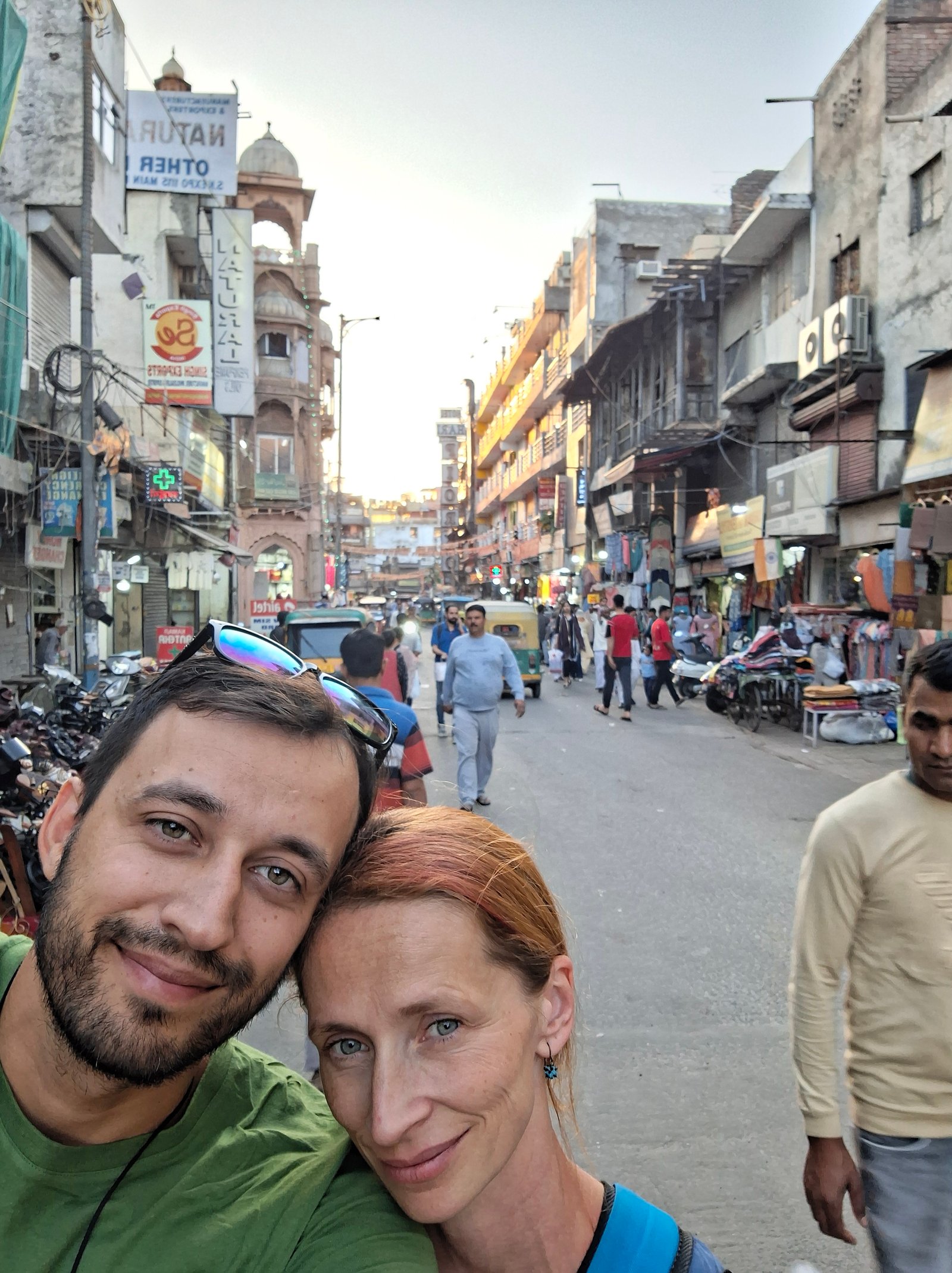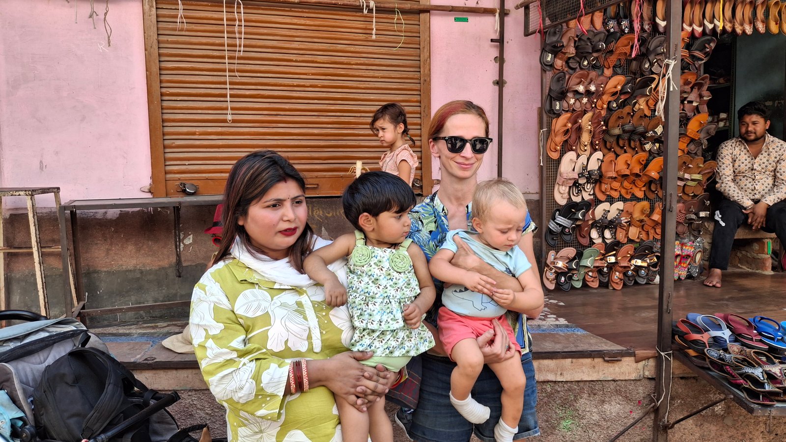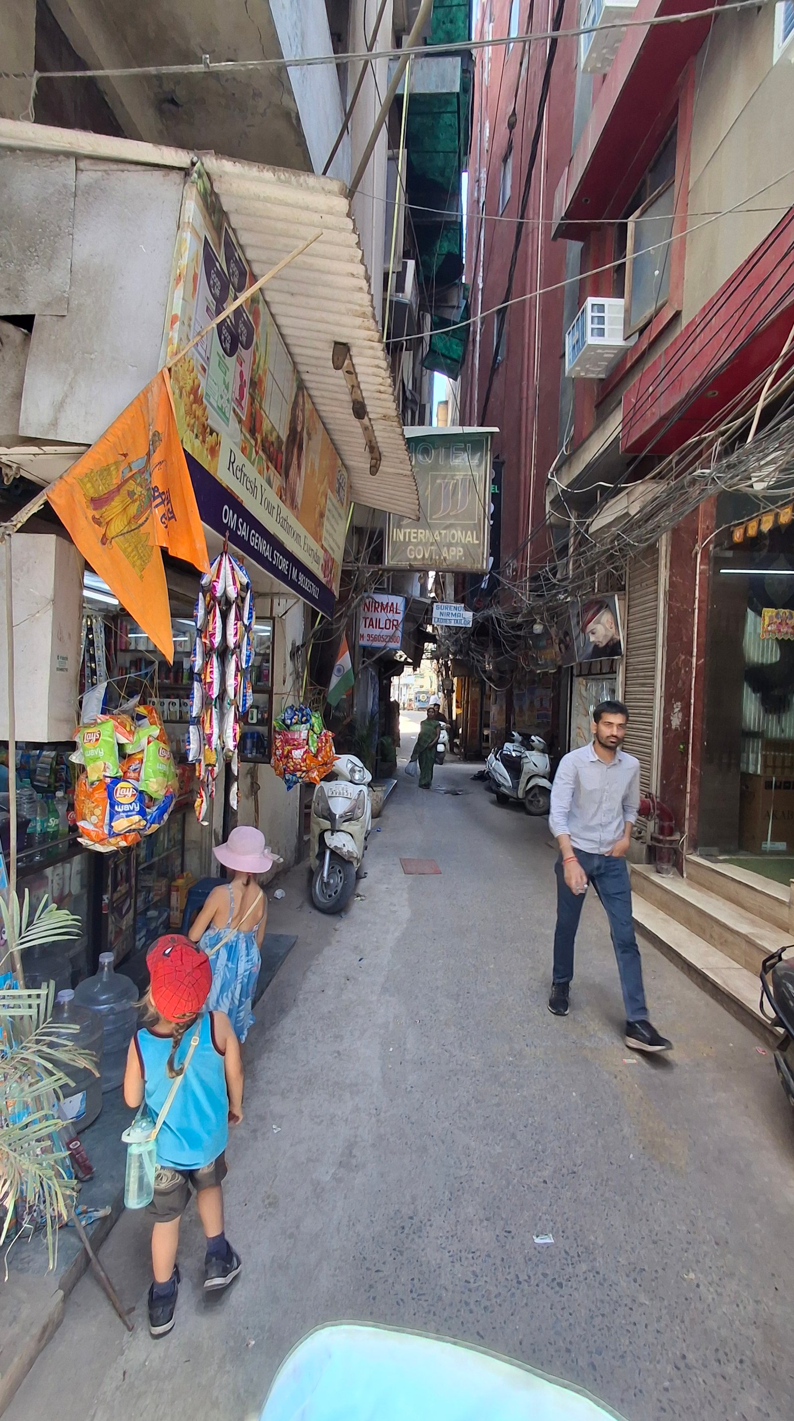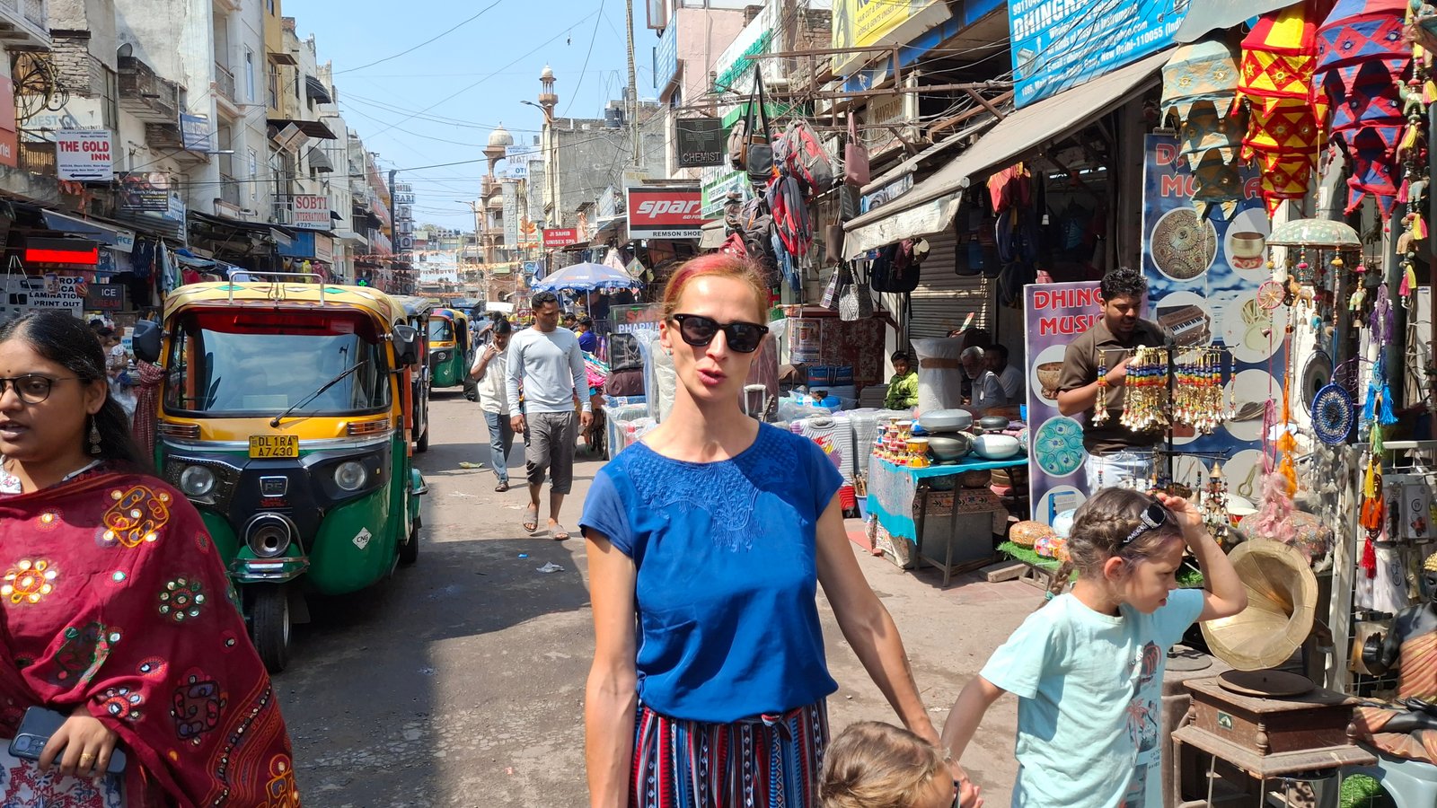 W ramach wysyłania pamiątek, mama poprosiła o kolorową suknię, więc takich przybytków również sporo zwiedziłem. Pierwszego dnia zaś, gdy wszyscy jeszcze spali, poza Tamarą, która postanowiła, że nie ma takiego odsypiania podróży, wyszedłem z nią na spacer. Zabrałem ją w nosidło i robiłem pierwszy obchód bazaru. Podczas spaceru zaczął mi towarzyszyć hindus, z którym uciąłem sobie małą pogawędkę. Stwierdził, że zdecydowanie za długo zaplanowaliśmy na pobyt w Nowym Delhi (uważamy inaczej), ale też tak sprytnie poszedł ze mną, że aż zaprowadził mnie do sklepu z tkaninami (wręcz całego centrum handlowego), najwyraźniej sądząc, że zdecyduję się na jakikolwiek zakup belki materiału bez zatwierdzenia od żony (naiwniak).