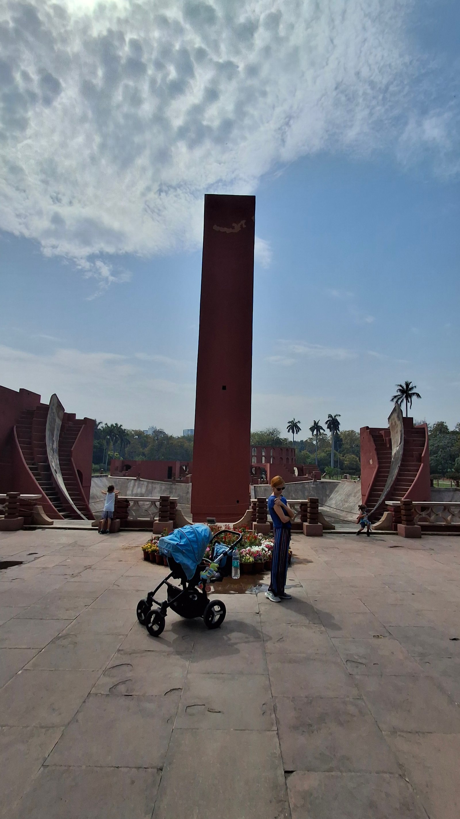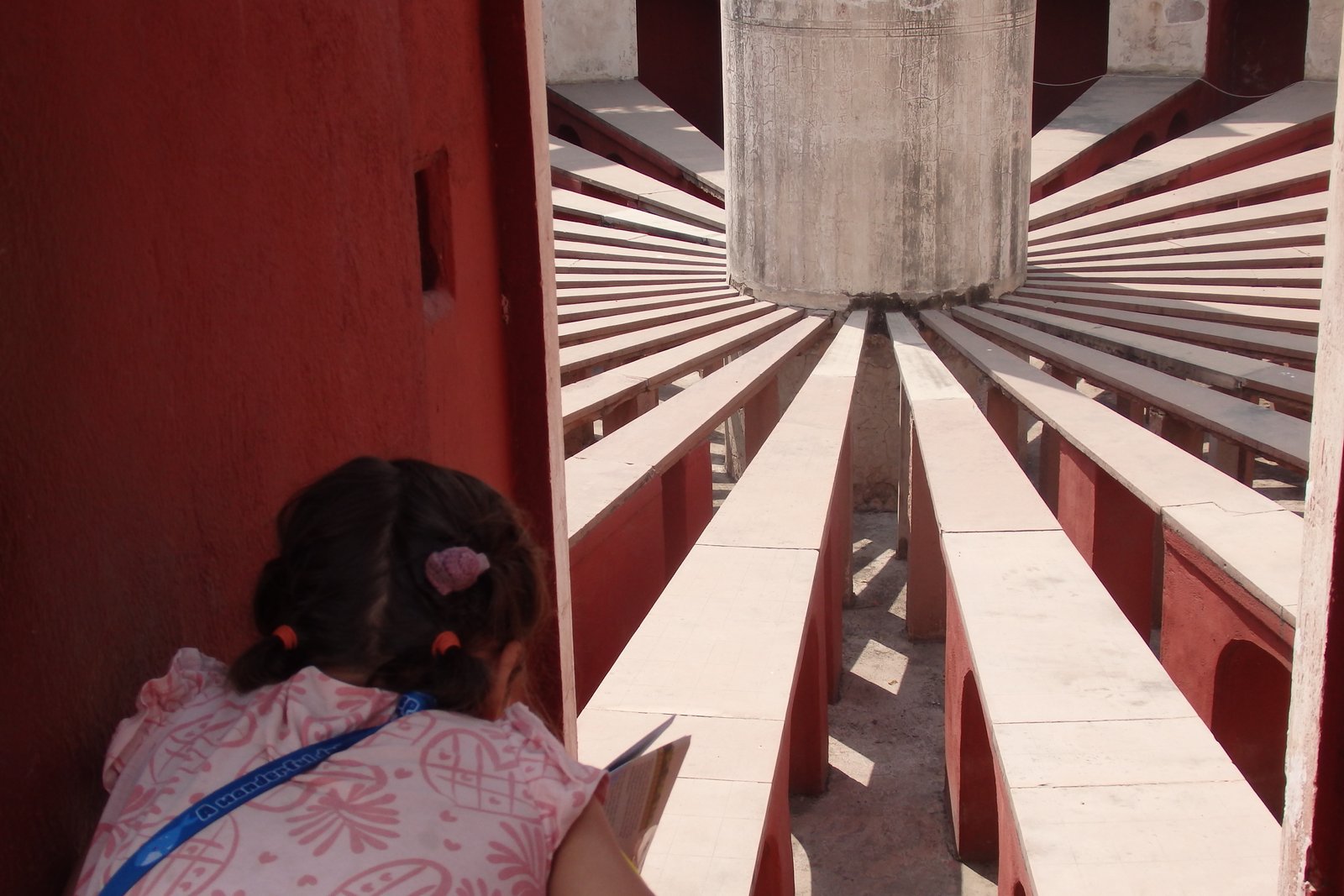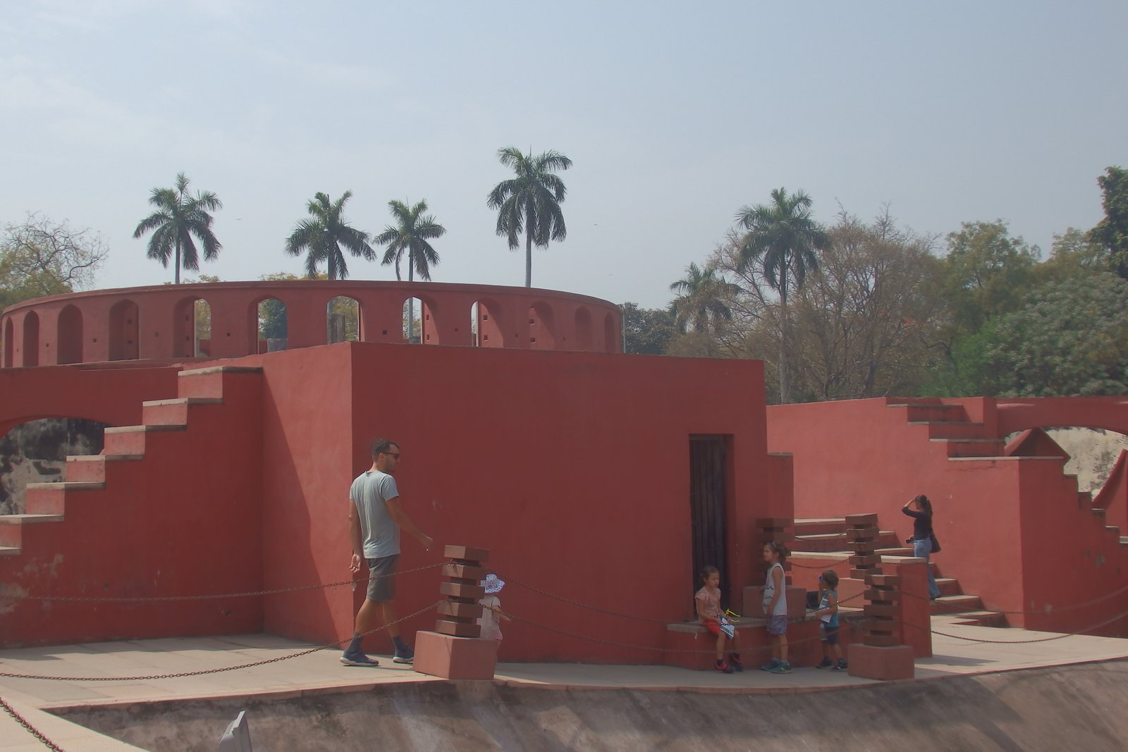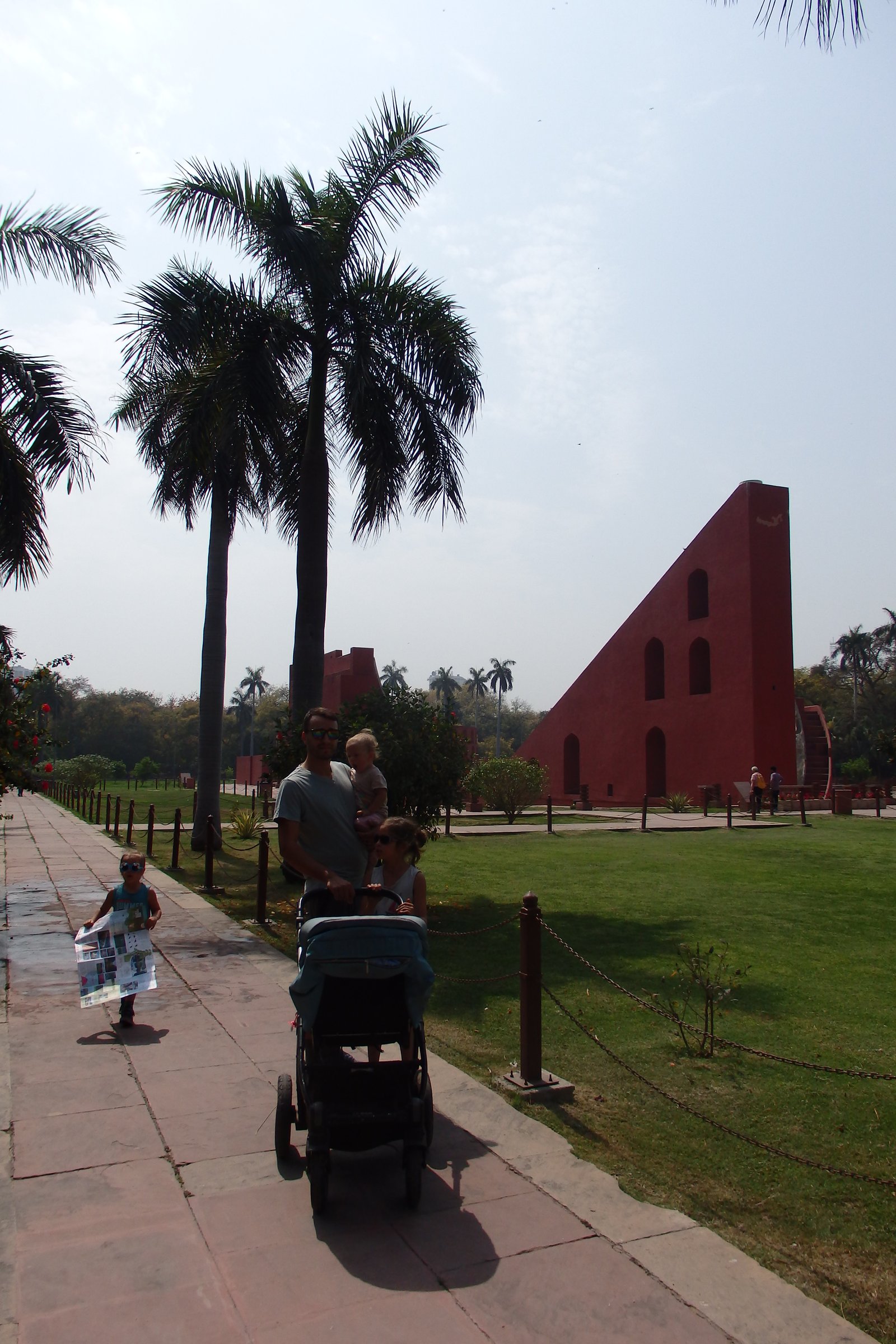 No, to naukową część mamy za sobą – nie było tak źle, nie? Przyjechaliśmy na miejsce mając pojęcie, że to „obserwatorium astronomiczne”, ale bez głębszej wiedzy czego się spodziewać i na co patrzymy. A było co podziwiać – rzecz jasna dla dzieci to wyglądało jak wielki plac zabaw – na niektóre instrumenty można było wejść, ale wszystkie niezabezpieczone krawędzie i fragmenty trochę nas przerażały, dlatego staraliśmy się trzymać je w okolicach poziomu gruntu. Wchodząc można wynająć lokalnego przewodnika, by poopowiadał o instrumentach, ale my tego nie zrobiliśmy (znów obawa, że nie będziemy w stanie się skupić z dziećmi) – osobiście trochę żałuję, bo tablice informacyjne przy konstrukcjach nie były pomocne. W ogóle jest tu miejsce, by zrobić coś w stylu „zeskanuj kod QR by zobaczyć animację jak się z takiego narzędzia korzysta”. Może ktoś ma kontakty i podrzuci ten pomysł zarządcy Jantar Mantar? Ale nawet jak się nie ma pojęcia jak to wszystko działa – to warto tam zajechać – fikuśność tych budowli i ich niesamowite przeznaczenie budzi respekt. Rzecz nie do zobaczenia poza Indiami.