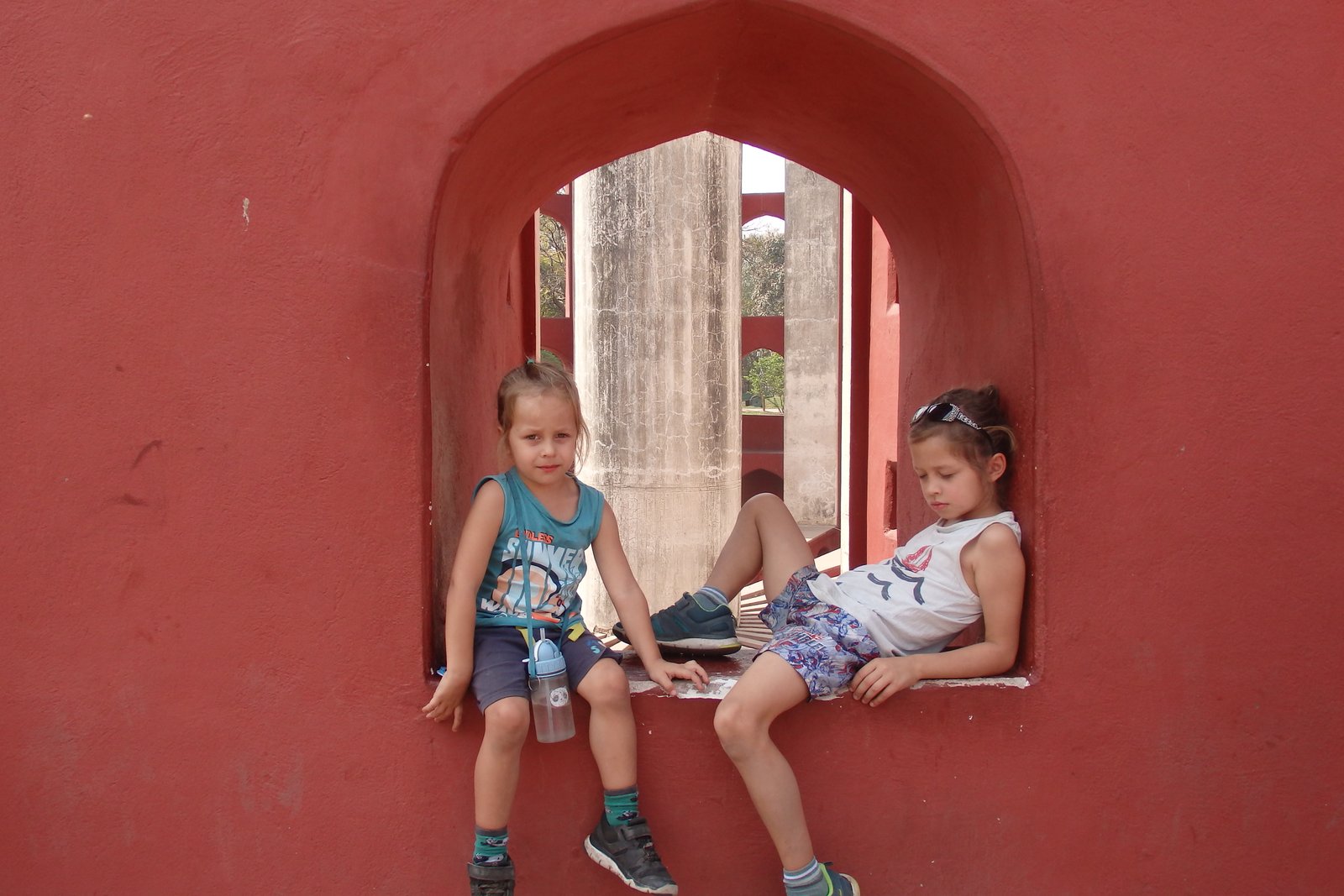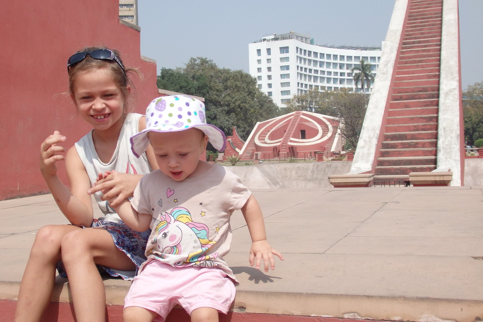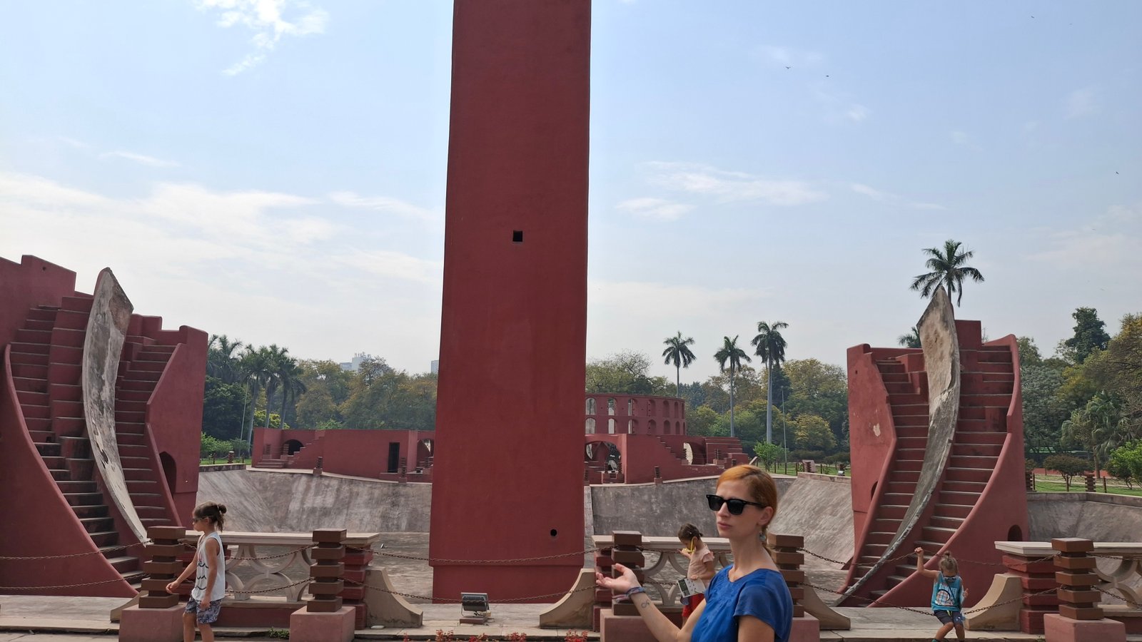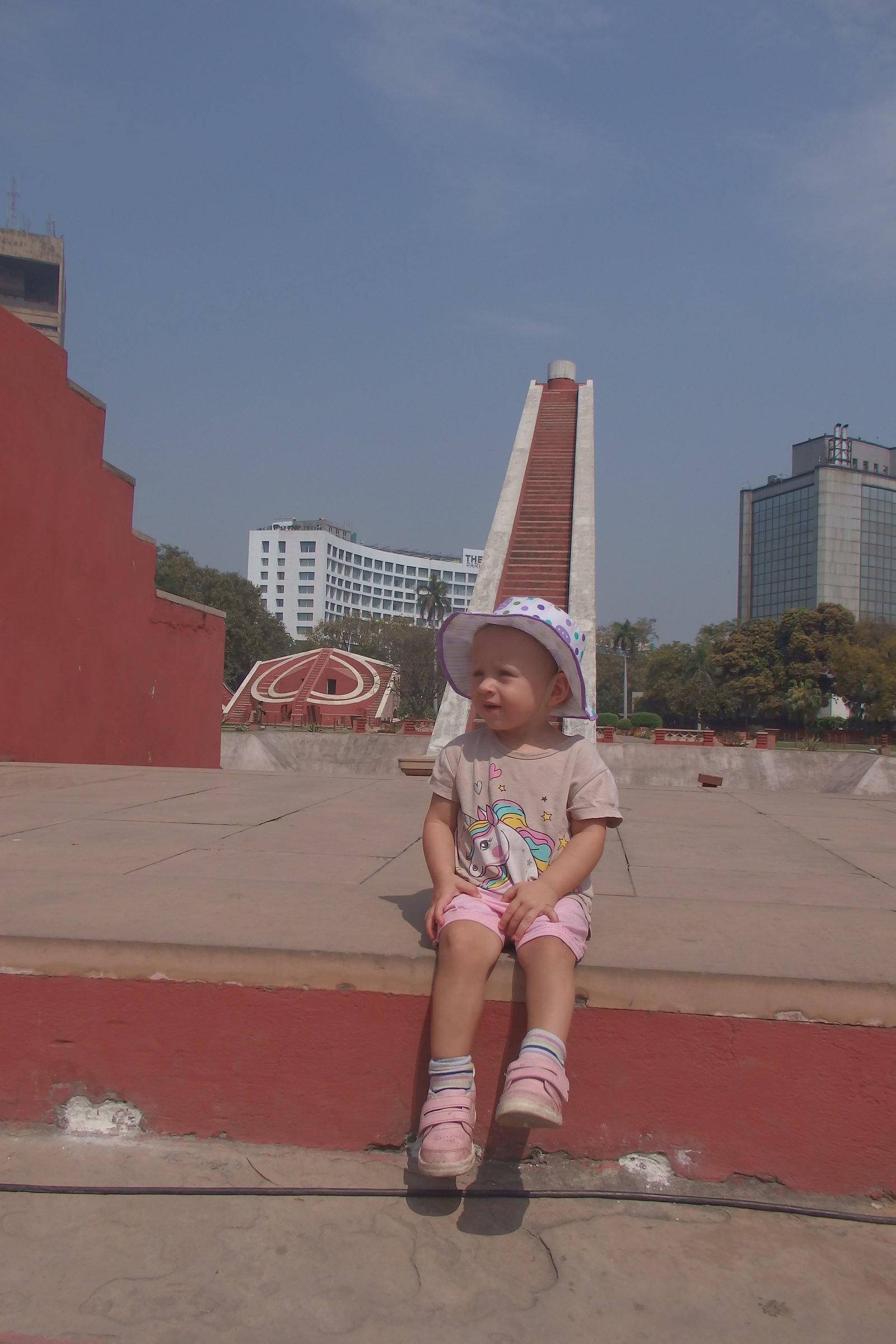 No, to naukową część mamy za sobą – nie było tak źle, nie? Przyjechaliśmy na miejsce mając pojęcie, że to „obserwatorium astronomiczne”, ale bez głębszej wiedzy czego się spodziewać i na co patrzymy. A było co podziwiać – rzecz jasna dla dzieci to wyglądało jak wielki plac zabaw – na niektóre instrumenty można było wejść, ale wszystkie niezabezpieczone krawędzie i fragmenty trochę nas przerażały, dlatego staraliśmy się trzymać je w okolicach poziomu gruntu. Wchodząc można wynająć lokalnego przewodnika, by poopowiadał o instrumentach, ale my tego nie zrobiliśmy (znów obawa, że nie będziemy w stanie się skupić z dziećmi) – osobiście trochę żałuję, bo tablice informacyjne przy konstrukcjach nie były pomocne. W ogóle jest tu miejsce, by zrobić coś w stylu „zeskanuj kod QR by zobaczyć animację jak się z takiego narzędzia korzysta”. Może ktoś ma kontakty i podrzuci ten pomysł zarządcy Jantar Mantar? Ale nawet jak się nie ma pojęcia jak to wszystko działa – to warto tam zajechać – fikuśność tych budowli i ich niesamowite przeznaczenie budzi respekt. Rzecz nie do zobaczenia poza Indiami.