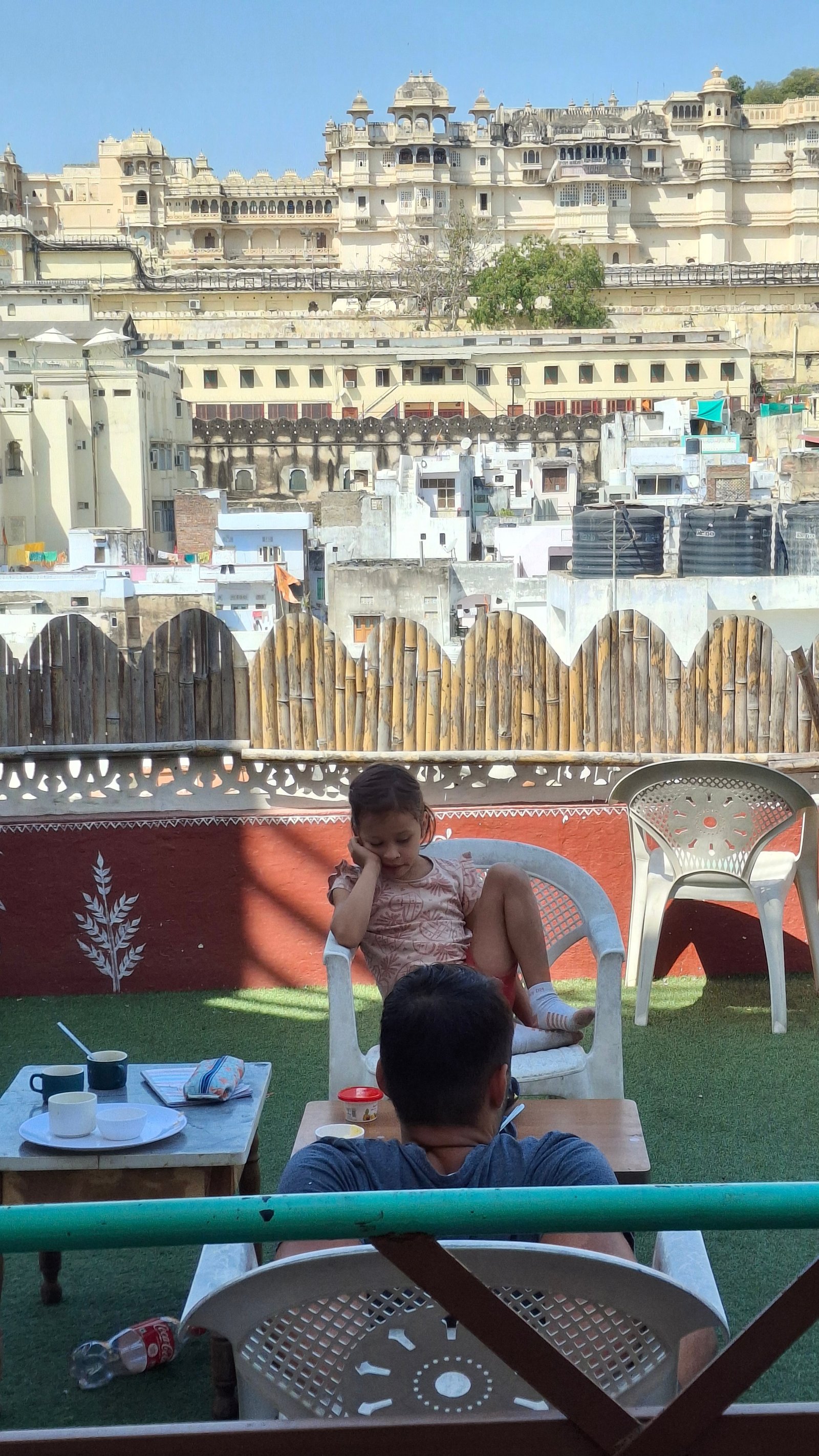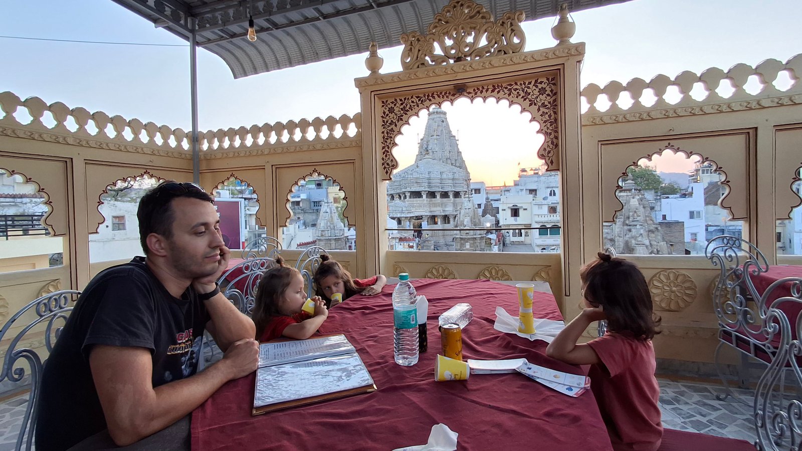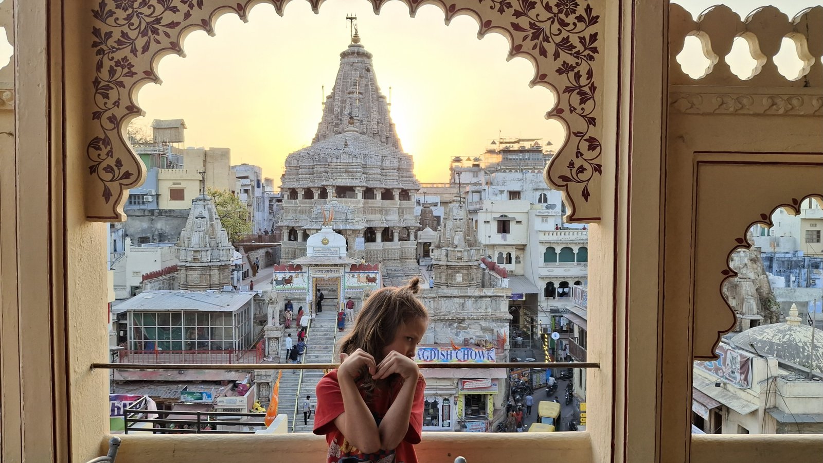Wybór podyktowany opiniami na google i ponaglaniem pustych żołądków padł na Mayur Cafe https://maps.app.goo.gl/4HxFVV7HH7CQ7kDt8. I to był strzał w dziesiątkę! Po pierwsze – jest to miejsce, gdzie Niebieska spróbowała po raz pierwszy Palak Paneer – szpinakowej pasty z serem typu feta-twarożek i momentalnie się w nim zakochała. Po drugie – mieli do dyspozycji NIEPIKANTNE jedzenie dla dzieci. Po trzecie – z ich dachu rozpościerał się widok na pobliską świątynię, widok który wraz z ramą stworzoną przez architektoniczną część (okno bez ściany) podziwiać możecie jako okładkę tego wpisu. Widok niesamowity i upewniający nas w tym, że Udaipur ma dla nas wiele do zaoferowania.