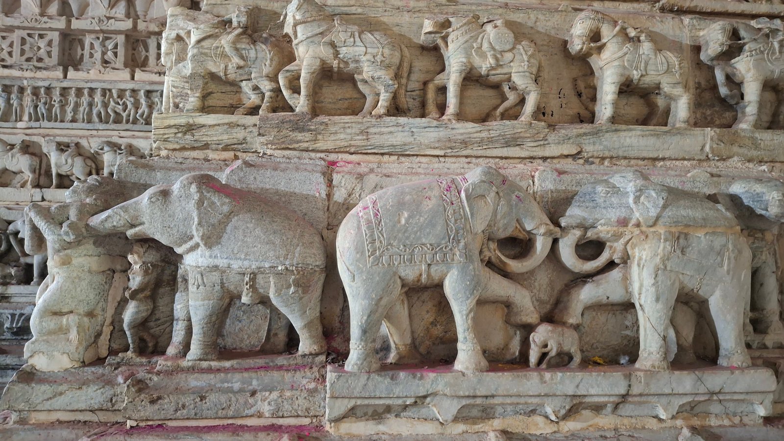 A warto wejść, ponieważ najwyraźniej tam właśnie sobie rzeźbiarze pozwalali na więcej po wyrzeźbieniu tysiąc pierwszego słonia w Świątyni Jagdish – tutaj całkiem frywolnie oddawali to, co się dzieje w zaciszach domostw i chyba – co niebiańskie zastępy robią, gdy nikt nie patrzy… Tak, tam są sprośne, szokujące, zabawne i szalone rzeźbienia.