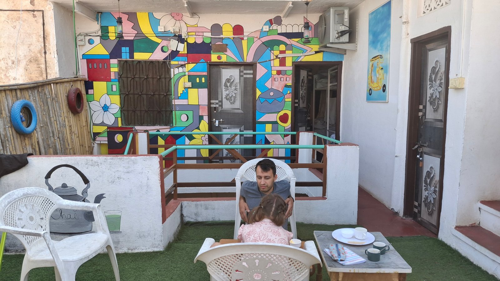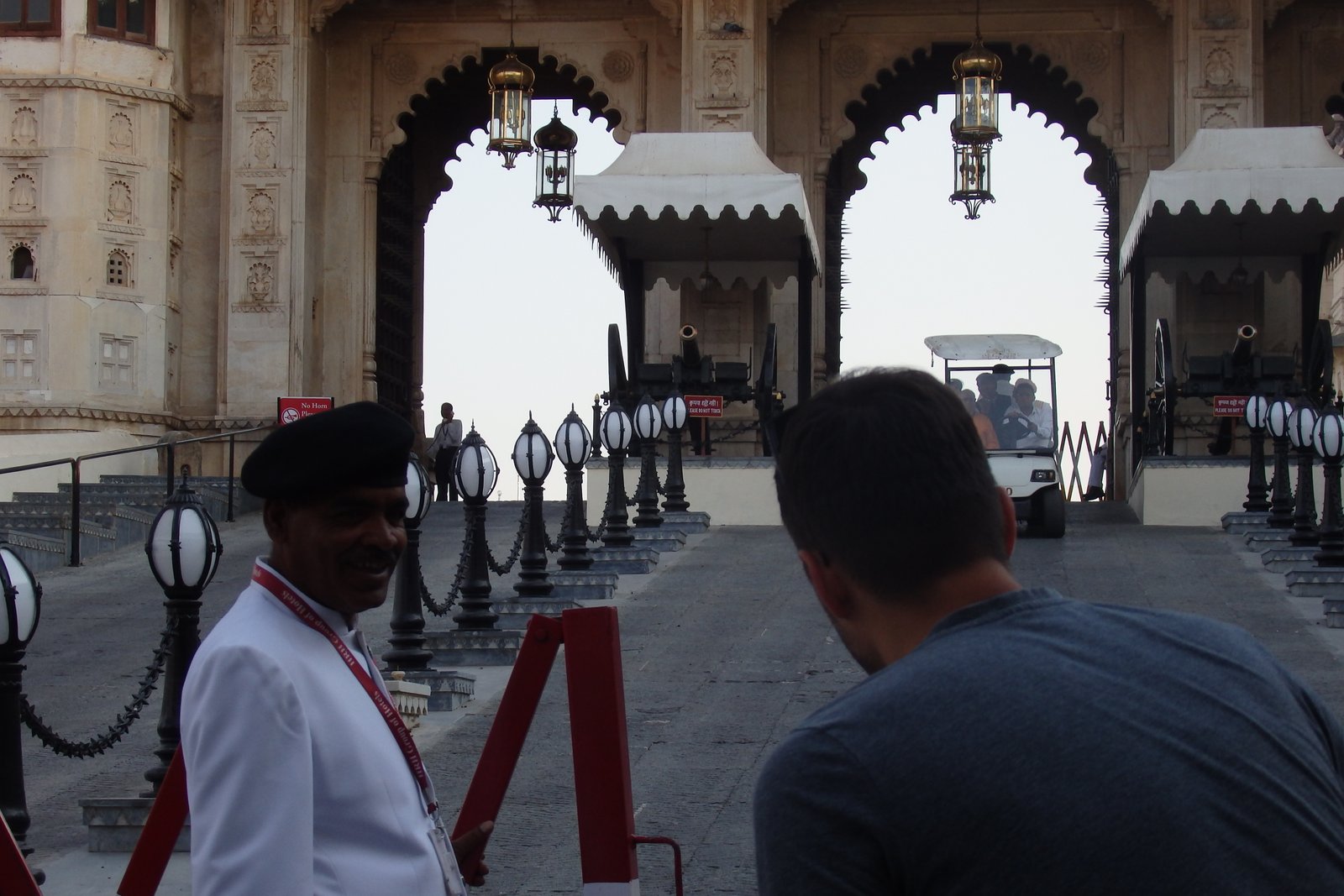 Wylądowaliśmy na lotnisku znajdującym się około 20 kilometrów od centrum. Zamówiliśmy Ubera (mieli nawet swoje stanowisko i to z młodymi pracownikami, z którymi dawało się dogadać po angielsku). No, może z tym „dogadać” to lekko przesadziłem – w aplikacji wpisałem adres naszego hostelu, a oni mi coś próbowali tłumaczyć, że kierowca nie może tam podjechać czy coś. Dla nas to nie pierwszyzna – wszak nasza baza wypadowa w Delhi również jest położona w jakiejś ciasnej uliczce, że bez skutera się nie zbliżaj. Ale nie – okazało się, że CAŁE stare miasto jest wyłączone z ruchu samochodowego. To znaczy – czysto teoretyczne, bo samochodów było tam więcej jak dużo, jednak porównywalnie mniej niż w stolicy. Ale najwyraźniej wjazd był tylko dla wybranych/mieszkańców. Koniec końców dotarliśmy do położonego na obrzeżach Starego Miasta parkingu, albo lepiej by było to nazwać „stacją przesiadkową” – miejsca, gdzie kierowca przerzucił nas do tuk-tuka. Niestety, tuk-tuk nie był wliczony w cenę z aplikacji, a co więcej – kierowca podyktował nam cenę „dla białego” i w ogóle nie był chętny do negocjacji. Odległość nie była jakaś wybitna – raptem 1.5 – 2 km, ale z całym tobołem, głodnymi dziećmi i ogólnym zmęczeniem upałem i podróżą, zaciskając zęby zapłaciłem i wpakowaliśmy się do pojazdu. Jedynym pocieszeniem był fakt, że ten tuk-tuk był rozmiaru bardzo zadowalającego, nie to co te Delhijskie malutkie bączki.