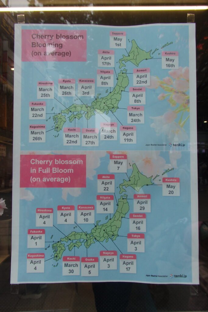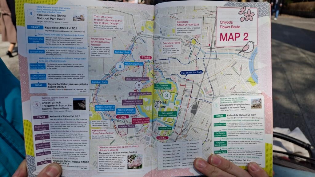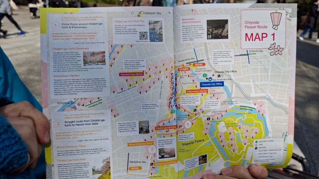 W informacji turystycznej znaleźliśmy mapkę, która pokazywała rejony kraju z podziałem na przewidywane terminy kwitnienia. Innym razem wpadła nam do rąk darmowa gazetka, w której załączona była mapka okolicy z zaznaczonymi drzewami wiśni i proponowanymi trasami spacerowymi (pan który je rozdawał otworzył nam od broszurę od razu na stronie w języku angielskim).
