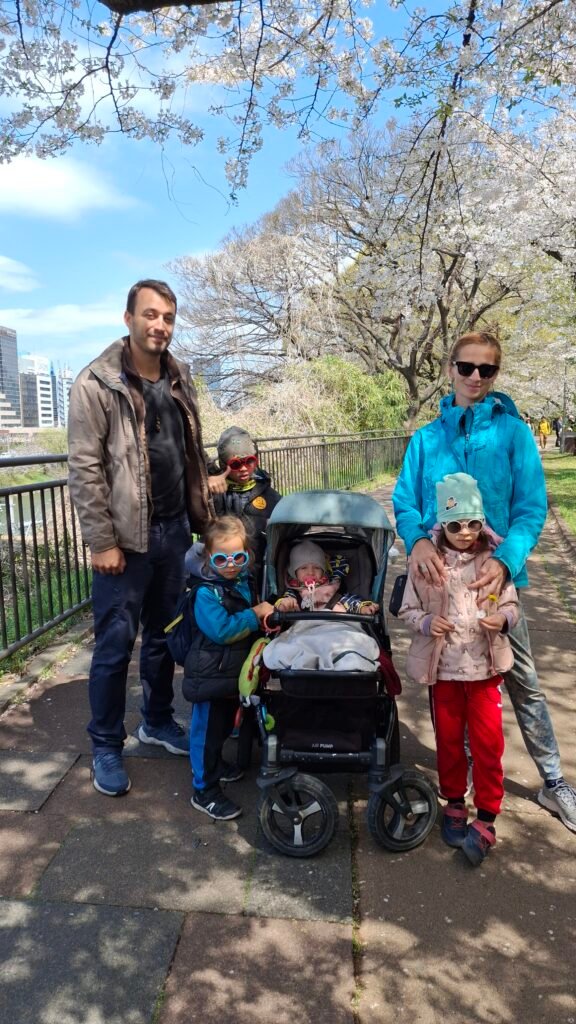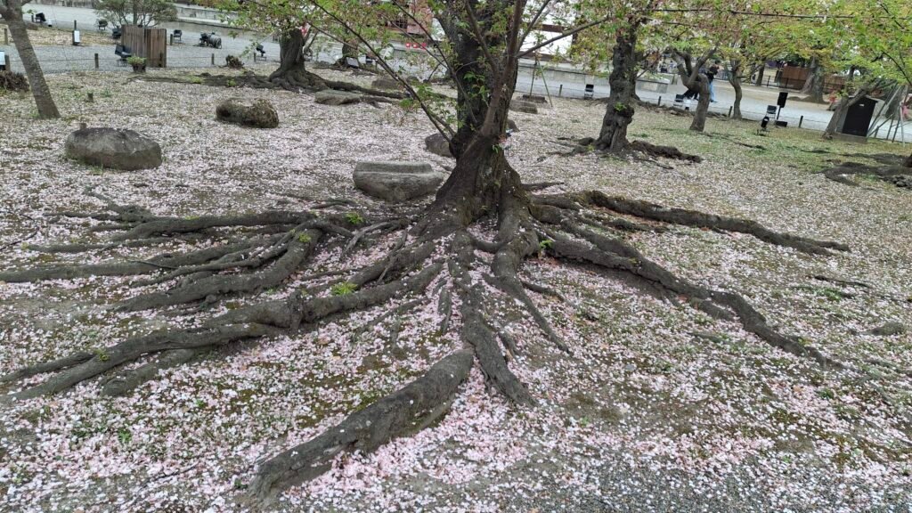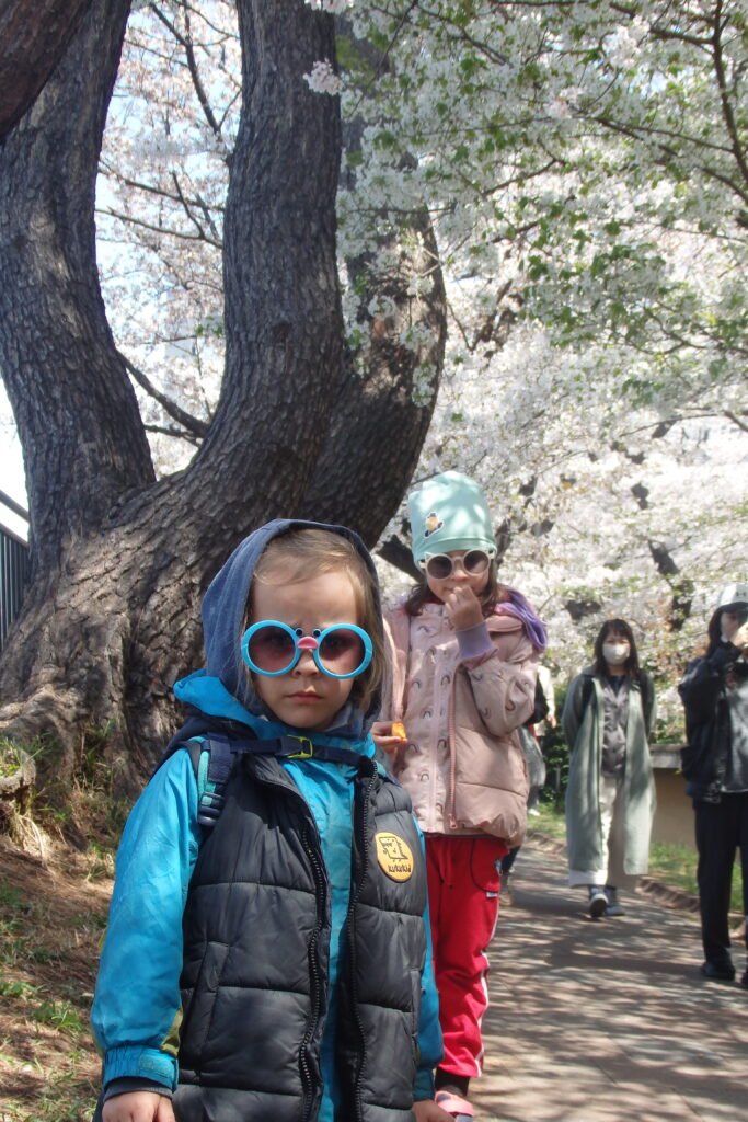 Zaraz po przejściu przez ruchliwą drogę i most, znaleźliśmy się na początku deptaka (a przynajmniej takie sprawiał wrażenie). Wiódł on wzdłuż wspomnianej rzeki Kandy, i był bosko obsadzony wiśniami z białymi płatkami i piknikującymi grupami japończyków . Nasza ścieżka keszowa wiodła daleko przed siebie, ale my w pewnym momencie odbiliśmy „w głąb lądu”.