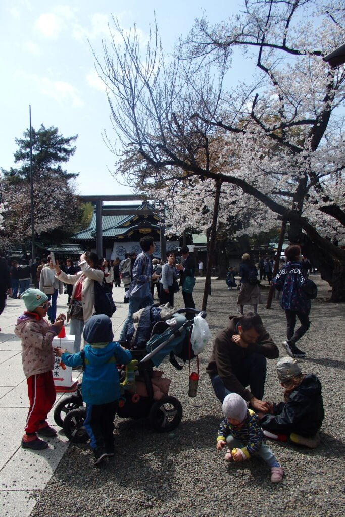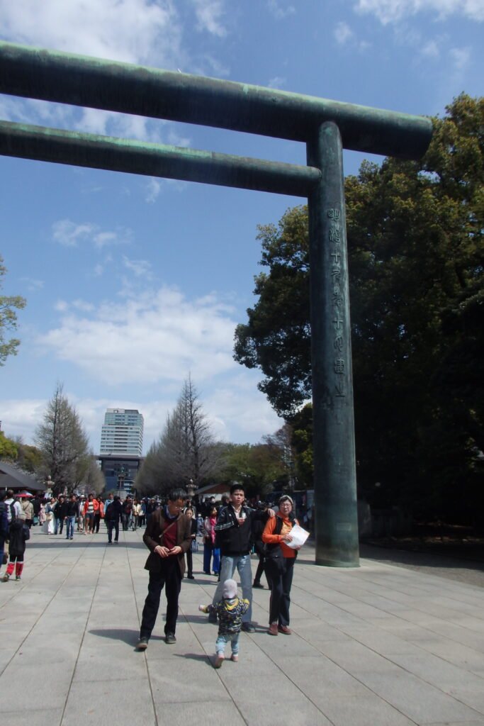 Dotarliśmy do ukrytego za murem fragmentem ogrodu (z ukrytym keszem rzecz jasna). Skorzystaliśmy z okazji i przeszliśmy przez jego centrum – które okazało się być świątynią szintoistyczna Yasukuni Jinja 靖國神社 – obsadzoną wiśniami w hołdzie poległych żołnierzy. Jest to dosyć nietypowa świątynia – jako jedna z niewielu ma swój portal Torii skierowany nie od strony południowej. Jest też źródłem kontrowersji – w tak zwanej Księdze Dusz, czyli liście umarłych, zapisanych jest 1068 postaci, które zostały skazane za zbrodnie przeciw ludzkości w Międzynarodowym Wojskowym Trybunale dla Dalekiego Wschodu (odpowiednik procesów norymberskich). Te Procesy Tokijskie same w sobie były kontrowersyjne, bo ludzie przydatni aliantom jakoś zdobywali immunitety (jak też było w przypadku nazistowskich naukowców) – ale zbaczamy z tematu. Dość powiedzieć, że każdorazowa wizyta polityków w tym miejscu kończy się napięciami społecznymi.