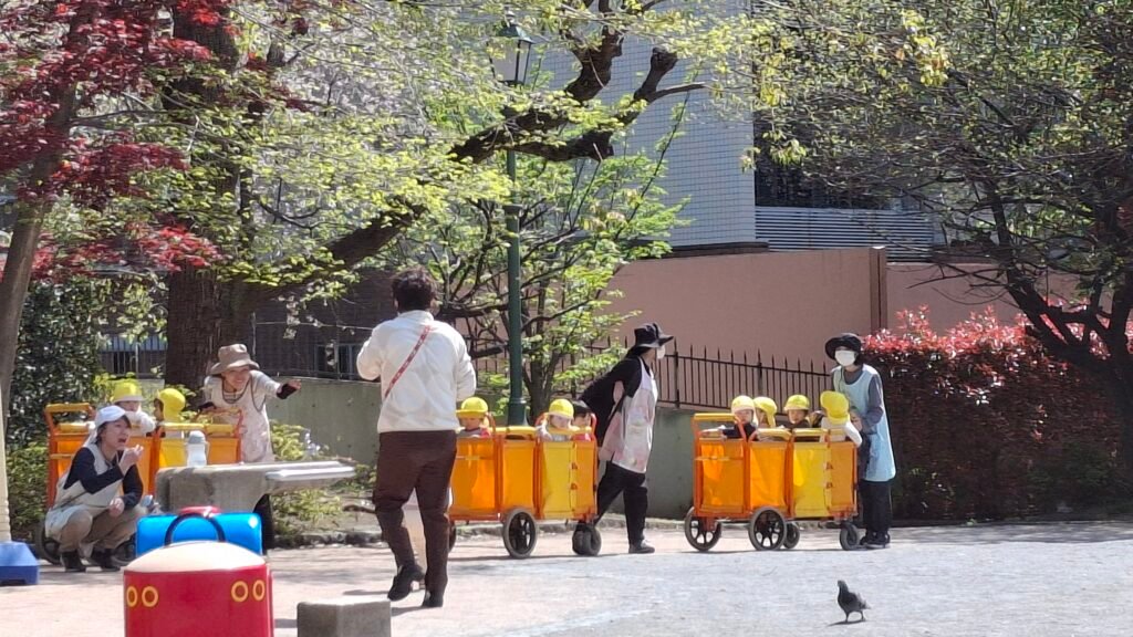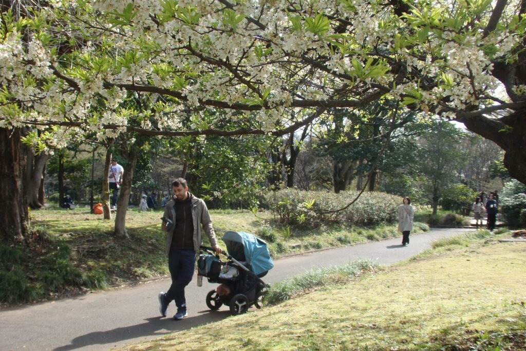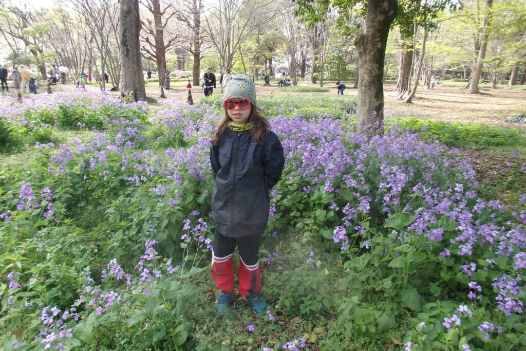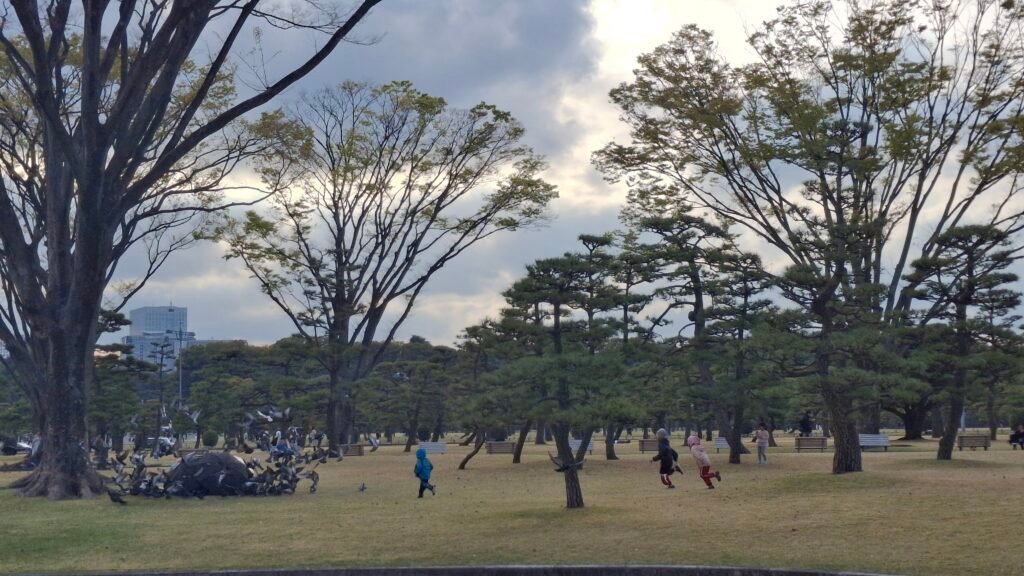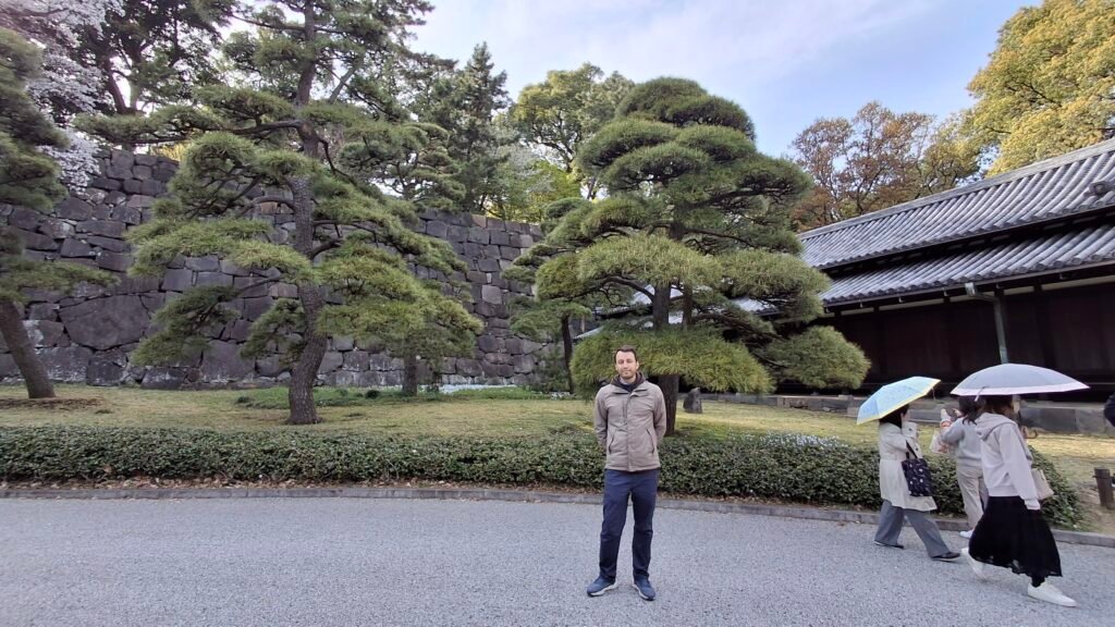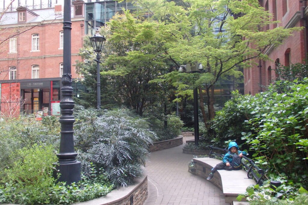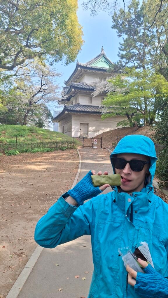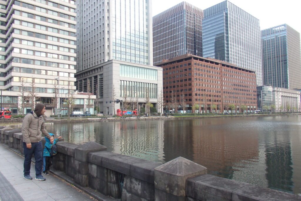 My skupiliśmy się na tak zwanym wschodnim ogrodzie. Jest to teren zielony urządzony w stylu Japońskiego Ogrodu (a to zaskoczenie). Charakteryzuje się tym, że ścieżki układają się w zawijasy, co ma stymulować odkrywanie nowych części ogrodu z każdym zakrętem. Panuje minimalizm: dużo przestrzeni, niewiele ozdobników, użycie kamieni poukładanych w fikuśne wzory, małe mostki (łącznik świata żywych i świata duchów), a do tego piasek, żwir i koniecznie roślinność, która dobrze wygląda o każdej pory roku. Harmonia jest tutaj właśnie hasłem-kluczem, zaś ogród powinien odwzorowywać w jakiś sposób lokalny krajobraz. Dzieciom bardzo się spodobały połacie kwiatów, zapachy wiosny i oczywiście poukrywane w niektórych miejscach skrytki. Zawarta wewnątrz murów pałacu przestrzeń pozwala na wytchnienie – zwolnienie, zanurzenie się w swoich przemyśleniach i zyskanie perspektywy w tak bardzo współczesnym mieście. Na samym wyjściu zaś zobaczyłem mały fragment jakieś budowli poniżej murów, która zagrała na melancholijnej strunie mojej duszy. Zrobiłem sobie w tym miejscu zdjęcie chociaż moje wewnętrzne Ja wołało „zatrzymaj się tu, zamieszkaj tutaj i zacznij tradycyjne rzemiosło japońskie” ruszyłem dalej. No ale mam czwórkę dzieci, więc nie mogłem ot tak porzucić wszystkiego i zmienić stylu życia. Ale kto wie co emerytura przyniesie? Chociaż jeśli wszystko pójdzie zgodnie z planem to przyniesie nam kampera.