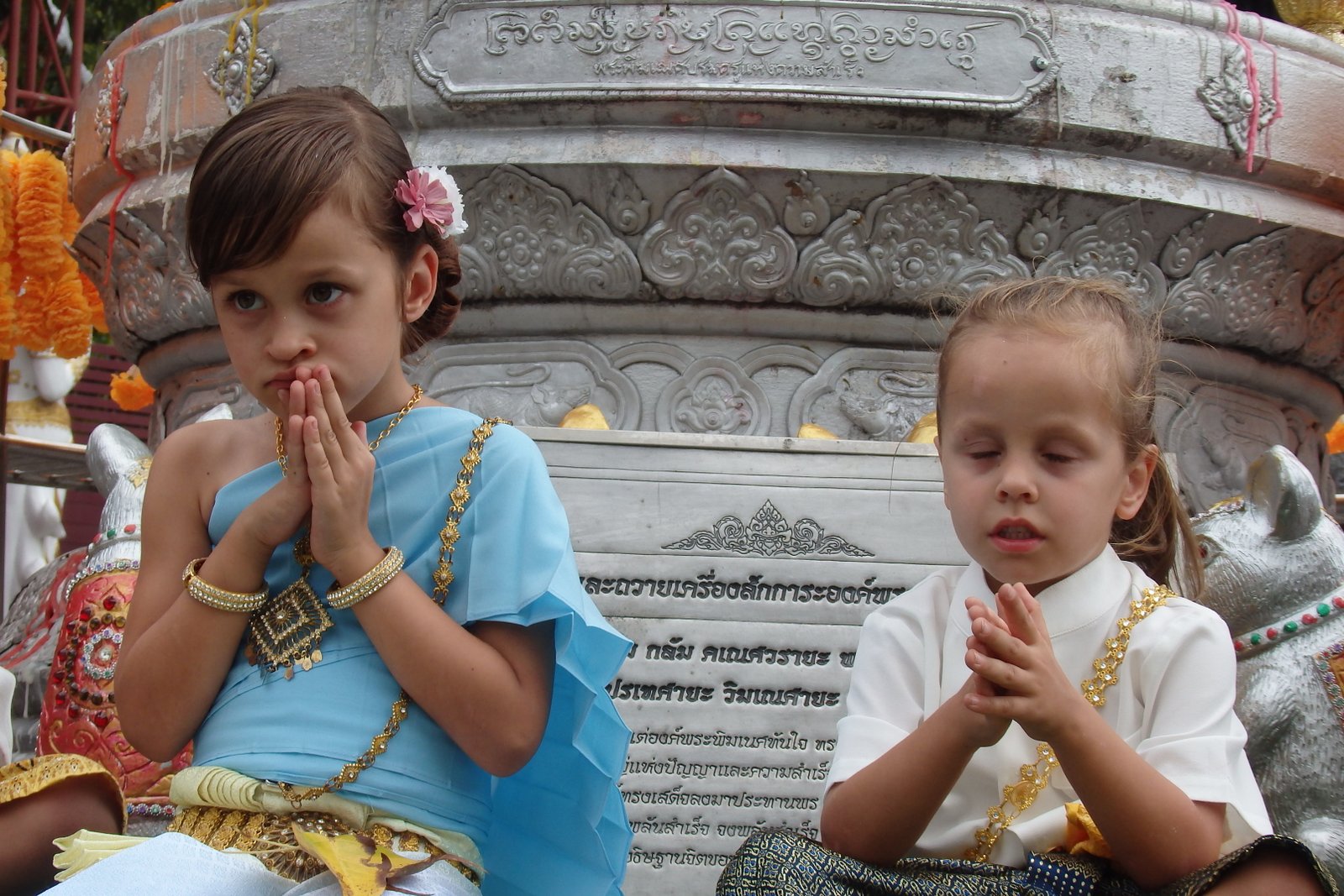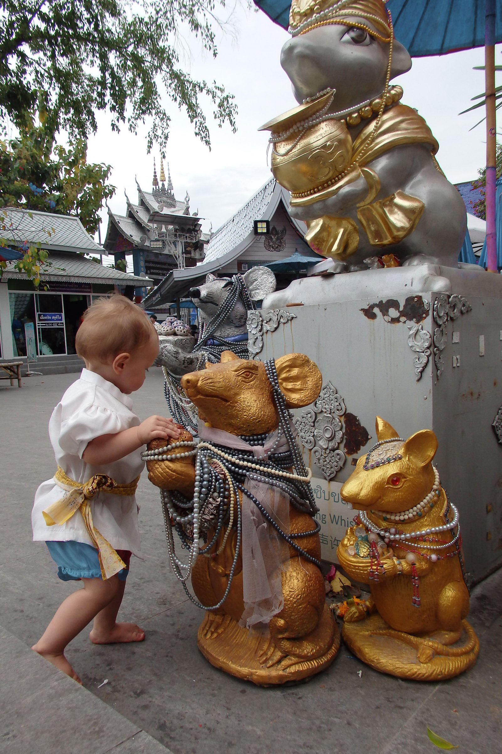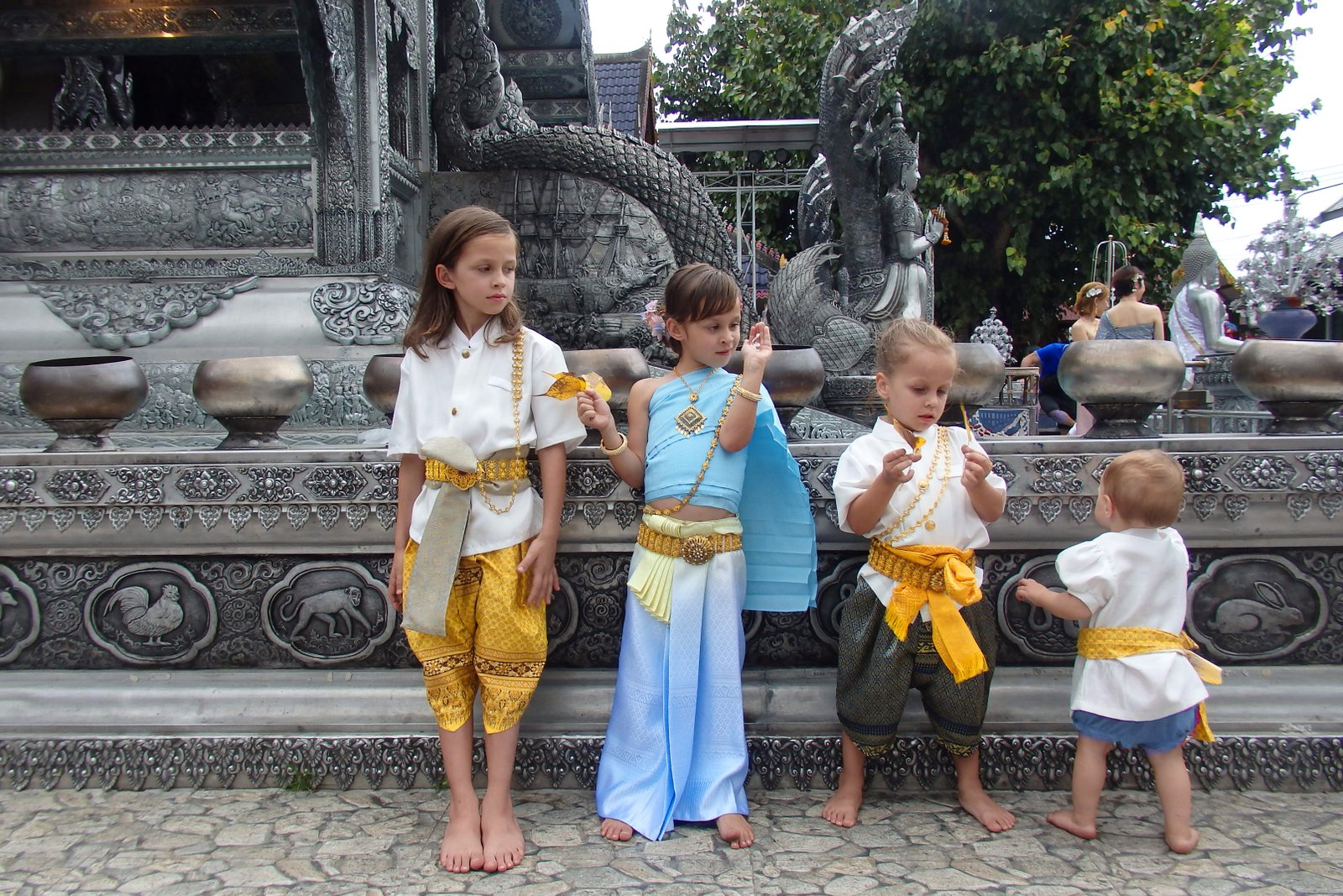 Warto jeszcze przypomnieć o drobnej niespójności władz sakralnych. Otóż, aby móc wejść ogólnie do świątyni trzeba być odpowiednio ubranym, kobiety muszą mieć m.in. zakryte ramiona, jeśli natomiast odwiedza się sakralny przybytek w tajskim stroju narodowym to ta zasada nie obowiązuje i można hasać z nagim lewym barkiem.