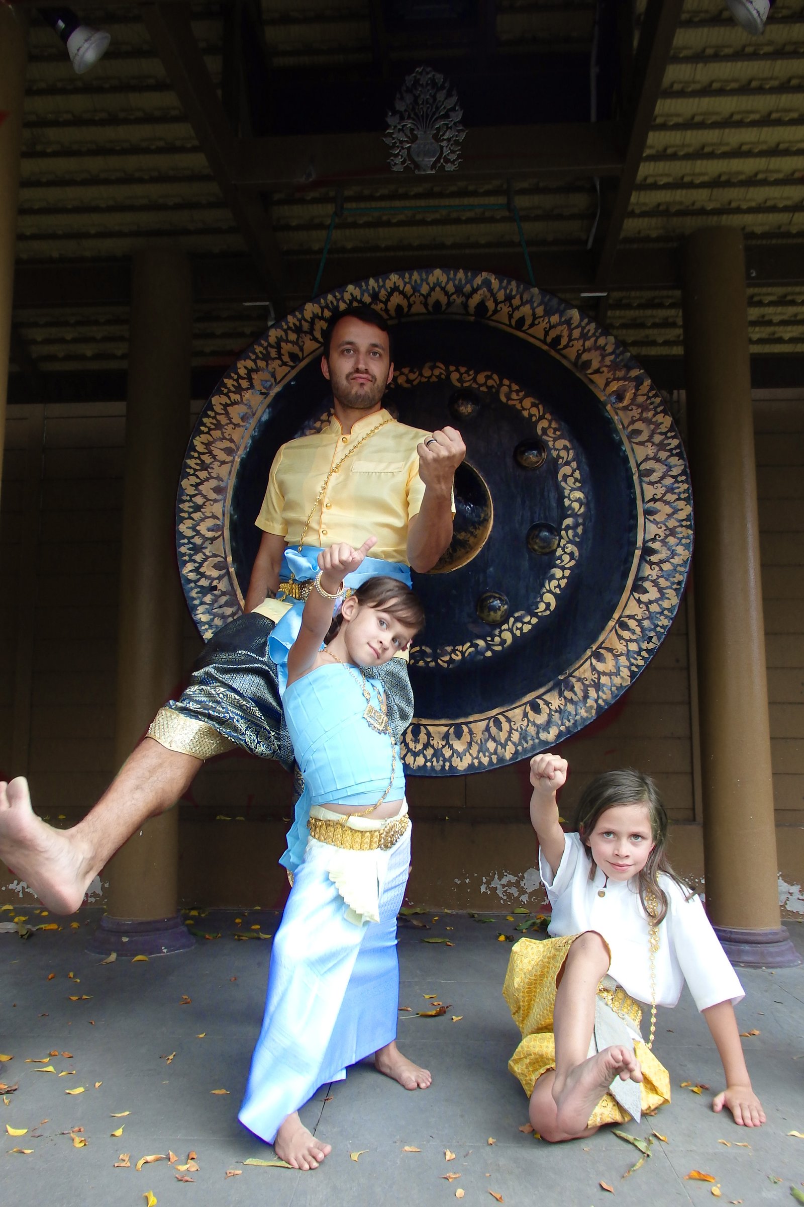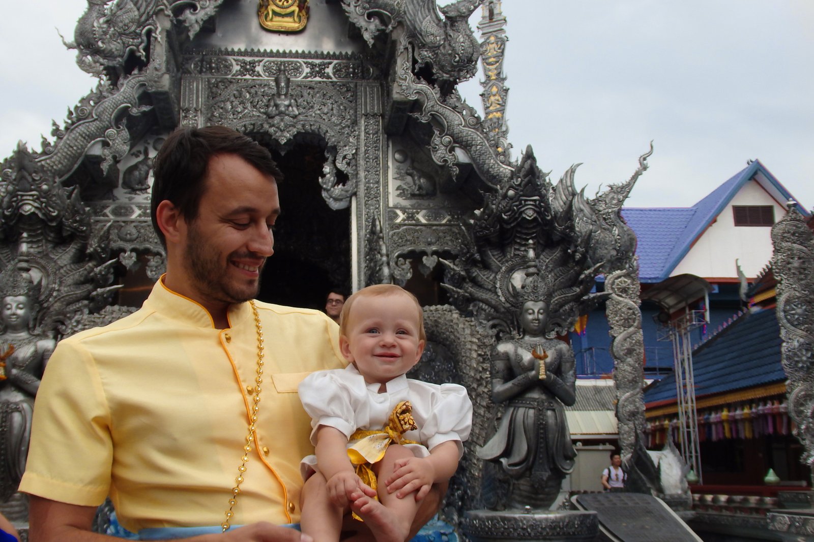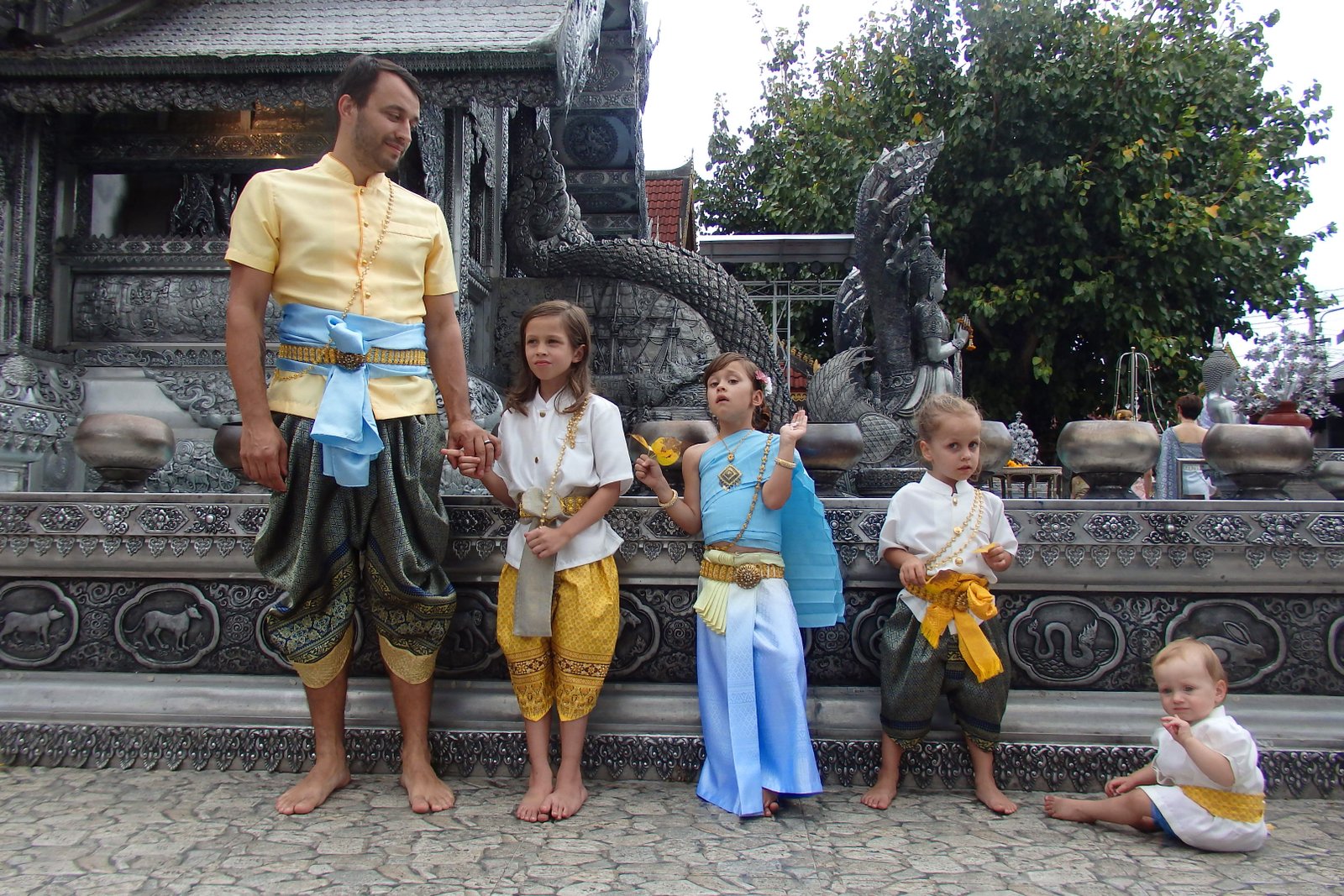 Spędziliśmy trochę czasu cykając sobie fotki z różnych kątów, udało nam się nawet znaleźć jakiegoś turystę, który miał ambicję być naszym tymczasowym fotografem – więc mamy kilka zdjęć wspólnych. Zastanawialiśmy się, czy Tamarze również brać jakiś strój, bo na wcześniejszym przebieraniu sobie smacznie spała, ale tym razem czas drzemki był za nami, więc dostała najmniejszą białą bluzkę i została przepasana szarfą (strój męski).